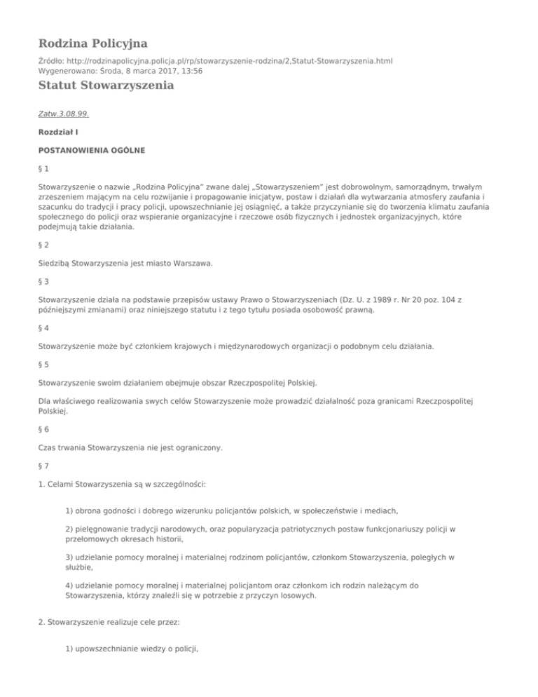 Rodzina Policyjna Źródło: http://rodzinapolicyjna.policja.pl/rp/stowarzyszenie-rodzina/2,Statut-Stowarzyszenia.html Wygenerowano: Środa, 8 marca 2017, 13:56 Statut Stowarzyszenia Zatw.3.08.99. Rozdział I POSTANOWIENIA OGÓLNE §1 Stowarzyszenie o nazwie „Rodzina Policyjna” zwane dalej „Stowarzyszeniem” jest dobrowolnym, samorządnym, trwałym zrzeszeniem mającym na celu rozwijanie i propagowanie inicjatyw, postaw i działań dla wytwarzania atmosfery zaufania i szacunku do tradycji i pracy policji, upowszechnianie jej osiągnięć, a także przyczynianie się do tworzenia klimatu zaufania społecznego do policji oraz wspieranie organizacyjne i rzeczowe osób fizycznych i jednostek organizacyjnych, które podejmują takie działania. §2 Siedzibą Stowarzyszenia jest miasto Warszawa. §3 Stowarzyszenie działa na podstawie przepisów ustawy Prawo o Stowarzyszeniach (Dz. U. z 1989 r. Nr 20 poz. 104 z późniejszymi zmianami) oraz niniejszego statutu i z tego tytułu posiada osobowość prawną. §4 Stowarzyszenie może być członkiem krajowych i międzynarodowych organizacji o podobnym celu działania. §5 Stowarzyszenie swoim działaniem obejmuje obszar Rzeczpospolitej Polskiej. Dla właściwego realizowania swych celów Stowarzyszenie może prowadzić działalność poza granicami Rzeczpospolitej Polskiej. §6 Czas trwania Stowarzyszenia nie jest ograniczony. §7 1. Celami Stowarzyszenia są w szczególności: 1) obrona godności i dobrego wizerunku policjantów polskich, w społeczeństwie i mediach, 2) pielęgnowanie tradycji narodowych, oraz popularyzacja patriotycznych postaw funkcjonariuszy policji w przełomowych okresach historii, 3) udzielanie pomocy moralnej i materialnej rodzinom policjantów, członkom Stowarzyszenia, poległych w służbie, 4) udzielanie pomocy moralnej i materialnej policjantom oraz członkom ich rodzin należącym do Stowarzyszenia, którzy znaleźli się w potrzebie z przyczyn losowych. 2. Stowarzyszenie realizuje cele przez: 1) upowszechnianie wiedzy o policji, 2) kształtowanie etyki społecznej i zawodowej policjantów i ich rodzin, 3) współdziałanie z władzami, instytucjami oraz organizacjami zainteresowanymi działalnością Stowarzyszenia, 4) gromadzenie funduszy na cele Stowarzyszenia, 5) otaczanie opieką najbliższej rodziny zmarłych funkcjonariuszy policji, 6) współdziałanie w prowadzeniu wszelkiego rodzaju społecznych instytucji policyjnych, 7) zakładanie i prowadzenie własnych instytucji lub przedsiębiorstw na rzecz rodzin policjantów, np. poradni, letnisk, domów starców, burs, domów dziecka i tp. 8) udzielanie członkom Stowarzyszenia bezpłatnych porad prawnych, 9) organizowanie życia kulturalnego i towarzyskiego policjantów i ich rodzin. §8 Stowarzyszenie, celem realizacji swych statutowych celów, może ustanowić pełnomocników Zarządu – merytorycznych i terenowych. §9 Realizując powyższe cele Stowarzyszenie opiera się na społecznej pracy członków. Może jednak zatrudniać pracowników do prowadzenia swych spraw. Stowarzyszenie może prowadzić działalność gospodarczą. § 10 1. Członkami zwyczajnymi Stowarzyszenia mogą być pozostający w służbie lub byli policjanci, jak również pełnoletni członkowie ich rodzin. 2. Osoby prawne mogą być Członkami wspierającymi. 3. Członkiem honorowym Stowarzyszenia może zostać osoba fizyczna, która jest w stanie przyczynić się lub przyczyni się w znacznym stopniu do rozwoju idei Stowarzyszenia. 1) Członek honorowy ma prawo uczestniczyć z głosem doradczym w działalności statutowej władz Stowarzyszenia. 2) Członkowie honorowi są zwolnieni z opłacania regularnych składek. § 11 Członkostwo zwyczajne Stowarzyszenia nabywa się przez przyjęcie kandydatury przez Zarząd zwykłą większością głosów w drodze uchwały. § 12 1. Członkowie Stowarzyszenia zobowiązani są: 1) swoją postawą i działaniami przyczynić się do wzrostu roli i znaczenia Stowarzyszenia, 2) dbać o jego dobre imię, 3) zabiegać o poprawę opinii społecznej i klimatu wokół środowiska policyjnego, 4) popierać i czynnie realizować cele Stowarzyszenia, 5) przestrzegać powszechnie obowiązujących przepisów prawa oraz postanowień statutu, 6) regularnie opłacać składki. 2. Członek zwyczajny Stowarzyszenia ma prawo brać udział w życiu Stowarzyszenia, w szczególności: 1) przysługuje mu bierne i czynne prawo wyborcze, 2) może wnioskować we wszystkich sprawach dotyczących celów i funkcjono-wania Stowarzyszenia, 3) korzystać z lokali Stowarzyszenia, 4) posiadać legitymację Stowarzyszenia i nosić odznaki Stowarzyszenia, 5) korzystać nieodpłatnie z urządzeń technicznych, poradnictwa i szkoleń, które Stowarzyszenie stawia do dyspozycji członków, 6) korzystać z innych możliwości, jakie stwarza swoim członkom Stowarzyszenie. § 13 1. Osoby prawne mogą zostać członkami wspierającymi przez złożenie oświadczenia woli Zarządowi Stowarzyszenia, które podejmuje w tej kwestii stosowną uchwałę. 2. W takim samym trybie następuje powstanie i ustanie członkostwa honorowego Stowarzyszenia. 3. Formę i rodzaj wspierania Stowarzyszenia członkowie wspierający ustalają z Zarządem Stowarzyszenia. 4. Członkowie honorowi i wspierający korzystają z praw przysługujących członkom zwyczajnym, wymienionych w par. 12 ust. 2 pkt. 2 – 6. § 14 1. Skreślenie z listy członków Stowarzyszenia następuje przez: 1) rezygnację pisemną złożoną na ręce Zarządu, 2) wykluczenie przez Zarząd a) za działalność sprzeczną ze statutem oraz uchwałami Stowarzyszenia, b) za nieusprawiedliwione nie branie udziału w pracach Stowarzyszenia, c) za zaleganie z opłatą składki członkowskiej przez trzy okresy, d) na pisemny umotywowany wniosek co najmniej 10 członków Stowarzyszenia e) z powodu utraty praw publicznych w wyniku orzeczenia sądu, f) śmierci członka. § 15 Od uchwały Zarządu w przedmiocie wykluczenia, członkowi przys