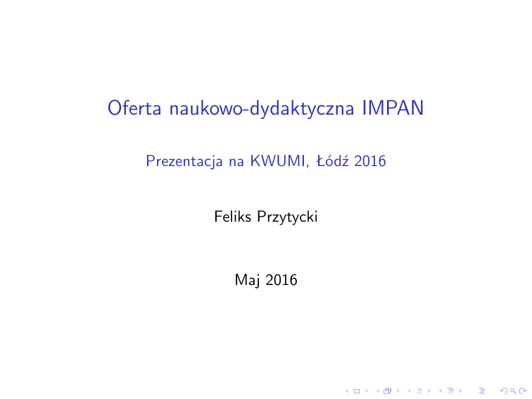 Oferta naukowo-dydaktyczna IMPAN Prezentacja na KWUMI, Łódź 2016 Feliks Przytycki Maj 2016 Misja IMPAN: praca badawcza na najwyższym poziomie, dla matematyków z różnych środowisk z Polski i z zagranicy, z różnych pokoleń, długoterminowa, kilkuletnia, staże. (Tworzenie zespołów. Mobilność.) Przedstawiȩ jak zorganizowana jest działalność IMPAN i jakie sa̧ możliwości odbycia w niej studiów doktoranckich, stażu, lub uzyskania stabilnego miejsca pracy. Plan: 1. Struktura tematyczna. 2. Konkursowy nabór pracowników naukowych. 3. Studia doktoranckie. Postdocy. Stażyści (WCNM) 4. Bieża̧ca działalność: seminaria, wykłady, szkoły, konferencje, grupy badawcze. 5. Centrum Banacha 6. Granty 7. WCNM 8. Program Simonsa 9. Infrastruktura (budynki, biblioteka) 1. Stan zatrudnienia na dzień 31.12.2015 r. Ogółem 189 w tym: pracownicy naukowi: 114 Ogółem ok. (w przeliczeniu na pełne etaty) 175 w tym: • pracownicy naukowi 104 w tym: • profesor zwyczajny 33 • profesor nadzwyczajny 12 • adiunkt 57 • asystent 2 Pracownicy naukowi zatrudnieni na pełnych etatach wg okresu zatrudnienia: 1. bezterminowo lub długoterminowo (ponad 2 lata): 55 2. okresowo: 41 Ge om .A lg. Fu nkc jon aln Bio a ma izy tem ka Ma aty t. I ka Ge om Po . R dst óż aw n. yM Ró ate wn m aty an ia ki Ró Sta żni ty s c zk ty k ow aM e ate ma tyc zna Te Te ori ori aL aP ic z raw b d. IM at. Fin . To po Uk log ład ia yD rac yn .A am na ic z lizy ne Nu Pra me c. r yc Prz z ne est j rze rac ni .G Hil eo b er t me a tr ii Nie prz em . Alg .i An aliz a Struktura zatrudnienia-zakłady i pracownie (grudzień 2015) 20 18 10 6 4 2 0 2 16 14 12 4 8 3 10 7 3 3 3 6 4 1 1 2 4 3 3 4 2 2 6 1 2 4 3 Asystenci Adiunkci Profesorowie nadzw Profesorowie zwycz 8 13 1 1 2 2 1 1 2 2. Konkursy: • Konkurs na okresowe stanowiska badawcze (adiunkt, prof. nadzwyczajny, prof. zwyczajny) 1/2-2 lata. Termin zgłoszeń: ok 20 lutego. Ok. 15 stanowisk. • Konkurs na 3-7 letnie stanowiska adiunkta i prof. nadzwyczajnego. Termin zgłoszeń: ok 20 lutego. Do ok. 4 stanowisk. • Konkurs dla postdoków: najdalej 3 lata po doktoracie. Stanowiska asystenta i adiunkta. Termin zgłoszeń: ok 20 maja. 8-10 stanowisk. • Konkurs KNOW: WCNM (IMPAN i MIMUW), roczne stanowiska dla postdoków, co 1/2 roku. Z możliwościa̧ przedłużenia o 1 rok. W IMPAN w ostatnim konkursie na rok. ak. 2016/2017 ok. 5 osób (konkurs ogólny i lokalny), razem z MIMUW ok. 15. • Konkursy na pojedyncze stanowiska, w szczególności z grantów. • Konkursy na pojedyncze stanowiska stałe dla profesorów nadzwyczajnych i zwyczajnych. • Wymiana i stanowiska wspólne z MIMUW, UWroc., UJ. 3. Studia doktoranckie, stażyści, postdocy: • Studia doktoranckie. Nabór wspólny z MIMUW (dla kandydatów lokalnych), obecnie wspólny z naborem WCNM. Nabór własny (kandydaci z zewna̧trz). W IMPAN jest teraz około 19 doktorantów, nie ma specjalnych kursów, jest opieka indywidualna i udział w seminariach. • Stażyści WCNM (PhD internships), 4 miesia̧ce (semestr), w obecnym konkursie na jesień i zimȩ przyjȩto ok. 10 osób, 4 w IMPAN. • Postdocy (IMPAN, w tym z WCNM), liczba dochodzi do 30, wiȩkszość z zagranicy: Włochy, Francja, UK, Portugalia, Czechy, USA, Kanada, Brazylia, Chiny, Indie, Iran, Ukraina, Rosja, ... . 4. Bieża̧ca działalność: seminaria, wykłady, szkoły, konferencje, grupy badawcze. Niektóre konwersatoria, seminaria i wykłady - Niekomutatywna Geometria, P. Hajac, T. Maszczyk; - Teoria operatorów liniowych w przestrzeniach Hilberta, Petru Cojuhari (AGH), Jan Janas, M. Ptak (URol); - Układy Dynamiczne, Y. Gutman, F. Przytycki, M. Rams; - Biologia Obliczeniowa, Ryszard Rudnicki, Jerzy Tiuryn (UW); - Równania różniczkowe cza̧stkowe, Zaja̧czkowski, P. Gwiazda, J. Rencławowicz, T. Cieślak; - Teoria grup, dynamika topologiczna, grupy soficzne i hiperliniowe, J. Gismatullin; - Procesy stochastyczne, T. Komorowski, Ł Stettner, S. Peszat, J. Zabczyk; - Kurs dla doktorantów – GGT, Piotr Nowak; - Analiza Funkcjonalna, M. Wojciechowski; - Analityczna teoria równań różniczkowych, G. Łysik, Galina Filipuk (UW), Sławomir Michalik (UKSW); - Teoria liczb, A. Schinzel; - Analiza harmoniczna i rozwiniȩcia ortogonalne, Jacek Dziubański (UWr), Adam Nowak, Krzysztof Stempak (PWroc.), dr Maciej Paluszyński (UWr); - Geometria i równania różniczkowe, B. Jakubczyk, Paweł Nurowski, W. Kryński; - Logiczne Podstawy Arytmetyki, Z. Adamowicz, Leszek Kołodziejczyk (UW), Konrad Zdanowski (UKSW); - Geometria różniczkowa (WaGaRy) Metody Geometryczne Fizyki, Janusz Grabowski, B. Jakubczyk, Marek Kuś (CFT PAN), P. Urbański (UW), Katarzyna Grabowska (KMMF UW), Javier de Lucas (KMMF UW); - Statystyka matematyczna i inne zastosowania probabilistyczne, Marek Mȩczarski (SGH), Piotr Jaworski (UW), Tomasz Rychlik; - Seminarium z Geometrycznej Teorii Grup, Tadeusz Januszkiewicz, Piotr Nowak, Ł Garncarek; - Grupa Robocza z Zastosowań Teorii Mnogości, Piotr Koszmider; - Biomatematyka, prof. dr hab. Ryszard Rudnicki; - Topologia, Stanisław Spież, Danuta Kołodziejczyk; - Geometria i Topologia Osobliwoci, Z. Jelonek, Ch. Eyral; - Geometryczna Teoria Funkcji i Przekształceń,Tomasz Adamowicz; - Teoria Aproksymacji, Anna Kamont, Tomasz Szarek; - Ogólnopolskie Seminarium z Analizy, F. Przytycki, Y. Tomilov, P. Wojtaszczyk, M. Wojciechowski; - The Algebra and Geometry of Modern Physics, Karol Palka, Piotr Sułkowski (IFT WFUW), R. Suszek (KMMF WFUW); - Statystyka Asymptotyczna, T. Inglot (PWr), T. Ledwina; - IMPANGA (IM PAN Geometria Algebraiczna), P. Pragacz, A. Langer - Metody Matematyki Finansowej, Łukasz Stettner - Fale grawitacyjne, Andrzej Królak; - Young Researchers Colloquium, P. Achinger, T. Cieślak, P. Miłoś (MiM UW); - Seminarium Centrum Zastosowań Matematyki, Ł Stettner. 5. Centrum Banacha • W Bȩdlewie odbywa siȩ rocznie około 30-40 konferencji/warsztatów/szkół, • Wsparcie finansowe Centrum Banacha, po 