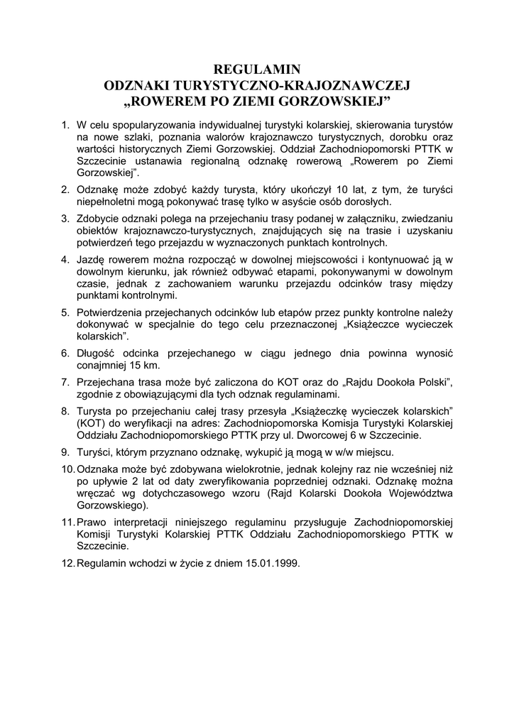REGULAMIN ODZNAKI TURYSTYCZNO-KRAJOZNAWCZEJ „ROWEREM PO ZIEMI GORZOWSKIEJ” 1. W celu spopularyzowania indywidualnej turystyki kolarskiej, skierowania turystów na nowe szlaki, poznania walorów krajoznawczo turystycznych, dorobku oraz wartości historycznych Ziemi Gorzowskiej. Oddział Zachodniopomorski PTTK w Szczecinie ustanawia regionalną odznakę rowerową „Rowerem po Ziemi Gorzowskiej”. 2. Odznakę może zdobyć każdy turysta, który ukończył 10 lat, z tym, że turyści niepełnoletni mogą pokonywać trasę tylko w asyście osób dorosłych. 3. Zdobycie odznaki polega na przejechaniu trasy podanej w załączniku, zwiedzaniu obiektów krajoznawczo-turystycznych, znajdujących się na trasie i uzyskaniu potwierdzeń tego przejazdu w wyznaczonych punktach kontrolnych. 4. Jazdę rowerem można rozpocząć w dowolnej miejscowości i kontynuować ją w dowolnym kierunku, jak również odbywać etapami, pokonywanymi w dowolnym czasie, jednak z zachowaniem warunku przejazdu odcinków trasy między punktami kontrolnymi. 5. Potwierdzenia przejechanych odcinków lub etapów przez punkty kontrolne należy dokonywać w specjalnie do tego celu przeznaczonej „Książeczce wycieczek kolarskich”. 6. Długość odcinka przejechanego w ciągu jednego dnia powinna wynosić conajmniej 15 km. 7. Przejechana trasa może być zaliczona do KOT oraz do „Rajdu Dookoła Polski”, zgodnie z obowiązującymi dla tych odznak regulaminami. 8. Turysta po przejechaniu całej trasy przesyła „Książeczkę wycieczek kolarskich” (KOT) do weryfikacji na adres: Zachodniopomorska Komisja Turystyki Kolarskiej Oddziału Zachodniopomorskiego PTTK przy ul. Dworcowej 6 w Szczecinie. 9. Turyści, którym przyznano odznakę, wykupić ją mogą w w/w miejscu. 10. Odznaka może być zdobywana wielokrotnie, jednak kolejny raz nie wcześniej niż po upływie 2 lat od daty zweryfikowania poprzedniej odznaki. Odznakę można wręczać wg dotychczasowego wzoru (Rajd Kolarski Dookoła Województwa Gorzowskiego). 11. Prawo interpretacji niniejszego regulaminu przysługuje Zachodniopomorskiej Komisji Turystyki Kolarskiej PTTK Oddziału Zachodniopomorskiego PTTK w Szczecinie. 12. Regulamin wchodzi w życie z dniem 15.01.1999. ZAŁĄCZNIK DO REGULAMINU ODZNAKI ROWEROWEJ „ROWEREM PO ZIEMI GORZOWSKIEJ” Cyfry umieszczone między nazwami oznaczają odległości w kilometrach atlasu samochodowego Polski. Miejscowości napisane dużymi literami są punktami kontrolnymi, w których należy uzyskać potwierdzenie pobytu (odcinek pieczątki z nazwą miejscowości). Choszczno 11 PIASECZNIK 23 RECZ POMORSKI 15 Święciechów 5 DRAWNO 6 Niemieńsko 15 GŁUSKO 4 Stare Osieczno 15 DOBIEGNIEW 19 Drezdenko 15 SOWIA GÓRA 13 Międzychód 4 GORZYŃ 3 Kamionna 7 Mnichy 8 ŁOWYŃ 7 LEWICE 18 TRZCIEL 7 Borowy Młyn 7 PSZCZEW 15 Wierzbno 8 PRZYTOCZNA 3 Gliszczyki 3 ROKITNO 6 Kalsko 8 MIĘDZYRZECZ 9 Kaława 3 Gościkowo 25 Łagów 5 JEMIOŁÓW 5 SULĘCIN 10 Lubień 6 OŚNO LUB. 4 Połęcko 8 RZEPIN 20 SŁUBICE 18 Górzyca 14 SŁOŃSK 15 Kostrzyn 11 NAMYŚLIN 7 Chwarszczany 7 Boleszkowice 4 WYSOKA 6 Dębno Lub. 8 SMOLNICA 9 Otanów 5 SITNO 11 Lipiany 18 BARLINEK 13 PEŁCZYCE 20 CHOSZCZNO (meta rajdu). Łączna długość trasy 547 km. Należy potwierdzić 29 miejscowości. Opracowali: Kazimierz Mańkowski „Jantarowe Szlaki”, Grzegorz Żegliński „Jantarowe Szlaki” Powodzenia na trasie!