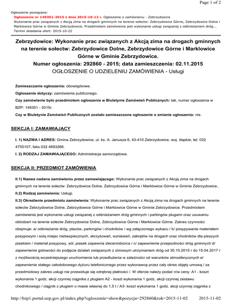 Page 1 of 2 Ogłoszenie powiązane: Ogłoszenie nr 149351-2015 z dnia 2015-10-13 r. Ogłoszenie o zamówieniu - Zebrzydowice Wykonanie prac związanych z Akcją zima na drogach gminnych na terenie sołectw: Zebrzydowice Górne, Zebrzydowice Dolne i Marklowice Górne w Gminie Zebrzydowice. Przedmiotem zamówienia jest wykonanie usługi związanej z odśnieżaniem dróg... Termin składania ofert: 2015-10-22 Zebrzydowice: Wykonanie prac związanych z Akcją zima na drogach gminnych na terenie sołectw: Zebrzydowice Dolne, Zebrzydowice Górne i Marklowice Górne w Gminie Zebrzydowice. Numer ogłoszenia: 292860 - 2015; data zamieszczenia: 02.11.2015 OGŁOSZENIE O UDZIELENIU ZAMÓWIENIA - Usługi Zamieszczanie ogłoszenia: obowiązkowe. Ogłoszenie dotyczy: zamówienia publicznego. Czy zamówienie było przedmiotem ogłoszenia w Biuletynie Zamówień Publicznych: tak, numer ogłoszenia w BZP: 149351 - 2015r. Czy w Biuletynie Zamówień Publicznych zostało zamieszczone ogłoszenie o zmianie ogłoszenia: nie. SEKCJA I: ZAMAWIAJĄCY I. 1) NAZWA I ADRES: Gmina Zebrzydowice, ul. ks. A. Janusza 6, 43-410 Zebrzydowice, woj. śląskie, tel. 032 4755107, faks 032 4693266. I. 2) RODZAJ ZAMAWIAJĄCEGO: Administracja samorządowa. SEKCJA II: PRZEDMIOT ZAMÓWIENIA II.1) Nazwa nadana zamówieniu przez zamawiającego: Wykonanie prac związanych z Akcją zima na drogach gminnych na terenie sołectw: Zebrzydowice Dolne, Zebrzydowice Górne i Marklowice Górne w Gminie Zebrzydowice.. II.2) Rodzaj zamówienia: Usługi. II.3) Określenie przedmiotu zamówienia: Wykonanie prac związanych z Akcją zima na drogach gminnych na terenie sołectw Zebrzydowice Dolne, Zebrzydowice Górne i Marklowice Górne w Gminie Zebrzydowice. Przedmiotem zamówienia jest wykonanie usługi związanej z odśnieżaniem dróg gminnych i parkingów pługami oraz usuwaniu oblodzeń na terenie sołectw Zebrzydowice Dolne, Zebrzydowice Górne i Marklowice Górne. Zakres czynności obejmuje: a/ odśnieżanie dróg, placów, parkingów i chodników / wg załączonego wykazu / b/ posypywanie materiałem posypowym i solą miejsc niebezpiecznych, skrzyżowań, wzniesień, zakrętów na drogach oraz chodników dla pieszych piaskiem / materiał posypowy, sól, piasek zapewnia zleceniobiorca / c/ zapewnienie przejezdności dróg gminnych d/ zapewnienie gotowości do podjęcia działań związanych z zimowym utrzymaniem dróg od 30.10.2015 r do 15.04.2017 r z możliwością wcześniejszego uruchomienia lub przedłużenia w zależności od warunków atmosferycznych e/ zapewnienie stałego całodobowego dyżuru telefonicznego przez wykonawcę przez cały okres objęty umową / za przedmiotowy zakres usługi nie przewiduje się odrębnej płatności /. W ofercie należy podać n/w ceny: A1 - koszt wykonania 1 godz. akcji czynnej ciągnika z pługiem A2 - koszt wykonania 1 godz. akcji czynnej zestawu chodnikowego / ciągnik z pługiem o masie własnej do 1,5 t / A3- koszt wykonania 1 godz. akcji czynnej ciągnika z http://bzp1.portal.uzp.gov.pl/index.php?ogloszenie=show&pozycja=292860&rok=2015-11-02 2015-11-02 Page 2 of 2 rozrzutnikem - koszt wykonania 1 godz. pracy ciągnika z rozrzutnikiem z solą - koszt wykonania 1 godz. pracy koparkoładowarki - koszt wykonania 1 godz. pracy ładowarki - koszt wykonania 1 godz. pracy samochodu ciężarowego z pługiem - koszt pracy ręcznego posypywania chodników piaskiem. Zamawiający zastrzega sobie prawo montażu urządzeń GPS na sprzęcie wykonawcy dla potrzeb monitoringu i kontroli. Wykonawca winien zapewnić w przypadku intensywnych opadów śniegu wymagających prowadzenia akcji w sposób ciągły rezerwowej obsady kadrowej kierowców sprzętu do kontynuowania akcji. Wykonawca winien posiadać sprzęt w ilości adekwatnej do specyfiki zadania w minimalnej ilości: - ciągnik z pługiem w ilości min. 5 sztuk w tym co najmniej 2 szt ciągników czteronapędowych o mocy min. 70 KM - posypywarka / rozrzutnik / w ilości 3 sztuk - zestaw chodnikowy / ciągnik z pługiem o masie własnej do 1,5 t / - ponadto w przypadku wystąpienia intensywnych opadów śniegu wykonawca winien zapewnić możliwość dysponowania sprzętem ciężkim własnym lub wynajętym, uruchamianym na polecenie zamawiającego w ilości 5 szt łącznie / np. samochód ciężarowy z pługiem, koparko- ładowarka, ładowarka / Wykonawca powinien podać ceny pracy w/w sprzętu w poz. 3 oferty wykonawcy a także zestawu chodnikowego ciągnika z pługiem do odśnieżania chodników o masie własnej nie przekraczającej 1,5 t.. II.4) Wspólny Słownik Zamówień (CPV): 90.21.20.00-6, 90.21.30.00-3. SEKCJA III: PROCEDURA III.1) TRYB UDZIELENIA ZAMÓWIENIA: Przetarg nieograniczony III.2) INFORMACJE ADMINISTRACYJNE Zamówienie dotyczy projektu/programu finansowanego ze środków Unii Europejskiej: nie SEKCJA IV: UDZIELENIE ZAMÓWIENIA IV.1) DATA UDZIELENIA ZAMÓWIENIA: 02.11.2015. IV.2) LICZBA OTRZYMANYCH OFERT: 3. IV.3) LICZBA ODRZUCONYCH OFERT: 0. IV.4) NAZWA I ADRES WYKONAWCY, KTÓREMU UDZIELONO ZAMÓWIENIA: PPHU WAMIX Michał Wawrzyczek, ul. Ks. a. Janusza 59, 43-410 Zebrzydowice, kraj/woj. śląskie. IV.5) Szacunkowa wartość zamówienia (bez VAT): 185185,19 PLN. IV.6) INFORMACJA O CENIE WYBRANEJ OFERTY ORAZ O OFERTACH Z NAJNIŻSZĄ I NAJWYŻSZĄ CENĄ Cena wybranej oferty: 185185,19 Oferta z najniższą ceną: 185185,19 / Oferta z najwyższą ceną: 185185,19 Waluta: PLN . http://bzp1.portal.uzp.gov.pl/index.php?ogloszenie=show&pozycja=292860&rok=2015-11-02 2015-11-02