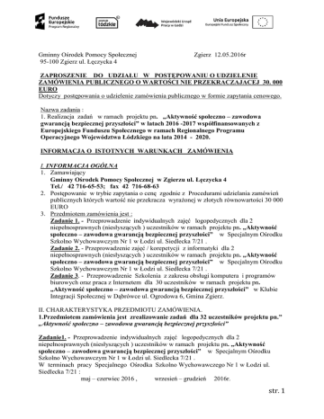 Gminny Ośrodek Pomocy Społecznej 95-100 Zgierz ul. Łęczycka 4 Zgierz 12.05.2016r ZAPROSZENIE DO UDZIAŁU W POSTĘPOWANIU O UDZIELENIE ZAMÓWIENIA PUBLICZNEGO O WARTOŚCI NIE PRZEKRACZAJACEJ 30. 000 EURO Dotyczy postępowania o udzielenie zamówienia publicznego w formie zapytania cenowego. Nazwa zadania : 1. Realizacja zadań w ramach projektu pn. „Aktywność społeczno – zawodowa gwarancją bezpiecznej przyszłości” w latach 2016 -2017 współfinansowanych z Europejskiego Funduszu Społecznego w ramach Regionalnego Programu Operacyjnego Województwa Łódzkiego na lata 2014 - 2020. INFORMACJA O ISTOTNYCH WARUNKACH ZAMÓWIENIA I. INFORMACJA OGÓLNA 1. Zamawiający Gminny Ośrodek Pomocy Społecznej w Zgierzu ul. Łęczycka 4 Tel./ 42 716-65-53; fax 42 716-68-63 2. Postępowanie w trybie zapytania o cenę zgodnie z Procedurami udzielania zamówień publicznych których wartość nie przekracza wyrażonej w złotych równowartości 30 000 EURO 3. Przedmiotem zamówienia jest : Zadanie 1. - Przeprowadzenie indywidualnych zajęć logopedycznych dla 2 niepełnosprawnych (niesłyszących ) uczestników w ramach projektu pn. „Aktywność społeczno – zawodowa gwarancją bezpiecznej przyszłości” w Specjalnym Ośrodku Szkolno Wychowawczym Nr 1 w Łodzi ul. Siedlecka 7/21 . Zadanie 2. - Przeprowadzenie zajęć / korepetycji z informatyki dla 2 niepełnosprawnych (niesłyszących ) uczestników w ramach projektu pn. „Aktywność społeczno – zawodowa gwarancją bezpiecznej przyszłości” w Specjalnym Ośrodku Szkolno Wychowawczym Nr 1 w Łodzi ul. Siedlecka 7/21 . Zadanie 3. - Przeprowadzenie Szkolenia z zakresu obsługi komputera i programów biurowych oraz praca z Internetem dla 30 uczestników w ramach projektu pn. „Aktywność społeczno – zawodowa gwarancją bezpiecznej przyszłości” w Klubie Integracji Społecznej w Dąbrówce ul. Ogrodowa 6, Gmina Zgierz. II. CHARAKTERYSTYKA PRZEDMIOTU ZAMÓWIENIA. 1.Przedmiotem zamówienia jest zrealizowanie zadań dla 32 uczestników projektu pn.” „Aktywność społeczno – zawodowa gwarancją bezpiecznej przyszłości” Zadanie1. - Przeprowadzenie indywidualnych zajęć logopedycznych dla 2 niepełnosprawnych (niesłyszących ) uczestników w ramach projektu pn. „Aktywność społeczno – zawodowa gwarancją bezpiecznej przyszłości” w Specjalnym Ośrodku Szkolno Wychowawczym Nr 1 w Łodzi ul. Siedlecka 7/21 . W terminach pracy Specjalnego Ośrodka Szkolno Wychowawczego Nr 1 w Łodzi ul. Siedlecka 7/21 : maj – czerwiec 2016 , wrzesień – grudzień 2016r. str. 1 styczeń – czerwiec 2017r , wrzesień – październik 2017r. po 128 godzin zajęć dla każdego uczestnika projektu, łącznie 256 godzin zajęć logopedycznych prowadzonych w Specjalnym Ośrodku szkolno Wychowawczym w Łodzi ul. Siedlecka 7/21, w godzinach poza obowiązkowymi zajęciami lekcyjnymi. Wymagania : a) wykształcenie wyższe specjalizacja z surdologopedii , b) zgoda Dyrektora SOSW Nr 1 w Łodzi na korzystanie z pomieszczeń i znajdującego się w nim sprzętu do prowadzenia zajęć, c) znajomość języka migowego, d)doświadczenia zawodowe min. 5 lat pracy z osobami niesłyszącymi, Zadanie 2. - Przeprowadzenie zajęć / korepetycji z informatyki dla 2 niepełnosprawnych (niesłyszących ) uczestników w ramach projektu pn. „Aktywność społeczno – zawodowa gwarancją bezpiecznej przyszłości” w Specjalnym Ośrodku Szkolno Wychowawczym Nr 1 w Łodzi ul. Siedlecka 7/21 . Zajęcia w formie korepetycji z informatyki dla 2 niepełnosprawnych (niesłyszących ) uczestników projektu w wymiarze 2- 4 godzin tygodniowo przez 16 m-cy po 128 godzin dla każdej osoby, łącznie 256 godzin zajęć/ korepetycji w okresie : maj – czerwiec 2016r, wrzesień – grudzień 2016r, styczeń – czerwiec 2017r , wrzesień – październik 2017r . Zajęcia /korepetycje z informatyki prowadzone w siedzibie Specjalnego Ośrodka Szkolno Wychowawczego w Łodzi ul. Siedlecka 7/21, w godzinach poza obowiązkowymi zajęciami lekcyjnymi. Wymagania : a) wykształcenie wyższe informatyczne, specjalizacja z surdopedagogiki , b) zgoda Dyrektora SOSW Nr 1 w Łodzi na korzystanie z pomieszczeń i znajdującego się w nim sprzętu do prowadzenia zajęć, c) znajomość języka migowego, d) doświadczenia zawodowe min. 5 lat pracy z osobami niesłyszącymi, Zadanie 3. Przeprowadzenie Szkolenia z zakresu obsługi komputera i programów biurowych oraz praca z Internetem dla 30 uczestników w ramach projektu pn. „Aktywność społeczno – zawodowa gwarancją bezpiecznej przyszłości” w Klubie Integracji Społecznej w Dąbrówce ul. Ogrodowa 6, Gmina Zgierz. Szkolenie z zakresu obsługi komputera i programów biurowych oraz praca z Internetem dla 30 uczestników projektu prowadzone w 3 grupach po 10 osób każda grupa, 80 godzin Szkolenia dla każdej grupy w ciągu 14 dni .Łącznie 240 godzin Szkolenia dla trzech grup uczestników projektu w ciągu 42 dni roboczych, w okresie VII-VIII 2016r . Szkolenie prowadzone w siedzibie Zamawiającego w Klubie Integracji Społecznej w Dąbrówce Sowice ul., Ogrodowa 6, Gmina Zgierz . Wymagania – wykształcenie wyższe magisterskie/licencjackie informatyczne - doświadczenie w prowadzeniu szkoleń z zakresu informatyki min. 2 szkolenia. III . SPOSÓB PRZYGOTOWANIA OFERTY 1.Oferta i oświadczenie Oferenta powinny być podpisane przez oferenta. 2.Ofertę (skan) należy przesłać drogą elektroniczną na adres [email protected] lub złożyć w wersji papierowej w siedzibie Ośrodka z oznaczeniem– „Projekt pn.” „Aktywność społeczno – zawodowa gwarancją bezpiecznej przyszłości” zadanie nr …” str. 2 3. Oferta powinna być sporządzona w języku polskim pismem czytelnym oraz podpisana przez oferenta. 4. Cena ofertowa za jedną godzinę Szkolenia / korepetycji winna być wypisana cyframi w złotych polskich i potwierdzona słownie. 5. Każdy Oferent może złożyć w niniejszym postępowaniu tylko jedną