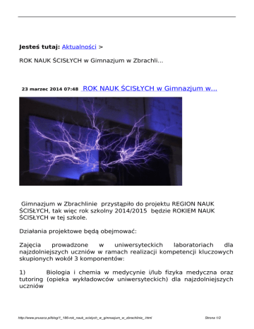 Jesteś tutaj: Aktualności > ROK NAUK ŚCISŁYCH w Gimnazjum w Zbrachli... 23 marzec 2014 07:48 ROK NAUK ŚCISŁYCH w Gimnazjum w... Gimnazjum w Zbrachlinie przystąpiło do projektu REGION NAUK ŚCISŁYCH, tak więc rok szkolny 2014/2015 będzie ROKIEM NAUK ŚCISŁYCH w tej szkole. Działania projektowe będą obejmować: Zajęcia prowadzone w uniwersyteckich laboratoriach dla najzdolniejszych uczniów w ramach realizacji kompetencji kluczowych skupionych wokół 3 komponentów: 1) Biologia i chemia w medycynie i/lub fizyka medyczna oraz tutoring (opieka wykładowców uniwersyteckich) dla najzdolniejszych uczniów http://www.pruszcz.pl/blog/1_186-rok_nauk_scislych_w_gimnazjum_w_zbrachlinie_.html Strona 1/2 2) Fizyka (w tym w j. ang.) z elementami meteorologii (zajęcia warsztatowe w terenie i/lub tutoring) 3) Matematyka z elementami ekonomii Zajęcia dla uczniów, którzy chcą osiągać lepsze niż do tej pory wyniki w naukach ścisłych, skupione wokół 3 komponentów interdyscyplinarnych: 1) Geografia turystyczna Unii Europejskiej, język angielski przewodnikiem po Europie 2) Arytmetyka z elementami logiki 3) Przyroda (biologia, chemia i fizyka) Uczniowie biorący udział w projekcie będą mogli wziąć udział w warsztatach zdrowego odżywiania i promocji zdrowego stylu życia oraz w zajęciach z doradcą zawodowym i psychologiem. W planach także integracyjny wyjazd naukowy. ASZ drukuj Wróć http://www.pruszcz.pl/blog/1_186-rok_nauk_scislych_w_gimnazjum_w_zbrachlinie_.html Powered by TCPDF (www.tcpdf.org) Strona 2/2
