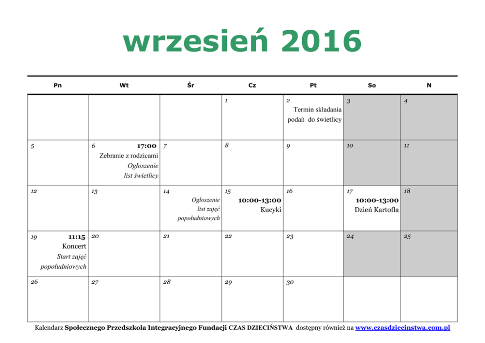 wrzesień 2016 Pn Wt Śr Cz 1 Pt 2 So N 3 4 Termin składania podań do świetlicy 5 6 12 13 17:00 7 Zebranie z rodzicami Ogłoszenie list świetlicy 14 8 9 10 11 15 16 17 18 10:00-13:00 Kucyki Ogłoszenie list zajęć popołudniowych 10:00-13:00 Dzień Kartofla 19 11:15 20 Koncert Start zajęć popołudniowych 21 22 23 26 27 28 29 30 24 25 Kalendarz Społecznego Przedszkola Integracyjnego Fundacji CZAS DZIECIŃSTWA dostępny również na www.czasdziecinstwa.com.pl