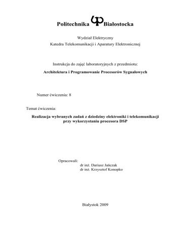 Politechnika Białostocka Wydział Elektryczny Katedra Telekomunikacji i Aparatury Elektronicznej Instrukcja do zajęć laboratoryjnych z przedmiotu: Architektura i Programowanie Procesorów Sygnałowych Numer ćwiczenia: 8 Temat ćwiczenia: Realizacja wybranych zadań z dziedziny elektroniki i telekomunikacji przy wykorzystaniu procesora DSP Opracowali: dr inż. Dariusz Jańczak dr inż. Krzysztof Konopko Białystok 2009 Architektura i Programowanie Procesorów Sygnałowych Temat: Realizacja wybranych zadań z dziedziny elektroniki i telekomunikacji przy wykorzystaniu procesora DSP 1. Cel ćwiczenia Celem ćwiczenia jest zapoznanie z zasadami współpracy procesora sygnałowego z układami wejścia/wyjścia oraz zasadami współpracy z przetwornikami A/C i C/A. Ćwiczenie przeprowadzane jest na module DSK TMS320C6711 w oparciu o dostępne w module przetworniki oraz o współpracującą z DSK kartę TMDX326040A. W ramach zajęć realizowane są wybrane zadania z dziedziny elektroniki i telekomunikacji przy wykorzystaniu procesora DSP. 2. Zagadnienie do opracowania przed przystąpieniem do zajęć Przed przystąpieniem do zajęć należy opracować następujące zagadnienia: ♦ typowy układ przetwarzania sygnałów ciągłych metodami DSP ♦ zasady współpracy procesora DSP z przetwornikami A/C i C/A, ♦ wykorzystanie timera i systemu przerwań w zadaniach przetwarzania sygnałów, ♦ współpracy karty TMDX326040A kodeka audio PCM 3003 z DSK. 3. Przebieg ćwiczenia 3.1 Filtracja sygnałów z wykorzystaniem filtrów SOI i NOI a) Napisać i uruchomić program realizujący filtry NOI lub SOI o parametrach zadanych przez prowadzącego. b) Zdjąć jego charakterystyki amplitudowe dla zakresu częstotliwości od 0 do fd oraz zarejestrować odpowiedź impulsową. Porównać otrzymane charakterystyki z wyznaczonymi teoretycznie. Badania eksperymentalne należy przeprowadzić w układzie połączonym według schematu przedstawionego na Rys. 1. moduł DSK JTAG DSP A/C oscyloskop C/A We Wy Y1 Y2 generator Wy Rys. 1. Schemat połączeń stanowiska laboratoryjnego DSP do badania procedur przetwarzania sygnałów Realizacja przykładowego filtru NOI: Przykładowy filtr czwartego rzędu w formie kaskadowej, można opisać transmitancją: b01 + b11 z −1 + b21 z −2 b02 + b12 z −1 + b22 z −2 H ( z) = * 1 − a11 z −1 − a21 z −2 1 − a12 z −1 − a22 z −2 Przykładową transmitancję można zrealizować zgodnie ze strukturą: x(n) d1(n) + b01 + y1(n) d2(n) + z -1 + + + a12 z -1 a21 + b12 + z -1 b11 a11 b02 z -1 b21 a22 b22 Rys. 2 Filtr NOI czwartego rzędu w formie kaskadowej Filtr ten jest opisany przez następujące równania: d1 (n) = x(n) + a11 *d1 (n-1) + a21 *d1 (n-2) y1 (n) = b01 *d1 (n) + b11 *d1 (n-1) + b21 *d1 (n-2) d2 (n) = y1 (n) + a12 *d2 (n-1) + a22 *d2 (n-2) y (n) = b02 *d2 (n) + b12 *d2 (n-1) + b22 *d2 (n-2) y(n) Program należy skonstruować tak, aby obliczał kolejno podane wyżej równania (konieczne jest zdefiniowanie zmiennych d1(n), d1(n-1), d1(n-2), d2(n), d2(n-1), d2(n-2) przechowujących w pamięci stany wyjść układów opóźniających). 3.2 Realizacja wybranych zadań z dziedziny elektroniki i telekomunikacji. a) Napisać i uruchomić program realizujący funkcje zadane przez prowadzącego (przetwarzanie sygnałów mowy, kodek, filtr adaptacyjny i inne). b) Zdjąć odpowiednie przebiegi charakteryzujące realizowane funkcje. Porównać otrzymane charakterystyki z teoretycznymi. 4. Sprawozdanie powinno zawierać: - kody źródłowe wraz z opisem, - wyniki działania procedur, - analizę kodów źródłowych stosowanych procedur, - uwagi i wnioski nasuwające się w trakcie wykonywania ćwiczenia. 5. Wymagania BHP W trakcie realizacji programu ćwiczenia należy przestrzegać zasad omówionych we wstępie do ćwiczeń, zawartych w: „Regulaminie porządkowym w laboratorium” oraz w „Instrukcji obsługi urządzeń elektronicznych znajdujących się w laboratorium z uwzględnieniem przepisów BHP”. Regulamin i instrukcja są dostępne w pomieszczeniu laboratoryjnym w widocznym miejscu. 6. Literatura 1. Dąbrowski A. (red.) „Przetwarzanie Sygnałów Przy użyciu Procesorów Sygnałowych”, Wyd. Politechniki Poznańskiej, Poznań 2000 2. Kehtarnavaz, N., “Real-Time Digital Signal Processing: Based on the TMS320C6000”, Newnes, 2005 3. “TMS320C6000 CPU and Instruction Set Reference Guide”, Texas Instruments, 2001 4. “TMS320C6000 Peripherals Reference Guide”, Texas Instruments, 2001 5. “TMS320C6000 Programmer's Guide”, Texas Instruments, 2001