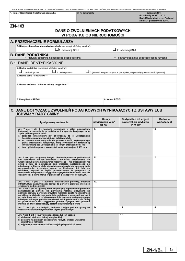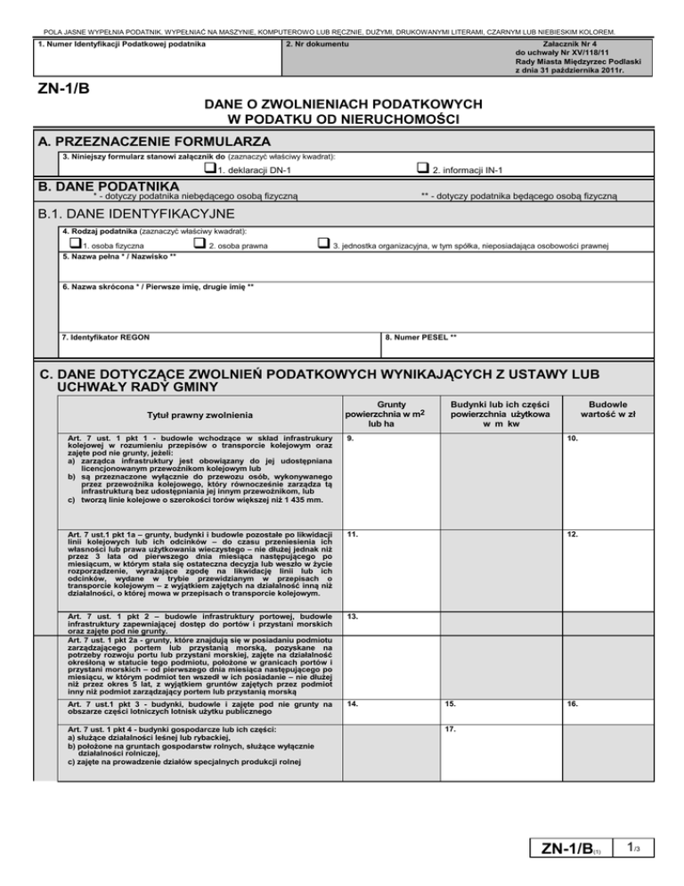 POLA JASNE WYPEŁNIA PODATNIK. WYPEŁNIAĆ NA MASZYNIE, KOMPUTEROWO LUB RĘCZNIE, DUŻYMI, DRUKOWANYMI LITERAMI, CZARNYM LUB NIEBIESKIM KOLOREM. 1. Numer Identyfikacji Podatkowej podatnika 2. Nr dokumentu Załacznik Nr 4 do uchwały Nr XV/118/11 Rady Miasta Międzyrzec Podlaski z dnia 31 października 2011r. ZN-1/B DANE O ZWOLNIENIACH PODATKOWYCH W PODATKU OD NIERUCHOMOŚCI A. PRZEZNACZENIE FORMULARZA 3. Niniejszy formularz stanowi załącznik do (zaznaczyć właściwy kwadrat): 1. deklaracji DN-1 2. informacji IN-1 B. DANE PODATNIKA * - dotyczy podatnika niebędącego osobą fizyczną ** - dotyczy podatnika będącego osobą fizyczną B.1. DANE IDENTYFIKACYJNE 4. Rodzaj podatnika (zaznaczyć właściwy kwadrat): 1. osoba fizyczna 5. Nazwa pełna * / Nazwisko ** 2. osoba prawna 3. jednostka organizacyjna, w tym spółka, nieposiadająca osobowości prawnej 6. Nazwa skrócona * / Pierwsze imię, drugie imię ** 7. Identyfikator REGON 8. Numer PESEL ** C. DANE DOTYCZĄCE ZWOLNIEŃ PODATKOWYCH WYNIKAJĄCYCH Z USTAWY LUB UCHWAŁY RADY GMINY Tytuł prawny zwolnienia Grunty powierzchnia w m2 lub ha Budynki lub ich części powierzchnia użytkowa w m kw Budowle wartość w zł Art. 7 ust. 1 pkt 1 - budowle wchodzące w skład infrastrukury kolejowej w rozumieniu przepisów o transporcie kolejowym oraz zajęte pod nie grunty, jeżeli: a) zarządca infrastruktury jest obowiązany do jej udostępniana licencjonowanym przewoźnikom kolejowym lub b) są przeznaczone wyłącznie do przewozu osób, wykonywanego przez przewoźnika kolejowego, który równocześnie zarządza tą infrastrukturą bez udostępniania jej innym przewoźnikom, lub c) tworzą linie kolejowe o szerokości torów większej niż 1 435 mm. 9. 10. Art. 7 ust.1 pkt 1a – grunty, budynki i budowle pozostałe po likwidacji linii kolejowych lub ich odcinków – do czasu przeniesienia ich własności lub prawa użytkowania wieczystego – nie dłużej jednak niż przez 3 lata od pierwszego dnia miesiąca następującego po miesiącum, w którym stała się ostateczna decyzja lub weszło w życie rozporządzenie, wyrażające zgodę na likwidację linii lub ich odcinków, wydane w trybie przewidzianym w przepisach o transporcie kolejowym – z wyjątkiem zajętych na działalność inną niż działalności, o której mowa w przepisach o transporcie kolejowym. 11. 12. Art. 7 ust. 1 pkt 2 – budowle infrastruktury portowej, budowle infrastruktury zapewniającej dostęp do portów i przystani morskich oraz zajęte pod nie grunty. Art. 7 ust. 1 pkt 2a - grunty, które znajdują się w posiadaniu podmiotu zarządzającego portem lub przystanią morską, pozyskane na potrzeby rozwoju portu lub przystani morskiej, zajęte na działalność okreśłoną w statucie tego podmiotu, położone w granicach portów i przystani morskich – od pierwszego dnia miesiąca następującego po miesiącu, w którym podmiot ten wszedł w ich posiadanie – nie dłużej niż przez okres 5 lat, z wyjątkiem gruntów zajętych przez podmiot inny niż podmiot zarządzający portem lub przystanią morską 13. Art. 7 ust.1 pkt 3 - budynki, budowle i zajęte pod nie grunty na obszarze części lotniczych lotnisk użytku publicznego 14. Art. 7 ust. 1 pkt 4 - budynki gospodarcze lub ich części: a) służące działalności leśnej lub rybackiej, b) położone na gruntach gospodarstw rolnych, służące wyłącznie działalności rolniczej, c) zajęte na prowadzenie działów specjalnych produkcji rolnej 15. 16. 17. ZN-1/B (1) 1/3 POLA JASNE WYPEŁNIA PODATNIK. WYPEŁNIAĆ NA MASZYNIE, KOMPUTEROWO LUB RĘCZNIE, DUŻYMI, DRUKOWANYMI LITERAMI, CZARNYM LUB NIEBIESKIM KOLOREM. Art. 7 ust.1 pkt 5 - nieruchomości lub ich części zajęte na potrzeby prowadzenia przez stowarzyszenia statutowej działalności wśród dzieci i młodzieży w zakresie oświaty, wychowania, nauki i techniki, kultury fizycznej i sportu, z wyjątkiem wykorzystywanych do prowadzenia działalności gospodarczej, oraz grunty zajęte trwale na obozowiska i bazy wypoczynkowe dzieci i młodzieży 18. 19. Art. 7 ust. 1 pkt 6 - grunty i budynki wpisane indywidualnie do rejestru zabytków, pod warunkiem ich utrzymania i konserwacji, zgodnie z przepisami o ochronie zabytków, z wyjątkiem części zajętych na prowadzenie działalności gospodarczej 20. 21. Art. 7 ust. 1 pkt 7 - grunty i budynki we władaniu muzeów rejestrowanych 22. 23. Art. 7 ust. 1 pkt 8 - grunty położone na obszarach objętych ochroną ścisłą, 24. czynną lub krajobrazową, a także budynki i budowle trwale związane z gruntem, służące bezpośrednio osiąganiu celów z zakresu ochrony przyrody - w parkach narodowych oraz w rezerwatach przyrody 25. Art. 7 ust. 1 pkt 8a - będące własnością Skarbu Państwa: grunty pokryte wodami jezior o ciągłym dopływie lub odpływie wód powierzchniowych oraz grunty zajęte pod sztuczne zbiorniki wodne 27. Art.7 ust.1 pkt 9 - budowle wałów ochronnych, grunty pod wałami ochronnymi i położone w międzywalach, z wyjątkiem zajętych na prowadzenie działalności gospodarczej przez inne podmioty niż spółki wodne, ich związki oraz związki wałowe 28. 26. 29. Art.7 ust.1 pkt 10 - grunty stanowiące nieużytki, użytki ekologiczne, grunty 30. zadrzewione i zakrzewione, z wyjątkiem zajętych na prowadzenie działalności gospodarczej Art.7 ust.1 pkt 11 - grunty stanowiące działki przyzagrodowe członków 31. rolniczych spółdzielni produkcyjnych, którzy spełniają jeden z warunków: a) osiągnęli wiek emerytalny, b) są inwalidami zaliczonymi do I albo II grupy, c) są niepełnosprawnymi o znacznym lub umiarkowanym stopniu niepełnosprawności, d) są osobami całkowicie niezdolnymi do pracy w gospodarstwie rolnym albo niezdolnymi do samodzielnej egzystencji Art.7 ust.1 pkt 12 - budynki położone na terenie rodzinnych ogrodów działkowych, nieprzekraczające norm powierzchni ustalonych w przepisach Prawa budowlanego dla altan i obiektów gospodarczych, z wyjątkiem zajęty
