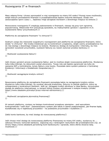 Kraków, baza firm, oferty pracy, branża IT :: KrakowIT.pl Rozwiązania IT w finansach Masz własną firmę i chcesz wprowadzić w niej rozwiązania na miarę XXI wieku? Poznaj nowe możliwości, dzięki którym prowadzenie finansów w przedsiębiorstwie będzie znacznie łatwiejsze. Dzięki nim zaoszczędzisz sporo czasu i... będziesz mógł zarządzać biznesem z dowolnego miejsca na świecie. Nowoczesne rozwiązania IT znajdują zastosowanie w finansach, ciesząc się przy tym ogromną popularnością. Właściciele firm poszukują sposobów, by maksymalnie uprościć i usprawnić m.in. wystawianie faktur przychodowych. Platforma do zarządzania finansami "w chmurze" Godnym uwagi (bo niezwykle wygodnym) rozwiązaniem jest platforma do zarządzania finansami, która działa "w chmurze". Nie trzeba instalować jej na konkretnym urządzeniu, dzięki czemu przedsiębiorca ma do niej dostęp z dowolnego miejsca na świecie. Wystarczy dostęp do komputera i internetu, by móc sprawdzić wysokość przychodów, wystawić fakturę czy nawet wykonać przelew bankowy. - Możliwość wystawiania faktur Jeśli chcesz uprościć proces wystawiania faktur, jest to możliwe dzięki nowoczesnej platformie. Wystarczy tylko kilka kliknięć, by dokument został utworzony. Twoja rola zaś będzie ograniczać się tylko do wpisania NIP-u kontrahenta, tytułu faktury oraz kwoty. Pozostałe dane system pobierze z Centralnej Ewidencji i Informacji o Działalności Gospodarczej. - Możliwość zaciągnięcia kredytu online Nowoczesne platformy do zarządzania finansami pozwalają także na zaciągnięcie kredytu online. Wystarczy tylko kilka kliknięć, by uzyskać decyzję kredytową. Dotyczy to jednak platform, które są zintegrowane z konkretnym bankiem. Jeśli np. zaciągasz kredyt obrotowy w Idea Banku, otrzymujesz dostęp do platformy internetowej, w ramach której możesz wnioskować o kolejne kredyty (źródło: https://www.ideabank.pl/kredyt-przez-internet-obrotomierz). - Możliwość zarządzania płynnością finansową W ramach platformy, możesz na bieżąco kontrolować przepływy pieniężne - pod warunkiem funkcjonalności "cash flow". Zaawansowany system jest także w stanie podpowiedzieć, jak finanse będą kształtowały się w najbliższej przyszłości - na podstawie przychodów i wydatków. Załóż konto bankowe, by mieć dostęp do nowoczesnej platformy Jeśli chcesz mieć dostęp do nowoczesnej platformy finansowej na miarę XXI wieku, wystarczy że ... założysz firmowy rachunek bankowy. Zapoznaj się z rankingiem rachunków dla przedsiębiorców (np. ze strony https://www.ideabank.pl/ranking-kont-bankowych) i sprawdź, która oferta stwarza taką możliwość. http://www.krakowit.pl Kreator PDF Utworzono 8 March, 2017, 12:57