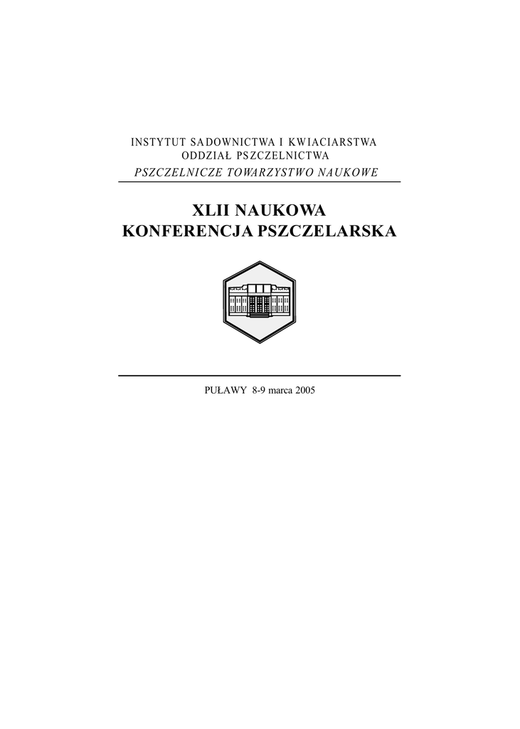 INSTYTUT SA DOWNICTWA I KW IACIARSTWA ODDZIA£ PS ZCZELNICTWA PSZCZELNICZE TOWARZYST WO NAUKOWE XLII NAUKOWA KONFERENCJA PSZCZELARSKA ISTE TERRARUM MIHI OMNES ANGULUS RIDET PU£AWY 8-9 marca 2005 INDEKS AUTORÓW Aretyns’ka T.B. – 3 Jagie³³o Ryszard – 146 Arkhypov A.O. – 3, 33 Jasiñski Zygmunt – 28, 30 Bakier S³awomir – 136, 138, 140 Jendreják Rudolf – 76 Balzekas Jonas – 62 Jojczyk Agata – 28 B¹k Beata – 28, 60 Kaba³a-Dzik Agata – 160 Bieñkowska Ma³gorzata – 21, 25, 65 Kamler František – 38 Blaþytë-Èereðkienë Laima – 16 Kania Artur – 30 Bogdanov G. – 55, 142 Katysheva Olga – 131 Bondarchuk L.I. – 55 Kazimierczak Jerzy –69 Borisov Vadim – 131 Kêdzia Bogdan – 144, 156 Borsuk Grzegorz – 34, 146 Klepacz-Baniak Joanna – 99 Bo¿ek Ma³gorzata – 91, 92 Kokta O.D. – 85 Brajczewska Beata – 44 Kolbina Lidia – 39, 100 Bratkowski Janusz – 22, 28, 36, 56 Ko³towski Zbigniew – 102, 103 Buczek Krzsztof – 72, 73 Komissar Alexander – 14, 40 Èeksterytë Violeta – 37 Konarska Agata – 95, 105, 122 Chmielewski Wit – 132 Kopernický Ján – 42 Chorbiñski Pawe³ – 4, 23, 68, 89 Korpysa Gra¿yna – 43 Chuda-Mickiewicz Bo¿ena – 28, 69 Kotsjumbas I.J. – 55 Chwil Miros³awa – 93, 95 Kravetsky L.J. – 33, 84 Ciowch Agnieszka – 146 Krieg Pavel – 133 Czekoñska Krystyna – 71, 99 Krivtsova L.S. – 26 Denisow B. – 96, 97 Krzy¿añska Katarzyna – 78 Dmitruk Marta – 121 Kwiatkowski Stanis³aw – 106, 108, 121 Dronik G. – 142 Kyuryishkin Mihckail – 100 Gerula Dariusz – 21, 65 Labaèiauskas Jonas – 37 Giejdasz Karol – 134 Levchenko Ivan – 6, 8 Gliñski Zdzis³aw – 72, 73 Lipiec Antoni – 146 Gontarz Aldona – 25 Lipiñski Zbigniew – 6 Grankin N.N. – 26 Loc Krzysztof – 25 Grzebalska Agnieszka – 153 Lokutova O. – 110, 142 Hajnos Micha³ – 106 Londzin Wies³aw – 79, 80 Hoffman Marian – 50, 52 Luft-Deptu³a Dorota – 72, 73 Ho³derna-Kêdzia El¿bieta – 144 Lutsenko Yriy – 8 Hoñko Stanis³aw – 75 Madras Beata – 28 Huras Bogumi³a – 69 Marzec Janina – 57 Irzyk Maria – 79, 80 Masierowska Marzena – 105 Ivchenko V. – 6 Medvedeva Anna – 131 Mikhailov A. – 142 Sokó³ Rajmund – 87 Mitrowska Kamila – 148 Stawiarz Ernest – 150 Motoshkova Natalia – 100 Stojko Artur – 158, 160 Musyenko O.V. – 86 Stojko Jerzy – 160 Najda Agnieszka – 106, 108 Strza³kowska Monika – 116, 119 Nepeivoda Sofia – 39, 100 Sulborska Aneta – 118 Neumann Peter – 22 Szczêsna Teresa – 149, 152 Niedzielska Jolanta – 148 Szklanowska Kazimiera –119 Olszewski Krzysztof – 10 Szkoda Józef – 153 Paleolog Jerzy – 10, 34 Szymula Jerzy – 21, 31, 65 Pa³ach Ryszard S. – 43 Teper Dariusz – 110, 154 Panasiuk Beata – 21, 65 Tlusta Yulia P. – 3 Pêkala Leszek – 138 Tlusty Anatoliy – 16 Piech Katarzyna – 134 Tofilski Adam – 32 Piletskaya Irina – 81 Tomaszewska Barbara – 4, 23, 68, 89 Piotrowska Krystyna – 111, 113 Trikoz V.O. – 3 Pliszczyñski Mariusz – 72, 73 Tsigankov N. – 142 Pohorecka Krystyna – 65, 83 Vorobiy O.A. – 84 Polaczek Benedikt – 134 Weryszko-Chmielewska El¿bieta – 95,105,121, 122 Polishuk V. – 110 Wieloch Grzegorz – 50, 52 Popoviè Ivan – 115 Wieniarska Justyna – 92 Postoenko V.O. – 84, 85 Wiêckowska Joanna – 12 Posyniak Andrzej – 148 Wilde Jerzy – 17, 22, 28, 36, 56, 60 Prabucki Jaros³aw – 28, 69 Wilde Maria – 17 Raèys Jurgis – 37 Wilkaniec Zdzis³aw – 134 Rogoziñski Tomasz – 50, 52 Witkiewicz Wies³aw – 46 Roman Adam – 12, 44 W³odarczyk Marek – 4, 23, 68, 89 Romaniuk Konstanty – 46 Wolski Tadeusz – 106, 108, 121 Rudenko E.V. – 86 Woyke Jerzy – 17, 28 Rybak-Chmielewska Helena – 149, 152 Wójcik Joanna – 144 Rzepecka Anna – 160 Wróblewska Anna – 123 Samborski Jerzy – 28, 69 Wrzesieñ M. – 96 Schricker Burkhard – 134 Yefimenko Tatiana M. – 3, 19 Semkiw Piotr – 48 Zorina Marina – 100 Shumakova Irina – 14 Zvinchuk I.O. – 85 Sieben Stefan – 134 ¯mudzki Jan – 148, 153 Siuda Maciej – 28, 36, 56, 60 ¯uraw Beata – 125, 126, 127, 128 Skirkevièius Algirdas – 16 Skowronek Wojciech – 48 Skubida Piotr – 48 BEE BIOLOGY - BIOLOGIA THE EFFECT OF EXTRACTS FROM ANTHERAEAE PERNYI PUPPAE ON THE HONEY BEE, Apis mellifera A.O. Arkhipov 1 , T a tiana M. Y ef i menko 1 , Y ul i a P. Tl ust a 1 , T .B. Aret yns’ ka 2 , V .O . Tr i koz 2 1 2 Petro Prokopovych Apiculture Institute (Kyiv, Ukraine). National University of Agriculture (Kyiv, Ukraine). The authors investigated the effect of the Antheraeae pernyi puppae extract on the honey bee, Apis mellifera, the extract having been proposed as a drug (Tr o k o z et al. Patent of Ukraine ¹ 16965; 1997) possessing rather marked adaptogene properties for many animals (Tr o k o z et al. 2003). In our laboratory we studied optimal concentrations to be fed to healthy honey bees and the extract effect on these insects artificially infected by a microsporidian, Nosema apis. We have also investigated the effect of optimal extract concentration in natural conditions, these experiments having been carried out with bee colonies inhabited in hives with natural levels of invasive and infective diseases. In laboratory conditions the extract was fed together with sugar syrup (50%), in field experiments with the candy. Three drug concentrations were studied – 0.5, 0.1, and 0 0.01%. In laboratory experiments with bees preliminary infected by the N. apis, the insects were fed by this parasite spores (103 spores/per bee). Control bees were without infection and without extract introduction. Our laboratory experiments were carried out with flying bees taken preliminary to cages and maintained in a thermostat, the temperature and humidity conditions being the optimal. The insects were observed on the every second day. The death factors were determined by microscopic analysis of dead insects. In field conditions the bee colonies were fou