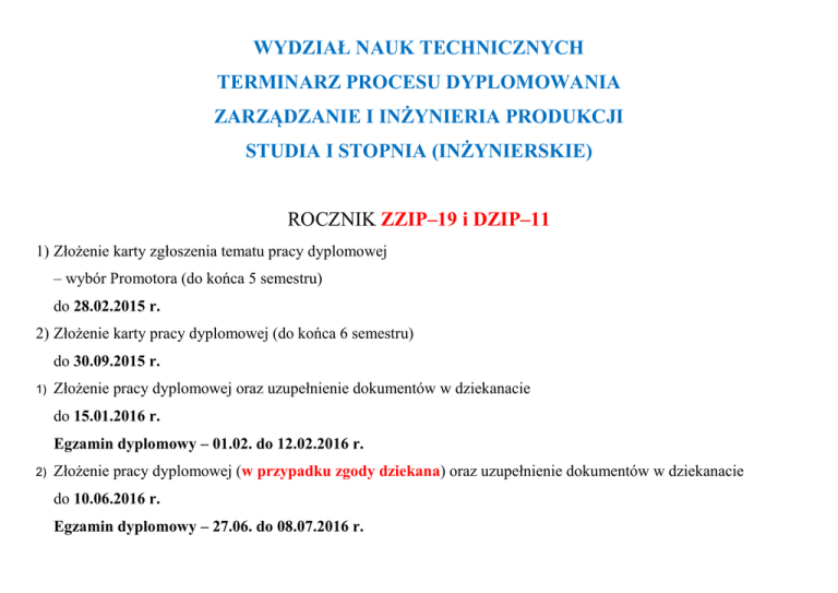 WYDZIAŁ NAUK TECHNICZNYCH TERMINARZ PROCESU DYPLOMOWANIA ZARZĄDZANIE I INŻYNIERIA PRODUKCJI STUDIA I STOPNIA (INŻYNIERSKIE) ROCZNIK ZZIP–19 i DZIP–11 1) Złożenie karty zgłoszenia tematu pracy dyplomowej – wybór Promotora (do końca 5 semestru) do 28.02.2015 r. 2) Złożenie karty pracy dyplomowej (do końca 6 semestru) do 30.09.2015 r. 1) Złożenie pracy dyplomowej oraz uzupełnienie dokumentów w dziekanacie do 15.01.2016 r. Egzamin dyplomowy – 01.02. do 12.02.2016 r. 2) Złożenie pracy dyplomowej (w przypadku zgody dziekana) oraz uzupełnienie dokumentów w dziekanacie do 10.06.2016 r. Egzamin dyplomowy – 27.06. do 08.07.2016 r. ROCZNIK ZZIP–20 1) Złożenie karty zgłoszenia tematu pracy dyplomowej – wybór Promotora (do końca 5 semestru) do 30.09.2015 r. 2) Złożenie karty pracy dyplomowej (do końca 6 semestru) do 28.02.2016 r. 3) Złożenie pracy dyplomowej oraz uzupełnienie dokumentów w dziekanacie do 10.06.2016 r. Egzamin dyplomowy – 27.06. do 08.07.2016 r. 4) Złożenie pracy dyplomowej oraz uzupełnienie dokumentów w dziekanacie do 09.09.2016 r. Egzamin dyplomowy – 26.09. do 30.09.2016 r. 5) Złożenie pracy dyplomowej (w przypadku zgody dziekana) oraz uzupełnienie dokumentów w dziekanacie do 13.01.2017 r. Egzamin dyplomowy – 30.01. do 10.02.2017 r. ROCZNIK ZZIP–21 i DZIP-12 1) Złożenie karty zgłoszenia tematu pracy dyplomowej – wybór Promotora (do końca 5 semestru) do 28.02.2016 r. 2) Złożenie karty pracy dyplomowej (do końca 6 semestru) do 30.09.2016 r. 3) Złożenie pracy dyplomowej oraz uzupełnienie dokumentów w dziekanacie do 13.01.2017 r. Egzamin dyplomowy – 30.01. do 10.02.2017 r. 4) Złożenie pracy dyplomowej (w przypadku zgody dziekana) oraz uzupełnienie dokumentów w dziekanacie do 09.06.2017 r. Egzamin dyplomowy – 26.06. do 07.07.2017 r. ROCZNIK ZZIP–22 6) Złożenie karty zgłoszenia tematu pracy dyplomowej – wybór Promotora (do końca 5 semestru) do 30.09.2016 r. 7) Złożenie karty pracy dyplomowej (do końca 6 semestru) do 28.02.2017 r. 8) Złożenie pracy dyplomowej oraz uzupełnienie dokumentów w dziekanacie do 09.06.2017 r. Egzamin dyplomowy – 26.06. do 07.07.2017 r. 9) Złożenie pracy dyplomowej oraz uzupełnienie dokumentów w dziekanacie do 08.09.2017 r. Egzamin dyplomowy – 25.09. do 29.09.2017 r. 10) Złożenie pracy dyplomowej (w przypadku zgody dziekana) oraz uzupełnienie dokumentów w dziekanacie do 12.01.2018 r. Egzamin dyplomowy – 29.01. do 09.02.2018 r. KARTY ZGŁOSZENIA TEMATU PRACY DYPLOMOWEJ NALEŻY SKŁADAĆ TYLKO I WYŁĄCZNIE DO MGR INŻ. PAULINY BINKIEWICZ czwartek 8.00 – 14.00 BA 8, L012 piątek 8.00 – 14.00 BA 8, L012 Uwaga! Wpisanie studenta na listę dyplomantów danego promotora, następuję tylko na podstawie złożenia karty zgłoszenia tematu pracy do mgr inż. Pauliny Binkiewicz - decyduje kolejność złożenia kart! Data podpisania karty przez promotora nie jest brana pod uwagę przy wpisywaniu na listę dyplomantów i nie gwarantuje wpisania na listę.