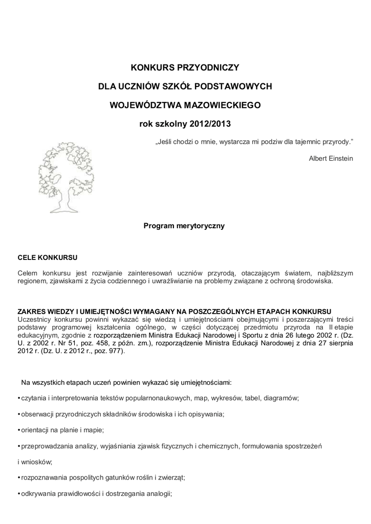 KONKURS PRZYODNICZY DLA UCZNIÓW SZKÓŁ PODSTAWOWYCH WOJEWÓDZTWA MAZOWIECKIEGO rok szkolny 2012/2013 „Jeśli chodzi o mnie, wystarcza mi podziw dla tajemnic przyrody.” Albert Einstein Program merytoryczny CELE KONKURSU Celem konkursu jest rozwijanie zainteresowań uczniów przyrodą, otaczającym światem, najbliższym regionem, zjawiskami z życia codziennego i uwrażliwianie na problemy związane z ochroną środowiska. ZAKRES WIEDZY I UMIEJĘTNOŚCI WYMAGANY NA POSZCZEGÓLNYCH ETAPACH KONKURSU Uczestnicy konkursu powinni wykazać się wiedzą i umiejętnościami obejmującymi i poszerzającymi treści podstawy programowej kształcenia ogólnego, w części dotyczącej przedmiotu przyroda na II etapie edukacyjnym, zgodnie z rozporządzeniem Ministra Edukacji Narodowej i Sportu z dnia 26 lutego 2002 r. (Dz. U. z 2002 r. Nr 51, poz. 458, z późn. zm.), rozporządzenie Ministra Edukacji Narodowej z dnia 27 sierpnia 2012 r. (Dz. U. z 2012 r., poz. 977). Na wszystkich etapach uczeń powinien wykazać się umiejętnościami: • czytania i interpretowania tekstów popularnonaukowych, map, wykresów, tabel, diagramów; • obserwacji przyrodniczych składników środowiska i ich opisywania; • orientacji na planie i mapie; • przeprowadzania analizy, wyjaśniania zjawisk fizycznych i chemicznych, formułowania spostrzeżeń i wniosków; • rozpoznawania pospolitych gatunków roślin i zwierząt; • odkrywania prawidłowości i dostrzegania analogii; • stosowania pojęć do rozwiązywania problemów; • wykorzystania wiedzy o charakterze naukowym do identyfikowania i rozwiązywania problemów oraz formułowania wniosków. I etap – szkolny 1. Budowa komórki roślinnej i zwierzęcej – funkcje podstawowych składników. 2. Czynności życiowe organizmów: odżywianie (samożywność, cudzożywność), oddychanie, rozmnażanie, ruch, wzrost i rozwój, reakcje na bodźce, wydalanie (podstawowe informacje). 3. Budowa i funkcjonowanie organizmu człowieka: oddechowy, pokarmowy, rozrodczy – podstawowe narządy i ich funkcje. Etapy rozwoju człowieka, zmiany zachodzące w organizmie podczas dojrzewania płciowego. 4. Zdrowie – zasady prawidłowego odżywiania i zdrowego stylu życia. 5. Choroby – negatywny wpływ wybranych gatunków zwierząt (pasożytów), grzybów, bakterii i wirusów na zdrowie człowieka, zachowania zapobiegające chorobom przenoszonym i wywoływanym przez nie. 6. Plan, mapa: kierunki główne i pośrednie, skala (liczbowa, liniowa, mianowana), podstawowe znaki topograficzne spotykane na mapach, czytanie i interpretacja mapy, planu. Formy terenu – mapa poziomicowa, hipsometryczna. 7. Pogoda i jej składniki – klimat, obserwacje meteorologiczne, przyrządy meteorologiczne, jednostki pomiaru, czytanie mapy synoptycznej. 8. Krajobrazy Polski – krainy geograficzne Polski i ich rozmieszczenie. Krajobrazy Polski: gór wysokich – Tatry, wyżyn – Wyżyna Krakowsko – Częstochowska, Wyżyna Śląska, nizin – Nizina Mazowiecka, pojezierzy – Pojezierze Mazurskie, pobrzeży – Pobrzeże Szczecińskie. 9. Formy ochrony przyrody stosowane w Polsce (znajomość wszystkich form), parki narodowe: Kampinoski, Białowieski, Tatrzański, Ojcowski, Świętokrzyski, Woliński, Gór Stołowych (położenie, logo, charakterystyka, gatunki objęte ochroną), znajomość liczby i położenia wszystkich parków narodowych Polski. 10. Położenie i najważniejsze walory turystyczne największych miast Polski, ze szczególnym uwzględnieniem Warszawy, Krakowa, Gdańska, Wrocławia, Torunia oraz miast województwa mazowieckiego – Płocka, Ciechanowa, Siedlec, Ostrołęki, Radomia (znajomość położenia w województwie mazowieckim, najważniejszych atrakcji turystycznych). 11. Położenie Polski w Europie – państwa sąsiadujące z Polską – ich stolice, położenie. II etap – rejonowy Obowiązuje zakres wiedzy i umiejętności z etapu szkolnego oraz: 1. Wody powierzchniowe Polski – Wisła, Odra, Śniardwy, Hańcza, Łebsko, Morskie Oko. 2. Morze Bałtyckie - państwa położone nad Morzem Bałtyckim i środowisko geograficzne Bałtyku. 3. Stany skupienia wody, procesy: topnienie, krzepnięcie, wrzenie, parowanie, skraplanie, sublimacja, resublimacja. 4. Czynniki warunkujące życie w wodzie, typowe rośliny i zwierzęta żyjące w jeziorze, rzece, Morzu Bałtyckim, przystosowania ich budowy zewnętrznej i czynności życiowych do środowiska życia. 5. Zagrożenia i ochrona wód w Polsce. 6. Las – warstwy, warunki abiotyczne, typowe organizmy. 7. Zależności pokarmowe w środowisku wodnym i lądowym (pojęcia: producent, konsument, łańcuch pokarmowy) 8. Wpływ codziennych zachowań człowieka na stan środowiska. 9. Mieszaniny jednorodne i niejednorodne – przykłady, sposoby rozdzielania mieszanin jednorodnych i niejednorodnych. 10. Powietrze – skład, właściwości, znaczenie; utlenianie, spalanie. 11. Rozszerzalność temperaturowa ciał stałych, cieczy i gazów, zastosowanie w codziennym życiu. 12. Budowa materii – kinetyczno-molekularny model budowy materii, oddziaływania międzycząsteczkowe. III etap – wojewódzki Obowiązuje zakres wiedzy i umiejętności z etapu szkolnego i rejonowego oraz: 1. Miejsce Ziemi we Wszechświecie. Układ Słoneczny. 2. Kształt i rozmiary Ziemi. 3. Pole magnetyczne Ziemi. Oddziaływania magnetyczne w przyrodzie. 4. Określanie współrzędnych geograficznych. 5. Ruch obrotowy i obiegowy Ziemi i jego następstwa. 6. Kontynenty i oceany na Ziemi. Warunki geograficzne kontynentów (położenie względem równika, ukształtowanie powierzchni, klimat). 7. Podróże i odkrycia geograficzne i ich znaczenie. 8. Zjawiska elektryczne w przyrodzie – przykłady zjawisk elektrycznych w przyrodzie (np. wyładowania atmosferyczne, elektryzowanie się włosów), źródła prądu elektrycznego, napięcie elektryczne, obwód elektryczny. Przewodniki i izolatory – przykłady. 9. Zjawiska świetlne w przyrodzie – prost