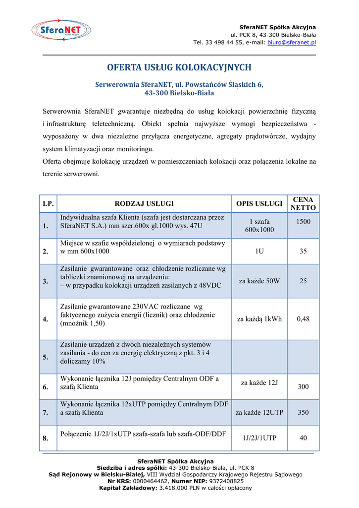 SferaNET Spółka Akcyjna ul. PCK 8, 43-300 Bielsko-Biała Tel. 33 498 44 55, e-mail: [email protected] OFERTA USŁUG KOLOKACYJNYCH Serwerownia SferaNET, ul. Powstańców Śląskich 6, 43-300 Bielsko-Biała Serwerownia SferaNET gwarantuje niezbędną do usług kolokacji powierzchnię fizyczną i infrastrukturę teletechniczną. Obiekt spełnia najwyższe wymogi bezpieczeństwa wyposażony w dwa niezależne przyłącza energetyczne, agregaty prądotwórcze, wydajny system klimatyzacji oraz monitoringu. Oferta obejmuje kolokację urządzeń w pomieszczeniach kolokacji oraz połączenia lokalne na terenie serwerowni. LP. RODZAJ USŁUGI 1. Indywidualna szafa Klienta (szafa jest dostarczana przez SferaNET S.A.) mm szer.600x gł.1000 wys. 47U 2. Miejsce w szafie współdzielonej o wymiarach podstawy w mm 600x1000 3. 4. 5. Zasilanie gwarantowane oraz chłodzenie rozliczane wg tabliczki znamionowej na urządzeniu: – w przypadku kolokacji urządzeń zasilanych z 48VDC Zasilanie gwarantowane 230VAC rozliczane wg faktycznego zużycia energii (licznik) oraz chłodzenie (mnożnik 1,50) CENA NETTO 1 szafa 600x1000 1500 1U 35 za każde 50W 25 za każdą 1kWh 0,48 Zasilanie urządzeń z dwóch niezależnych systemów zasilania - do cen za energię elektryczną z pkt. 3 i 4 doliczamy 10% 6. Wykonanie łącznika 12J pomiędzy Centralnym ODF a szafą Klienta 7. Wykonanie łącznika 12xUTP pomiędzy Centralnym DDF a szafą Klienta 8. OPIS USŁUGI Połączenie 1J/2J/1xUTP szafa-szafa lub szafa-ODF/DDF za każde 12J 300 za każde 12UTP 350 1J/2J/1UTP 40 SferaNET Spółka Akcyjna Siedziba i adres spółki: 43-300 Bielsko-Biała, ul. PCK 8 Sąd Rejonowy w Bielsku-Białej, VIII Wydział Gospodarczy Krajowego Rejestru Sądowego Nr KRS: 0000464462, Numer NIP: 9372408825 Kapitał Zakładowy: 3.418.000 PLN w całości opłacony SferaNET Spółka Akcyjna ul. PCK 8, 43-300 Bielsko-Biała Tel. 33 498 44 55, e-mail: [email protected] Opłata za wykonanie połączenia na terenie Serwerowni za każdy wykorzystany patchcord 1 patchcord 20 10. Dostęp do Internetu taryfikowany za realnie zagregowane pasmo za każdy 1 Mbps 5 11. Transmisja danych taryfikowana za realnie zagregowane pasmo za każdy 1 Mbps 2 za każdą godzinę 40 80 120 za każdą godzinę 60 100 150 9. Nadzór pracownika SferaNET 12. w dni robocze w godz. 8:00-16:00 w dni robocze w godz. od 16:00 do 8:00 dnia następnego w pozostałe dni Usługa „zdalne ręce” 13. w dni robocze w godz. 8:00-16:00 w dni robocze w godz. od 16:00 do 8:00 dnia następnego w pozostałe dni SferaNET Spółka Akcyjna Siedziba i adres spółki: 43-300 Bielsko-Biała, ul. PCK 8 Sąd Rejonowy w Bielsku-Białej, VIII Wydział Gospodarczy Krajowego Rejestru Sądowego Nr KRS: 0000464462, Numer NIP: 9372408825 Kapitał Zakładowy: 3.418.000 PLN w całości opłacony