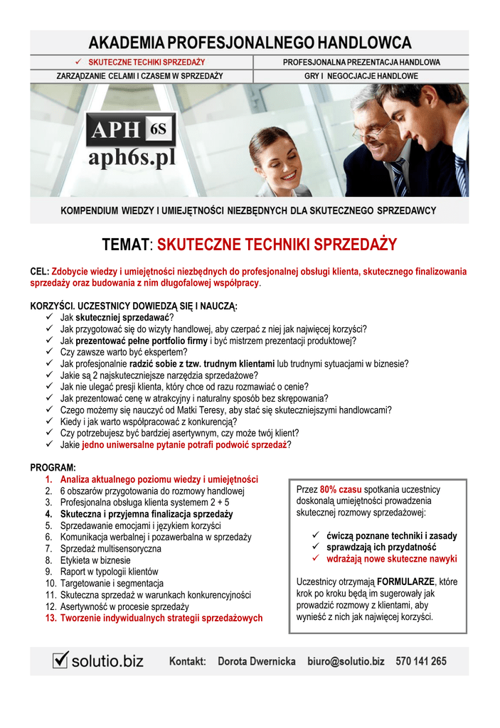 TEMAT: SKUTECZNE TECHNIKI SPRZEDAŻY CEL: Zdobycie wiedzy i umiejętności niezbędnych do profesjonalnej obsługi klienta, skutecznego finalizowania sprzedaży oraz budowania z nim długofalowej współpracy. KORZYŚCI. UCZESTNICY DOWIEDZĄ SIĘ I NAUCZĄ: Jak skuteczniej sprzedawać? Jak przygotować się do wizyty handlowej, aby czerpać z niej jak najwięcej korzyści? Jak prezentować pełne portfolio firmy i być mistrzem prezentacji produktowej? Czy zawsze warto być ekspertem? Jak profesjonalnie radzić sobie z tzw. trudnym klientami lub trudnymi sytuacjami w biznesie? Jakie są 2 najskuteczniejsze narzędzia sprzedażowe? Jak nie ulegać presji klienta, który chce od razu rozmawiać o cenie? Jak prezentować cenę w atrakcyjny i naturalny sposób bez skrępowania? Czego możemy się nauczyć od Matki Teresy, aby stać się skuteczniejszymi handlowcami? Kiedy i jak warto współpracować z konkurencją? Czy potrzebujesz być bardziej asertywnym, czy może twój klient? Jakie jedno uniwersalne pytanie potrafi podwoić sprzedaż? PROGRAM: 1. Analiza aktualnego poziomu wiedzy i umiejętności 2. 6 obszarów przygotowania do rozmowy handlowej 3. Profesjonalna obsługa klienta systemem 2 + 5 4. Skuteczna i przyjemna finalizacja sprzedaży 5. Sprzedawanie emocjami i językiem korzyści 6. Komunikacja werbalnej i pozawerbalna w sprzedaży 7. Sprzedaż multisensoryczna 8. Etykieta w biznesie 9. Raport w typologii klientów 10. Targetowanie i segmentacja 11. Skuteczna sprzedaż w warunkach konkurencyjności 12. Asertywność w procesie sprzedaży 13. Tworzenie indywidualnych strategii sprzedażowych Przez 80% czasu spotkania uczestnicy doskonalą umiejętności prowadzenia skutecznej rozmowy sprzedażowej: ćwiczą poznane techniki i zasady sprawdzają ich przydatność wdrażają nowe skuteczne nawyki Uczestnicy otrzymają FORMULARZE, które krok po kroku będą im sugerowały jak prowadzić rozmowy z klientami, aby wynieść z nich jak najwięcej korzyści.