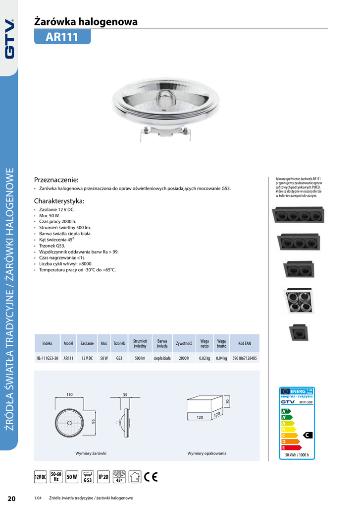 Żarówka halogenowa Przeznaczenie: Charakterystyka: • • • • • • • • • • • Zasilanie 12 V DC. Moc 50 W. Czas pracy 2000 h. Strumień świetlny 500 lm. Barwa światła ciepła biała. Kąt świecenia 45⁰ Trzonek G53. Współczynnik oddawania barw Ra > 99. Czas nagrzewania: <1s. Liczba cykli wł/wył: >8000. Temperatura pracy od -30°C do +65°C. Indeks Model Zasilanie Moc Trzonek Strumień świetlny Barwa światła Żywotność Waga netto Waga brutto Kod EAN HL-111G53-30 AR111 12 V DC 50 W G53 500 lm ciepła biała 2000 h 0,02 kg 0,04 kg 5901867128485 110 70 35 120 Wymiary żarówki 50-60 Hz 20 Jako uzupełnienie żarówek AR111 proponujemy zastosowanie o praw sufitowych podtynkowych PIREO, które są dostępne w naszej ofercie w kolorze czarnym lub szarym. • Żarówka halogenowa przeznaczona do opraw oświetleniowych posiadających mocowanie G53. 95 ŹRÓDŁA ŚWIATŁA TRADYCYJNE / ŻARÓWKI HALOGENOWE AR111 1.04 50 W IP 20 120 Wymiary opakowania 45o Źródła światła tradycyjne / żarówki halogenowe AR111-50W 50 kWh / 1000 h