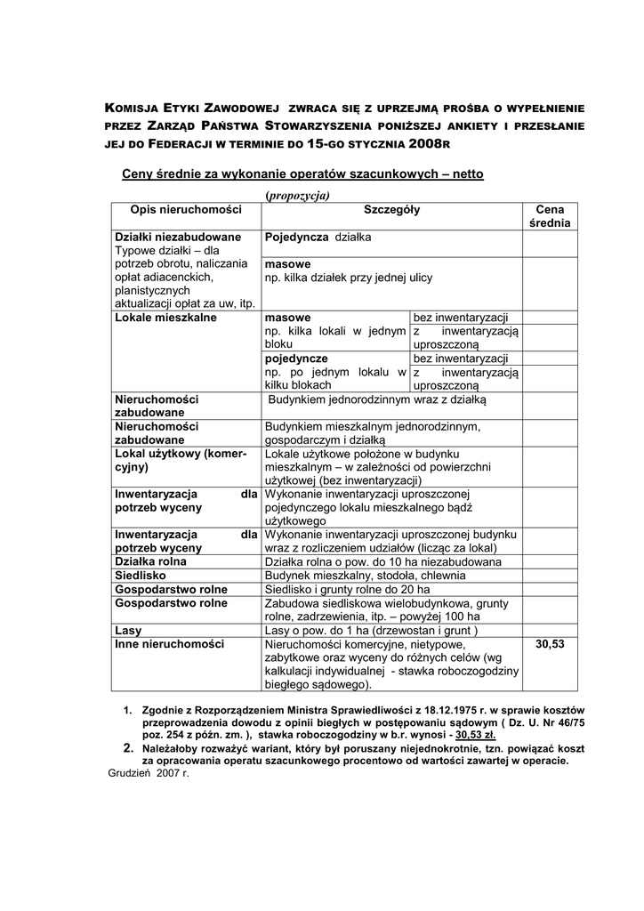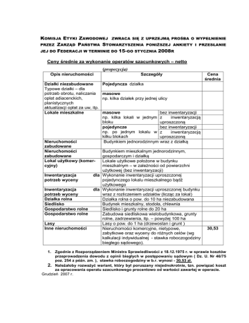 KOMISJA ETYKI ZAWODOWEJ ZWRACA SIĘ Z UPRZEJMĄ PROŚBA O WYPEŁNIENIE PRZEZ ZARZĄD PAŃSTWA STOWARZYSZENIA PONIŻSZEJ ANKIETY I PRZESŁANIE JEJ DO FEDERACJI W TERMINIE DO 15-GO STYCZNIA 2008R Ceny średnie za wykonanie operatów szacunkowych – netto (propozycja) Opis nieruchomości Działki niezabudowane Typowe działki – dla potrzeb obrotu, naliczania opłat adiacenckich, planistycznych aktualizacji opłat za uw, itp. Lokale mieszkalne Nieruchomości zabudowane Nieruchomości zabudowane Lokal użytkowy (komercyjny) Inwentaryzacja potrzeb wyceny Inwentaryzacja potrzeb wyceny Działka rolna Siedlisko Gospodarstwo rolne Gospodarstwo rolne Lasy Inne nieruchomości Szczegóły Cena średnia Pojedyncza działka masowe np. kilka działek przy jednej ulicy masowe bez inwentaryzacji np. kilka lokali w jednym z inwentaryzacją bloku uproszczoną pojedyncze bez inwentaryzacji np. po jednym lokalu w z inwentaryzacją kilku blokach uproszczoną Budynkiem jednorodzinnym wraz z działką Budynkiem mieszkalnym jednorodzinnym, gospodarczym i działką Lokale użytkowe położone w budynku mieszkalnym – w zależności od powierzchni użytkowej (bez inwentaryzacji) dla Wykonanie inwentaryzacji uproszczonej pojedynczego lokalu mieszkalnego bądź użytkowego dla Wykonanie inwentaryzacji uproszczonej budynku wraz z rozliczeniem udziałów (licząc za lokal) Działka rolna o pow. do 10 ha niezabudowana Budynek mieszkalny, stodoła, chlewnia Siedlisko i grunty rolne do 20 ha Zabudowa siedliskowa wielobudynkowa, grunty rolne, zadrzewienia, itp. – powyżej 100 ha Lasy o pow. do 1 ha (drzewostan i grunt ) Nieruchomości komercyjne, nietypowe, zabytkowe oraz wyceny do różnych celów (wg kalkulacji indywidualnej - stawka roboczogodziny biegłego sądowego). 30,53 1. Zgodnie z Rozporządzeniem Ministra Sprawiedliwości z 18.12.1975 r. w sprawie kosztów przeprowadzenia dowodu z opinii biegłych w postępowaniu sądowym ( Dz. U. Nr 46/75 poz. 254 z późn. zm. ), stawka roboczogodziny w b.r. wynosi - 30,53 zł. 2. Należałoby rozważyć wariant, który był poruszany niejednokrotnie, tzn. powiązać koszt za opracowania operatu szacunkowego procentowo od wartości zawartej w operacie. Grudzień 2007 r.