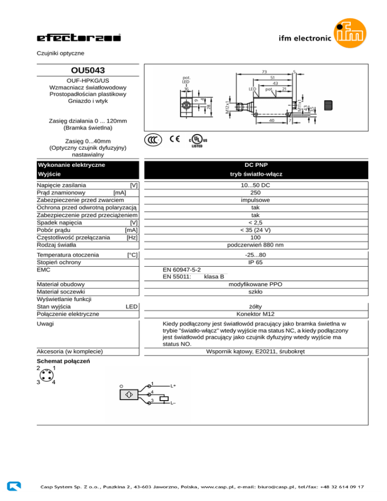 Czujniki optyczne OU5043 OUF-HPKG/US Wzmacniacz światłowodowy Prostopadłościan plastikowy Gniazdo i wtyk Zasięg działania 0 ... 120mm (Bramka świetlna) Zasięg 0...40mm (Optyczny czujnik dyfuzyjny) nastawialny Wykonanie elektryczne DC PNP Wyjście tryb światło-włącz Napięcie zasilania [V] Prąd znamionowy [mA] Zabezpieczenie przed zwarciem Ochrona przed odwrotną polaryzacją Zabezpieczenie przed przeciążeniem Spadek napięcia [V] Pobór prądu [mA] Częstotliwość przełączania [Hz] Rodzaj światła Temperatura otoczenia Stopień ochrony EMC Materiał obudowy Materiał soczewki Wyświetlanie funkcji Stan wyjścia Połączenie elektryczne Uwagi Akcesoria (w komplecie) Schemat połączeń 10...50 DC 250 impulsowe tak tak < 2,5 < 35 (24 V) 100 podczerwień 880 nm [°C] -25...80 IP 65 EN 60947-5-2 EN 55011: klasa B modyfikowane PPO szkło LED żółty Konektor M12 Kiedy podłączony jest światłowód pracujący jako bramka świetlna w trybie "światło-włącz" wtedy wyjście ma status NC, a kiedy podłączony jest światłowód pracujący jako czujnik dyfuzyjny wtedy wyjście ma status NO. Wspornik kątowy, E20211, śrubokręt OU5043 Wykres funkcji wzmocnienia ifm electronic gmbh • Teichstraße 4 • 45127 Essen — Rezerwujemy prawo do zmian technicznych bez wcześniejszego powiadomienia. — PL — OU5043 — 06.03.2003