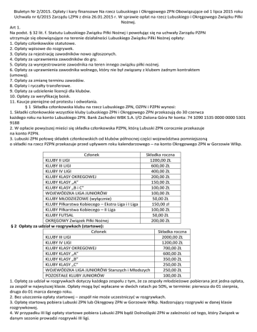 Biuletyn Nr 2/2015. Opłaty i kary finansowe Na rzecz Lubuskiego i Okręgowego ZPN Obowiązujące od 1 lipca 2015 roku Uchwała nr 6/2015 Zarządu LZPN z dnia 26.01.2015 r. W sprawie opłat na rzecz Lubuskiego i Okręgowego Związku Piłki Nożnej. Art 1. Na podst. § 32 lit. f. Statutu Lubuskiego Związku Piłki Nożnej i powołując się na uchwały Zarządu PZPN utrzymuje się obowiązujące na terenie działalności Lubuskiego Związku Piłki Nożnej opłaty: 1. Opłaty członkowskie statutowe. 2. Opłaty wpisowe do rozgrywek. 3. Opłaty za rejestrację zawodników nowo zgłoszonych. 4. Opłaty za uprawnienia zawodników do gry. 5. Opłaty za wyrejestrowanie zawodnika na teren innego związku piłki nożnej. 6. Opłaty za uprawnienia zawodnika wolnego, który nie był związany z klubem żadnym kontraktem (umową). 7. Opłaty za zmianę terminu zawodów. 8. Opłaty i ryczałty transferowe. 9. Opłaty za udzielenie licencji dla klubów. 10. Opłaty za weryfikację boisk. 11. Kaucje pieniężne od protestu i odwołania. § 1 Składka członkowska klubu na rzecz Lubuskiego ZPN, OZPN i PZPN wynosi: 1. Składki członkowskie wszystkie kluby Lubuskiego ZPN i Okręgowego ZPN przekazują do 30 czerwca każdego roku na konto Lubuskiego ZPN. Bank Zachodni WBK S.A. I/O Zielona Góra Nr konta: 74 1090 1535 0000 0000 5301 9188 2. W opłacie powyższej mieści się składka członkowska PZPN, którą Lubuski ZPN corocznie przekazuje na konto PZPN. 3. Lubuski ZPN połowę składek członkowskich od klubów północnej części województwa pomniejszoną o składki na rzecz PZPN przekazuje przed upływem roku kalendarzowego – na konto Okręgowego ZPN w Gorzowie Wlkp. Członek Składka roczna KLUBY II LIGI 1200,00 ZŁ KLUBY III LIGI 600,00 ZŁ KLUBY IV LIGI 400,00 ZŁ KLUBY KLASY OKREGOWEJ 200,00 ZŁ KLUBY KLASY „A” 150,00 ZŁ KLUBY KLASY „B i C” 100,00 ZŁ WOJEWÓDZKA LIGA JUNIORÓW 100,00 ZŁ KLUBY MŁODZIEŻOWE (wyłącznie) 50,00 ZŁ KLUBY Piłkarstwa Kobiecego – Ekstra Liga i I Liga 150,00 zł KLUBY Piłkarstwa Kobiecego – II Liga 100,00 ZŁ KLUBY FUTSAL 50,00 ZŁ OKRĘGOWY Związek Piłki Nożnej 200,00 ZŁ § 2 Opłaty za udział w rozgrywkach (startowe): Członek Składka roczna KLUBY III LIGI 2000,00 ZŁ KLUBY IV LIGI 1200,00 ZŁ KLUBY KLASY OKREGOWEJ 700,00 ZŁ KLUBY KLASY „A” 600,00 ZŁ KLUBY KLASY „B” 350,00 ZŁ KLUBY KLASY „C” 250,00 ZŁ WOJEWÓDZKA LIGA JUNIORÓW Starszych i Młodszych 250,00 ZŁ POZOSTAŁE KLUBY JUNIORÓW 100,00 ZŁ 1. Opłatę za udział w rozgrywkach dotyczy każdego zespołu z tym, że za zespoły młodzieżowe pobierana jest jedna opłata, za zespół w najwyższej klasie. Opłaty mogą byd wpłacane w dwóch ratach po 50%, w terminie: pierwsza do 01 sierpnia, druga do 01 marca danego roku. 2. Bez uiszczenia opłaty startowej – zespół nie może uczestniczyd w rozgrywkach. 3. Opłatę startową pobiera Lubuski ZPN lub Okręgowy ZPN w Gorzowie Wlkp. Nadzorujący rozgrywki w danej klasie rozgrywkowej. 4. W przypadku III ligi opłaty startowe pobiera Lubuski ZPN bądź Dolnośląski ZPN w zależności od tego, który Związek w danym sezonie prowadzi rozgrywki III ligi. § 3 Opłaty za rejestrację zawodników nowo zgłoszonych do klubu, oraz na oświadczenie, iż zawodnik nie uczestniczył w okresie ostatnich 12 –stu miesięcy w żadnych oficjalnych rozgrywkach piłkarskich § 4 Opłaty za uprawnienie zawodnika do gry na jeden sezon rozgrywkowy: 1. Opłatę pobiera WG nadający uprawnienia (Lubuski ZPN – dla klubów II, III i IV ligi oraz wszystkich drużyn z Okręgu Południowego a Okręgowy ZPN w Gorzowie Wlkp. od klubów klasy okręgowej i poniżej z Okręgu Północnego. 2. Uprawnienia mogą byd nadane zawodnikom klubu wyłącznie po uiszczeniu stosownej opłaty. Uprawnienia nie będą nadane zawodnikowi, którego klub posiada zaległości finansowe wobecLubuskiego ZPN względnie Okręgowego ZPN. § 5 Opłata za przesunięcie terminu zawodów. W szczególnych i odpowiednio uzasadnionych przypadkach, Wydział Gier Lubuskiego ZPN może dokonad przesunięcia terminu zawodów, w którym nie zachowano 14-dniowego okresu powiadomienia, pod warunkiem przedłożenia pisemnej zgody przeciwnika oraz wniesieniu opłaty na konto organu prowadzącego rozgrywki ( Lubuskiego ZPN, Okręgowego ZPN lub Podokręgu), według poniższych stawek przez wnioskującego: § 6 Opłaty z tytułu dokonywanych transferów zawodników: 1. Opłaty z tytułu zmiany barw klubowych przez zawodników amatorów, i profesjonalistów dokonywane są na rzecz Lubuskiego ZPN przez kluby - II ligi , III ligi, IV ligi, a kluby pozostałych klas rozgrywkowych na rzecz macierzystego związku prowadzącego rozgrywki. 2. Opłaty z tytułu przejścia zawodników wszystkich klas rozgrywkowych do i z klubów zagranicznych wpłacane są na rzecz Lubuskiego ZPN. 3. Klub otrzymujący ekwiwalent za wyszkolenie transferowanego zawodnika dokonuje wpłaty na rzecz Lubuskiego ZPN w wysokości 3% od ustalonego między klubami ekwiwalentu za transfer krajowy lub w wysokości 2% od ustalonego miedzy klubami ekwiwalentu za transfer zagraniczny, przy czym wpłata ta nie może byd niższa niż równowartośd 100 dolarów USA. 4. Klub pozyskujący zawodnika zobowiązany jest dokonad wpłaty w wysokości 2% od ustalonego między klubami ekwiwalentu na rzecz Lubuskiego ZPN. 5. W przypadku, gdy kwota 3% lub 2% od ustalonego ekwiwalentu jest niższa od ryczałtów podanych w nw. tabeli, kluby zwalniający i pozyskujący wpłacają przy uprawnianiu zawodników do gry ryczałt dla określonej klasy rozgrywek na rzecz Lubuskiego ZPN. 6. W przypadku nieodpłatnego transferu stałego lub czasowego ma zastosowanie poniższa tabela. 7. Opłaty z tytułu zmiany barw klubowych przez zawodników amatorów i profesjonalistów, kluby EKSTRAKLASY, I, II, III , IV ligi uiszczają na rzecz Lubuskiego ZPN, a kluby pozostałych klas rozgrywkowych na rzecz macierzystego związku prowadzącego rozgrywki. Naruszenie po