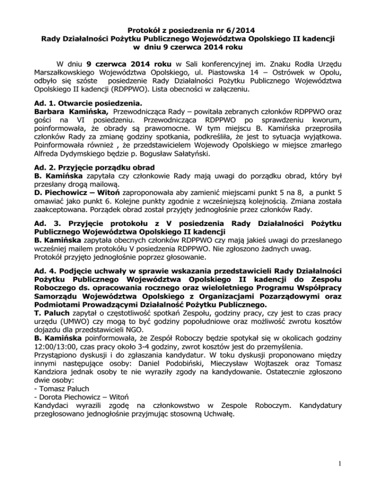 Protokół z posiedzenia nr 6/2014 Rady Działalności Pożytku Publicznego Województwa Opolskiego II kadencji w dniu 9 czerwca 2014 roku W dniu 9 czerwca 2014 roku w Sali konferencyjnej im. Znaku Rodła Urzędu Marszałkowskiego Województwa Opolskiego, ul. Piastowska 14 – Ostrówek w Opolu, odbyło się szóste posiedzenie Rady Działalności Pożytku Publicznego Województwa Opolskiego II kadencji (RDPPWO). Lista obecności w załączeniu. Ad. 1. Otwarcie posiedzenia. Barbara Kamińska, Przewodnicząca Rady – powitała zebranych członków RDPPWO oraz gości na VI posiedzeniu. Przewodnicząca RDPPWO po sprawdzeniu kworum, poinformowała, że obrady są prawomocne. W tym miejscu B. Kamińska przeprosiła członków Rady za zmianę godziny spotkania, podkreśliła, że jest to sytuacja wyjątkowa. Poinformowała również , że przedstawicielem Wojewody Opolskiego w miejsce zmarłego Alfreda Dydymskiego będzie p. Bogusław Sałatyński. Ad. 2. Przyjęcie porządku obrad B. Kamińska zapytała czy członkowie Rady mają uwagi do porządku obrad, który był przesłany drogą mailową. D. Piechowicz – Witoń zaproponowała aby zamienić miejscami punkt 5 na 8, a punkt 5 omawiać jako punkt 6. Kolejne punkty zgodnie z wcześniejszą kolejnością. Zmiana została zaakceptowana. Porządek obrad został przyjęty jednogłośnie przez członków Rady. Ad. 3. Przyjęcie protokołu z V posiedzenia Rady Działalności Pożytku Publicznego Województwa Opolskiego II kadencji B. Kamińska zapytała obecnych członków RDPPWO czy mają jakieś uwagi do przesłanego wcześniej mailem protokółu V posiedzenia RDPPWO. Nie zgłoszono żadnych uwag. Protokół przyjęto jednogłośnie poprzez głosowanie. Ad. 4. Podjęcie uchwały w sprawie wskazania przedstawicieli Rady Działalności Pożytku Publicznego Województwa Opolskiego II kadencji do Zespołu Roboczego ds. opracowania rocznego oraz wieloletniego Programu Współpracy Samorządu Województwa Opolskiego z Organizacjami Pozarządowymi oraz Podmiotami Prowadzącymi Działalność Pożytku Publicznego. T. Paluch zapytał o częstotliwość spotkań Zespołu, godziny pracy, czy jest to czas pracy urzędu (UMWO) czy mogą to być godziny popołudniowe oraz możliwość zwrotu kosztów dojazdu dla przedstawicieli NGO. B. Kamińska poinformowała, że Zespół Roboczy będzie spotykał się w okolicach godziny 12:00/13:00, czas pracy około 3-4 godziny, zwrot kosztów jest do przemyślenia. Przystąpiono dyskusji i do zgłaszania kandydatur. W toku dyskusji proponowano między innymi następujące osoby: Daniel Podobiński, Mieczysław Wojtaszek oraz Tomasz Kandziora jednak osoby te nie wyraziły zgody na kandydowanie. Ostatecznie zgłoszono dwie osoby: - Tomasz Paluch - Dorota Piechowicz – Witoń Kandydaci wyrazili zgodę na członkowstwo w Zespole Roboczym. Kandydatury przegłosowano jednogłośnie przyjmując stosowną Uchwałę. 1 Ad. 5. Przeprowadzenie analizy współpracy lokalnej w oparciu o index. Badanie jest częścią projektu „Modelowe Rady Działalności Pożytku Publicznego” realizowanego przez Urząd Marszałkowski Województwa Łódzkiego, Urząd marszałkowski Województwa Dolnośląskiego, Opolskie Centrum Wspierania Inicjatyw Pozarządowych, Centrum Promocji i Rozwoju inicjatyw Obywatelskich OPUS z Łodzi, Regionalne Centrum Wspierania Inicjatyw pozarządowych z Wrocławia, Stowarzyszenie Centrum Rozwoju Inicjatyw Społecznych CRIS z Rybnika (poddziałanie 5.4.2 PO KL). Ad. 6. Cele i sposoby działania Rady Działalności Pożytku Publicznego Województwa Opolskiego II kadencji – ciąg dalszy dyskusji. D. Piechowicz – Witoń streściła i podsumowała efekty dotychczasowej dyskusji w tym temacie prosząc o ewentualne uzupełnienia członków Rady do poszczególnych punktów. W trakcie dyskusji wskazano na uszczegóławiające elementy celów i działań Rady w postaci: - edukacja społeczna osób młodych /absolwentów również celem przygotowania do pracy na rzecz społeczności lokalnych w III sektorze; - wzmocnienie działania i współpraca z istniejącymi radami seniorów (między innymi Kluczbork, Nysa, Prudnik, Opole); - stworzenie bazy dobrych praktyk w zakresie współpracy III sektora z sektorem biznesu (podmioty komercyjne np. banki). W tym miejscu ustalono, że tego typu dobrych rozwiązań należy szukać między innymi poprzez Zasoby Sieci Splot. D. Piechowicz – Witoń zobowiązała się do zrobienia analizy i zebranie takich danych z Sieci Splot. - w zakresie wsparcia dla NGO ustalono, że ważny jest system szkoleń oraz rozwiń działań sprzyjającym współpracy międzysektorowej z wykorzystaniem form nie finansowych B. Kamińska podkreśliła, że niebawem po stronie UMWO rozpoczną się pracę nad ulepszaniem i upraszczaniem procedur otwartych konkursów ofert na realizacje zadań publicznych przez NGO na zlecenie UMWO M. Witkowska – Kubas wskazała na konieczność wzmocnienia komunikacji z organizacjami branżowymi, które często są pomijane np. eksperci z zakresu profilaktyki i uzależnień B. Kamińska dodała, że ważna jest komunikacja trójstronna, gdzie ogromne znaczenia mają również media - konieczność wzmocnienia prestiżu działania rady pożytku oraz połączenie tego działania z konkursem Opolska Niezapominajka jak również konkursem Społecznik Roku. D. Piechowicz – Witoń zobowiązała się do przesłania członkom Rady projektu konkursu na logo Rady, celem promocji Rady i docierania do szerszego grona odbiorców = społeczności woj. opolskiego. Rozstrzygniecie tego konkursu powinno się odbyć w trakcie trwania Opolskich Targów Organizacji Pozarządowych, które odbędą się w październiku 2014 roku. B. Kamińska zapewniła o staraniach aby konkurs na logo Rady oraz promocja Rady znalazła swoje odzwierciedlenie w lokalnych i regionalnych mediach. W tym miejscu pojawił się również pomysł aby konkurs miał swojego patrona – osobę znaną, lubianą i k