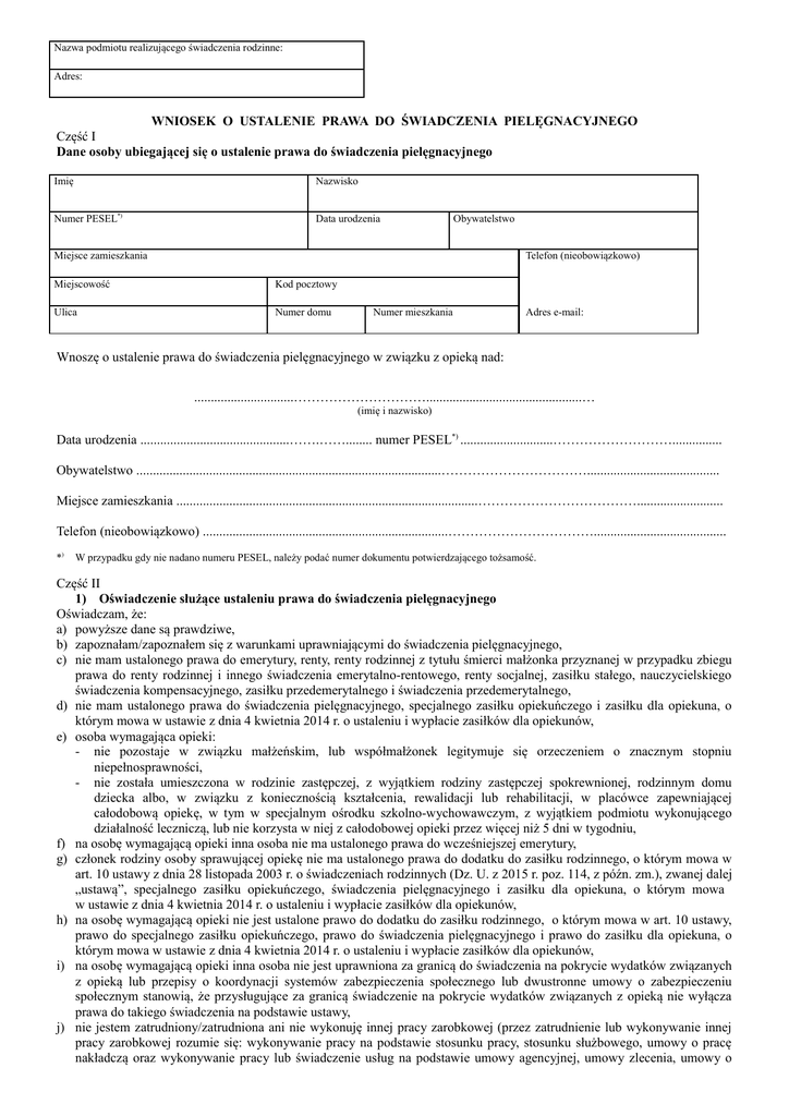 Nazwa podmiotu realizującego świadczenia rodzinne: Adres: WNIOSEK O USTALENIE PRAWA DO ŚWIADCZENIA PIELĘGNACYJNEGO Część I Dane osoby ubiegającej się o ustalenie prawa do świadczenia pielęgnacyjnego Imię Nazwisko Numer PESEL*) Data urodzenia Obywatelstwo Miejsce zamieszkania Telefon (nieobowiązkowo) Miejscowość Kod pocztowy Ulica Numer domu Numer mieszkania Adres e-mail: Wnoszę o ustalenie prawa do świadczenia pielęgnacyjnego w związku z opieką nad: ..............................…………………………...............................................… (imię i nazwisko) Data urodzenia .............................................…….……........ numer PESEL*) ............................………………………............... Obywatelstwo ............................................................................................……………………………........................................ Miejsce zamieszkania ...........................................................................................……………………………….......................... Telefon (nieobowiązkowo) ..........................................................................……………………………........................................ *) W przypadku gdy nie nadano numeru PESEL, należy podać numer dokumentu potwierdzającego tożsamość. Część II 1) Oświadczenie służące ustaleniu prawa do świadczenia pielęgnacyjnego Oświadczam, że: a) powyższe dane są prawdziwe, b) zapoznałam/zapoznałem się z warunkami uprawniającymi do świadczenia pielęgnacyjnego, c) nie mam ustalonego prawa do emerytury, renty, renty rodzinnej z tytułu śmierci małżonka przyznanej w przypadku zbiegu prawa do renty rodzinnej i innego świadczenia emerytalno-rentowego, renty socjalnej, zasiłku stałego, nauczycielskiego świadczenia kompensacyjnego, zasiłku przedemerytalnego i świadczenia przedemerytalnego, d) nie mam ustalonego prawa do świadczenia pielęgnacyjnego, specjalnego zasiłku opiekuńczego i zasiłku dla opiekuna, o którym mowa w ustawie z dnia 4 kwietnia 2014 r. o ustaleniu i wypłacie zasiłków dla opiekunów, e) osoba wymagająca opieki: - nie pozostaje w związku małżeńskim, lub współmałżonek legitymuje się orzeczeniem o znacznym stopniu niepełnosprawności, - nie została umieszczona w rodzinie zastępczej, z wyjątkiem rodziny zastępczej spokrewnionej, rodzinnym domu dziecka albo, w związku z koniecznością kształcenia, rewalidacji lub rehabilitacji, w placówce zapewniającej całodobową opiekę, w tym w specjalnym ośrodku szkolno-wychowawczym, z wyjątkiem podmiotu wykonującego działalność leczniczą, lub nie korzysta w niej z całodobowej opieki przez więcej niż 5 dni w tygodniu, f) na osobę wymagającą opieki inna osoba nie ma ustalonego prawa do wcześniejszej emerytury, g) członek rodziny osoby sprawującej opiekę nie ma ustalonego prawa do dodatku do zasiłku rodzinnego, o którym mowa w art. 10 ustawy z dnia 28 listopada 2003 r. o świadczeniach rodzinnych (Dz. U. z 2015 r. poz. 114, z późn. zm.), zwanej dalej „ustawą”, specjalnego zasiłku opiekuńczego, świadczenia pielęgnacyjnego i zasiłku dla opiekuna, o którym mowa w ustawie z dnia 4 kwietnia 2014 r. o ustaleniu i wypłacie zasiłków dla opiekunów, h) na osobę wymagającą opieki nie jest ustalone prawo do dodatku do zasiłku rodzinnego, o którym mowa w art. 10 ustawy, prawo do specjalnego zasiłku opiekuńczego, prawo do świadczenia pielęgnacyjnego i prawo do zasiłku dla opiekuna, o którym mowa w ustawie z dnia 4 kwietnia 2014 r. o ustaleniu i wypłacie zasiłków dla opiekunów, i) na osobę wymagającą opieki inna osoba nie jest uprawniona za granicą do świadczenia na pokrycie wydatków związanych z opieką lub przepisy o koordynacji systemów zabezpieczenia społecznego lub dwustronne umowy o zabezpieczeniu społecznym stanowią, że przysługujące za granicą świadczenie na pokrycie wydatków związanych z opieką nie wyłącza prawa do takiego świadczenia na podstawie ustawy, j) nie jestem zatrudniony/zatrudniona ani nie wykonuję innej pracy zarobkowej (przez zatrudnienie lub wykonywanie innej pracy zarobkowej rozumie się: wykonywanie pracy na podstawie stosunku pracy, stosunku służbowego, umowy o pracę nakładczą oraz wykonywanie pracy lub świadczenie usług na podstawie umowy agencyjnej, umowy zlecenia, umowy o dzieło albo w okresie członkostwa w rolniczej spółdzielni produkcyjnej, spółdzielni kółek rolniczych lub spółdzielni usług rolniczych, a także prowadzenie pozarolniczej działalności gospodarczej), k) przebywam/nie przebywam*) poza granicami Rzeczypospolitej Polskiej**) w państwie, w którym mają zastosowanie przepisy o koordynacji systemów zabezpieczenia społecznego***), l) członek mojej rodziny, w rozumieniu art. 3 pkt 16 ustawy z dnia 28 listopada 2003 r. o świadczeniach rodzinnych, przebywa/nie przebywa*) poza granicami Rzeczypospolitej Polskiej **) w państwie, w którym mają zastosowanie przepisy o koordynacji systemów zabezpieczenia społecznego***). *) Niepotrzebne skreślić. **) Nie dotyczy wyjazdu lub pobytu turystycznego, leczniczego lub związanego z podjęciem przez dziecko kształcenia poza granicami Rzeczypospolitej Polskiej. ***) Przepisy o koordynacji systemów zabezpieczenia społecznego mają zastosowanie na terenie: Austrii, Belgii, Danii, Finlandii, Francji, Grecji, Hiszpanii, Holandii, Irlandii, Luksemburga, Niemiec, Portugalii, Szwecji, Włoch, Wielkiej Brytanii, Cypru, Czech, Estonii, Litwy, Łotwy, Malty, Polski, Słowacji, Słowenii, Węgier, Bułgarii, Rumunii. Norwegii, Islandii, Liechtensteinu, Szwajcarii oraz od 1 lipca 2013 r. Chorwacji. .…………………....................................................... (data, podpis osoby ubiegającej się) 2) Oświadczenie dotyczące ustalenia prawa do świadczenia pielęgnacyjnego dla osoby, na kt