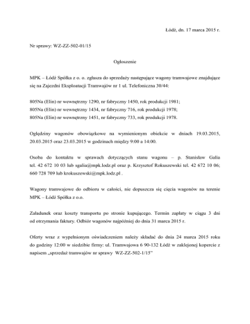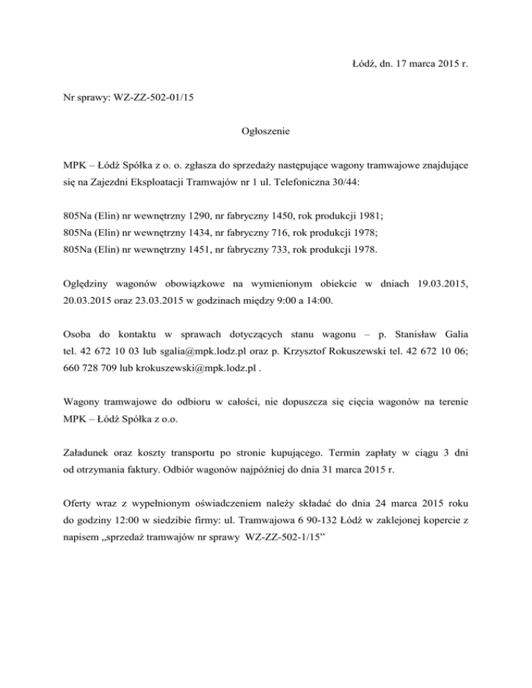Łódź, dn. 17 marca 2015 r. Nr sprawy: WZ-ZZ-502-01/15 Ogłoszenie MPK – Łódź Spółka z o. o. zgłasza do sprzedaży następujące wagony tramwajowe znajdujące się na Zajezdni Eksploatacji Tramwajów nr 1 ul. Telefoniczna 30/44: 805Na (Elin) nr wewnętrzny 1290, nr fabryczny 1450, rok produkcji 1981; 805Na (Elin) nr wewnętrzny 1434, nr fabryczny 716, rok produkcji 1978; 805Na (Elin) nr wewnętrzny 1451, nr fabryczny 733, rok produkcji 1978. Oględziny wagonów obowiązkowe na wymienionym obiekcie w dniach 19.03.2015, 20.03.2015 oraz 23.03.2015 w godzinach między 9:00 a 14:00. Osoba do kontaktu w sprawach dotyczących stanu wagonu – p. Stanisław Galia tel. 42 672 10 03 lub [email protected] oraz p. Krzysztof Rokuszewski tel. 42 672 10 06; 660 728 709 lub [email protected] . Wagony tramwajowe do odbioru w całości, nie dopuszcza się cięcia wagonów na terenie MPK – Łódź Spółka z o.o. Załadunek oraz koszty transportu po stronie kupującego. Termin zapłaty w ciągu 3 dni od otrzymania faktury. Odbiór wagonów najpóźniej do dnia 31 marca 2015 r. Oferty wraz z wypełnionym oświadczeniem należy składać do dnia 24 marca 2015 roku do godziny 12:00 w siedzibie firmy: ul. Tramwajowa 6 90-132 Łódź w zaklejonej kopercie z napisem „sprzedaż tramwajów nr sprawy WZ-ZZ-502-1/15”