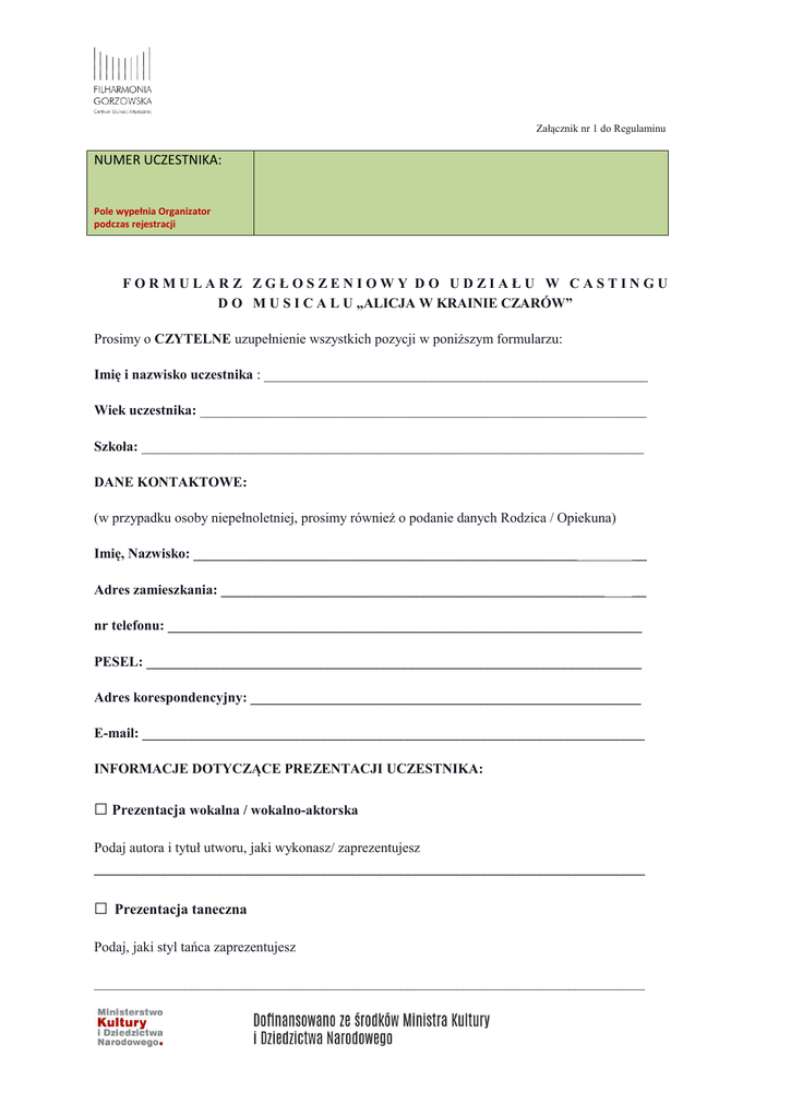 Załącznik nr 1 do Regulaminu NUMER UCZESTNIKA: Pole wypełnia Organizator podczas rejestracji FORMULARZ ZGŁOSZENIOWY DO UDZIAŁU W CASTINGU D O M U S I C A L U „ALICJA W KRAINIE CZARÓW” Prosimy o CZYTELNE uzupełnienie wszystkich pozycji w poniższym formularzu: Imię i nazwisko uczestnika : _______________________________________________________ Wiek uczestnika: ________________________________________________________________ Szkoła: ________________________________________________________________________ DANE KONTAKTOWE: (w przypadku osoby niepełnoletniej, prosimy również o podanie danych Rodzica / Opiekuna) Imię, Nazwisko: _________________________________________________________________ Adres zamieszkania: _____________________________________________________________ nr telefonu: ____________________________________________________________________ PESEL: _______________________________________________________________________ Adres korespondencyjny: ________________________________________________________ E-mail: ________________________________________________________________________ INFORMACJE DOTYCZĄCE PREZENTACJI UCZESTNIKA: □ Prezentacja wokalna / wokalno-aktorska Podaj autora i tytuł utworu, jaki wykonasz/ zaprezentujesz _______________________________________________________________________________ □ Prezentacja taneczna Podaj, jaki styl tańca zaprezentujesz _______________________________________________________________________________ INFORMACJE O UCZESTNIKU Bardzo prosimy o dokładne i wnikliwe odpowiedzi na poniższe pytania. Aby dostać się do musicalu musisz pokonać bardzo wielu chętnych. Pamiętaj, że liczy się nie tylko talent, ale i osobowość! Napisz nam, proszę, parę słów o sobie. W razie potrzeby poproś o pomoc Rodziców lub Opiekunów. Czy i jak długo jesteś uczniem szkoły muzycznej lub w jakikolwiek inny sposób kształcisz się muzycznie. Jeśli tak, napisz, gdzie rozwijasz swój muzyczny talent. _____________________________________________________________________________________ Czy i jak długo jesteś członkiem zespołu tanecznego / szkoły tanecznej lub w jakikolwiek inny sposób zdobywasz umiejętności taneczne. Jeśli tak, napisz, gdzie rozwijasz swój taneczny talent. _____________________________________________________________________________________ Co Cię wyróżnia spośród innych rówieśników ? Jakie masz pasje, zainteresowania poza śpiewem / poza tańcem? _____________________________________________________________________________________ Czy masz jakieś szczególne osiągnięcia, którymi chciałbyś / chciałabyś się pochwalić? _____________________________________________________________________________________ Dlaczego chciałbyś / chciałabyś wziąć udział w naszym musicalu? _____________________________________________________________________________________ Skąd dowiedziałeś /dowiedziałaś się o castingu? _____________________________________________________________________________________ W musicalu „Alicja w Krainie Czarów” chcę wystąpić jako __________________________________ Podpis uczestnika lub rodzica / opiekuna*: ___________________ Wyrażam zgodę na przetwarzanie moich danych osobowych / danych osobowych mojego dziecka zawartych w powyższym formularzu dla potrzeb niezbędnych do realizacji projektu musical „alicja w krainie czarów”, zgodnie z ustawą z dnia 29.08.1997 r. O ochronie danych osobowych (Dz.U. nr 133, poz.883). oświadczam, że zostałam poinformowany/a o przysługującym mi prawie wglądu i poprawiania moich danych osobowych. Miejsce i data: ________________ Podpis uczestnika lub rodzica / opiekuna*: ___________________ * rodzic / opiekun podpisuje w przypadku, gdy uczestnik nie ukończył 18 lat.