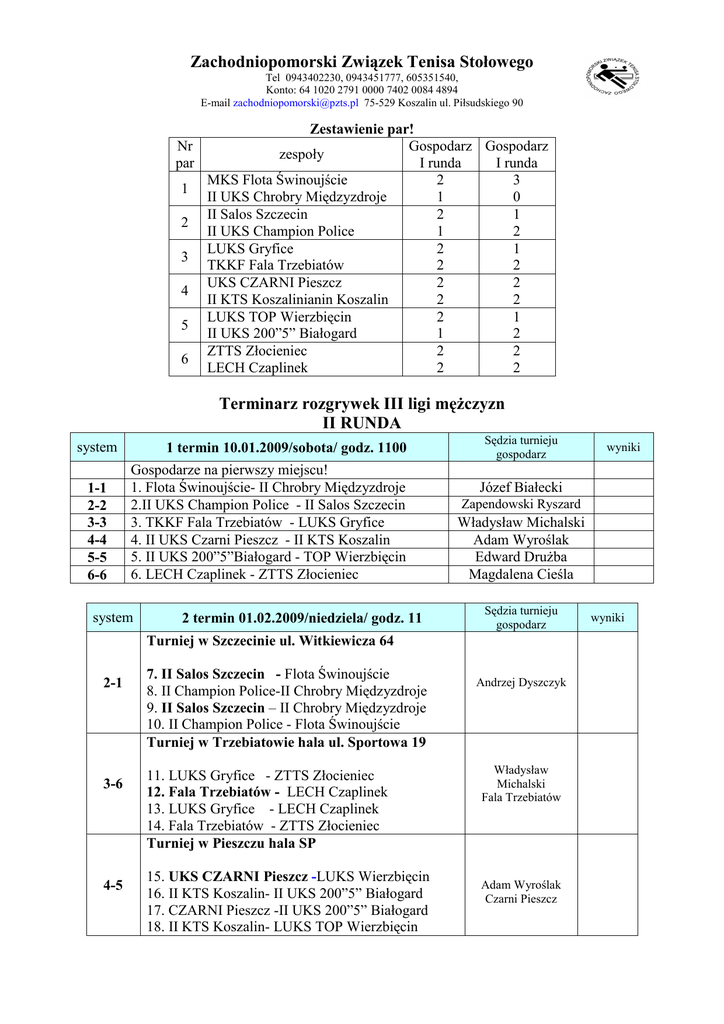 Zachodniopomorski Związek Tenisa Stołowego Tel 0943402230, 0943451777, 605351540, Konto: 64 1020 2791 0000 7402 0084 4894 E-mail [email protected] 75-529 Koszalin ul. Piłsudskiego 90 Nr par 1 2 3 4 5 6 Zestawienie par! Gospodarz Gospodarz zespoły I runda I runda MKS Flota Świnoujście 2 3 II UKS Chrobry Międzyzdroje 1 0 II Salos Szczecin 2 1 II UKS Champion Police 1 2 LUKS Gryfice 2 1 TKKF Fala Trzebiatów 2 2 UKS CZARNI Pieszcz 2 2 II KTS Koszalinianin Koszalin 2 2 LUKS TOP Wierzbięcin 2 1 II UKS 200”5” Białogard 1 2 ZTTS Złocieniec 2 2 LECH Czaplinek 2 2 Terminarz rozgrywek III ligi męŜczyzn II RUNDA system 1-1 2-2 3-3 4-4 5-5 6-6 1 termin 10.01.2009/sobota/ godz. 1100 Gospodarze na pierwszy miejscu! 1. Flota Świnoujście- II Chrobry Międzyzdroje 2.II UKS Champion Police - II Salos Szczecin 3. TKKF Fala Trzebiatów - LUKS Gryfice 4. II UKS Czarni Pieszcz - II KTS Koszalin 5. II UKS 200”5”Białogard - TOP Wierzbięcin 6. LECH Czaplinek - ZTTS Złocieniec system 2 termin 01.02.2009/niedziela/ godz. 11 Sędzia turnieju gospodarz Józef Białecki Zapendowski Ryszard Władysław Michalski Adam Wyroślak Edward DruŜba Magdalena Cieśla Sędzia turnieju gospodarz Turniej w Szczecinie ul. Witkiewicza 64 2-1 3-6 4-5 7. II Salos Szczecin - Flota Świnoujście 8. II Champion Police-II Chrobry Międzyzdroje 9. II Salos Szczecin – II Chrobry Międzyzdroje 10. II Champion Police - Flota Świnoujście Turniej w Trzebiatowie hala ul. Sportowa 19 11. LUKS Gryfice - ZTTS Złocieniec 12. Fala Trzebiatów - LECH Czaplinek 13. LUKS Gryfice - LECH Czaplinek 14. Fala Trzebiatów - ZTTS Złocieniec Turniej w Pieszczu hala SP 15. UKS CZARNI Pieszcz -LUKS Wierzbięcin 16. II KTS Koszalin- II UKS 200”5” Białogard 17. CZARNI Pieszcz -II UKS 200”5” Białogard 18. II KTS Koszalin- LUKS TOP Wierzbięcin wyniki Andrzej Dyszczyk Władysław Michalski Fala Trzebiatów Adam Wyroślak Czarni Pieszcz wyniki system 3-1 4-2 6- 5 system 4-1 5-3 6-2 System 1-5 6-4 2-3 3 termin 15.02.2009 /niedziela/ godz. 11.00 Turniej w Gryficach hala ul. Rodziewiczówny 2 19. LUKS Gryfice -MKS Flota Świnoujście 20. Fala Trzebiatów -II UKS Chrobry Międzyzdroje 21. LUKS Gryfice - II UKS Chrobry Międzyzdroje 22. Fala Trzebiatów - MKS Flota Świnoujście Turniej w Koszalinie hala SK ul. Staszica 38 23. UKS CZARNI Pieszcz - II Salos Szczecin 24. II KTS Koszalin- II Champion Police 25. UKS CZARNI Pieszcz -II Champion Police 26. II KTS Koszalin - II Salos Szczecin Turniej Złocieńcu hala ul. Okrzei 2 27. ZTTS Złocieniec -LUKS TOP Wierzbięcin 28. LECH Czaplinek -II UKS 200”5” Białogard 29. ZTTS Złocieniec -II UKS 200”5” Białogard 30. LECH Czaplinek - LUKS TOP Wierzbięcin 4 termin 01.03.2009/niedziela/ godz. 11.00 Turniej w Koszalinie hala SK ul Staszica 38 31. UKS CZARNI Pieszcz-MKS Flota Świnoujście 32. II KTS Koszalin -II Chrobry Międzyzdroje 33. UKS CZARNI Pieszcz-II Chrobry Międzyzdroje 34. II KTS Koszalin - MKS Flota Świnoujście Turniej w Białogardzie hala ul. Kołobrzeska 23 35 LUKS TOP Wierzbięcin – LUKS Gryfice 36. II UKS 200”5” Białogard – Fala Trzebiatów 37. LUKS TOP Wierzbięcin – Fala Trzebiatów 38. II UKS 200”5” Białogard – LUKS Gryfice Turniej w Czaplinku hala SP ul Wałecka 49 39. ZTTS Złocieniec - II Salos Szczecin 40. LECH Czaplinek - II UKS Champion Police 41. ZTTS Złocieniec - II UKS Champion Police 42. LECH Czaplinek - II Salos Szczecin 5 termin 22.03.2009 /niedziela/ godz. 11.00 Turniej w Świnoujściu hala ul. Piłsudskiego 9 43 Flota Świnoujście - LUKS Wierzbięcin 44. II Chrobry Międzyzdr.-IIUKS 200”5”Białogard 45. Flota Świnoujście - II UKS 200”5” Białogard 46. II Chrobry Międzyzdroje-LUKS Wierzbięcin Turniej w Złocieńcu hala ul. Okrzei 2 47. ZTTS Złocieniec - UKS CZARNI Pieszcz 48. LECH Czaplinek - II KTS Koszalin 49. ZTTS Złocieniec - II KTS Koszalin 50. LECH Czaplinek-UKS CZARNI Pieszcz Turniej w Policach hala ul. Piaskowa 99 51. II Salos Szczecin - LUKS Gryfice 52. II Champion Police - Fala Trzebiatów 53. II Salos Szczecin - Fala Trzebiatów 54. II Champion Police - LUKS Gryfice Sędzia turnieju gospodarz wyniki Stanisław Grabowski LUKS Gryfice Jan Nowicki Piotr Albiniak ZTTS Złocieniec Sędzia turnieju gospodarz wyniki Jan Nowicki KTS Koszalin Edward DruŜba UKS 200”5” Białogard Magdalena Cieśla Lech Czaplinek Sędzia turnieju gospodarz Józef Białecki Grzegorz Wrzesiński Kazimierz Mikulski Champion Police wyniki system 1-6 5-2 3-4 6 termin 29.03.2008/niedziela/ godz. 11.00 Turniej w Świnoujściu hala ul. Piłsudskiego 9 55. MKS Flota Świnoujście - ZTTS Złocieniec 56. II Chrobry Międzyzdroje - LECH Czaplinek 57. MKS Flota Świnoujście - LECH Czaplinek 58. II Chrobry Międzyzdroje - ZTTS Złocieniec Turniej w Wierzbięcinie hala SP 59. LUKS TOP Wierzbięcin- II Salos Szczecin 60. II UKS 200”5” Białogard -II Champion Police 61. LUKS TOP Wierzbięcin - II Champion Police 62. II UKS 200”5” Białogard- II Salos Szczecin Turniej w Trzebiatowie hala ul. Sportowa 19 63. LUKS Gryfice - UKS CZARNI Pieszcz 64.Fala Trzebiatów - II KTS Koszalin 65. LUKS Gryfice - II KTS Koszalin 66. Fala Trzebiatów - UKS CZARNI Pieszcz Sędzia turnieju gospodarz Józef Białecki MKS Flota Świnoujście Józef Korkosz TOP Wierzbięcin Władysław Michalski FALA Trzebiatów Uwaga: w drugiej rundzie obowiązuje ranking! Koszalin 29.12.2008 r. Opracowanie: V-ce prezes ZPZTS Piotr Bochnacki wyniki