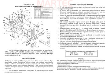 INSTRUKCJA MontaŜu i eksploatacji zaczepu kulowego C 4 18 14 A 6 Oznaczenie zacisku wg ISO PN 1 L 2 + 3 31 4 R 5 58R 6 54 7 58L 14 Kolejność czynności przy montaŜu Łączenie przewodów Kierunkowskazy lewe Tylne światła przeciwmgłowe Masa Kierunkowskazy prawe Światła pozycyjne prawe Światła hamowania Światła pozycyjne lewe 1 7 11 B 12 5 7 10 9 13 13 8 12 3 2 Zaczep kulowy przeznaczony jest do zamontowania w samochodzie: OPEL ASTRA „A” KOMBI, produkowanym od 1991r. do 2002r., numer katalogowy E36 i słuŜy do ciągnięcia przyczep o masie całkowitej 1500 kg i nacisku na kulę max 50 kg. 1. W celu zamontowania zaczepu naleŜy zdemontować zderzak oraz wyjąć koło zapasowe z bagaŜnika. 2. W tylnym płacie samochodu (od zewnętrznej strony) odszukać miejsca fabrycznie napunktowane, a następnie przewiercić cztery otwory wiertłem ø17mm. W celu zorientowania się przyłoŜyć wspornik kuli (poz. 1). 3. WłoŜyć do bagaŜnika płytę kompletną (poz. 4) i poprzez uprzednio wykonane otwory, tulejki dystansowe oraz otwory zaczepu (poz. A) skręcić śrubami M10x110 (poz. 11), oraz M10x100 (poz. 12) ze wspornikiem kuli (poz. 1) – patrz rysunek. 4. Od wewnątrz bagaŜnika poprzez otwory (poz. B) płyty tylnej (poz. 4) przewiercić wiertłem ø12mm otwory w podłodze wnęki koła i skręcić śrubami M10x35mm (poz. 13) z płytą dolną (poz. 5) przyłoŜonym od spodu pojazdu. 5. Pomiędzy części zaczepu (poz. 1 i 5) wsunąć tulejki ø25x5mm, L=68mm (poz. 8) i skręcić śrubami M10x100mm (poz. 12) jak pokazano na rysunku. 6. Poprzez istniejące otwory wewnątrz bagaŜnika i otwory zaczepu (poz. C) skręcić śrubami M8x30mm (poz. 14). 7. Przed zamontowaniem zderzaka w jego podłuŜnej osi symetrii wyciąć w dolnej krawędzi fragment 70x35mm. 8. Przykręcić część kulistą zaczepu (poz. 2) wraz z blachą pod gniazdo (poz. 3) śrubami M12x75mm (poz. 9) oraz M12x70mm (poz. 10). 9. Dokręcić wszystkie śruby z momentem jak pokazano w tabeli. 10. Podłączyć przewody gniazdka 7 – bieg. do instalacji elektrycznej zgodnie z instrukcją fabryczną samochodu (zaleca się wykonanie w ASO). 11. Uzupełnić ewentualne ubytki powłoki malarskiej zaczepu powstałe w trakcie montaŜu. Zalecany moment skręcający dla śrub i nakrętek 8,8: M 8 - 25 Nm M 10 - 55 Nm M 12 - 85 Nm M 14 - 135 Nm OD PRODUCENTA UWAGA Dziękujemy za wybór produkowanego przez naszą firmę zaczepu kulowego. Jego niezawodność została potwierdzona licznymi testami oraz opiniami zadowolonych klientów. JednakŜe niezawodność zaczepów kulowych jest zaleŜna równieŜ od prawidłowego montaŜu oraz prawidłowej eksploatacji. Z tego powodu prosimy Państwa o staranne przeczytanie niniejszej instrukcji montaŜu oraz przestrzeganie właściwych wskazówek. Po zamontowaniu zaczepu kulowego naleŜy uzyskać wpis w dowodzie rejestracyjnym pojazdu na „stacji kontroli pojazdów” właściwej dla miejsca zamieszkania. Samochód powinien być wyposaŜony w : -kierunkowskazy boczne -lusterka boczne o rozstawie co najmniej szerokości przyczepy Sprawdzać śruby mocujące zaczepu kulowego po około 1 000 km przebiegu eksploatacji. Kula zaczepu musi być utrzymana w czystości i konserwowana smarem stałym Zaczep naleŜy zamontować w miejscach do tego celu przeznaczonych przez producenta samochodu. PPUH AUTO-HAK S.J. WyposaŜenie zaczepu: Produkcja Haków Holowniczych Henryk & Zbigniew Nejman 76-200 SŁUPSK ul. Słoneczna 16K tel/fax (059) 8-414-414; 8-414-413 E-mail: [email protected] www. autohak.com.pl Zaczep kulowy bez wyposaŜenia elektrycznego E36 Klasa: A50-X Nr kat. Przeznaczony do zamontowania w samochodzie: Producent: OPEL Model: ASTRA „A” Typ: KOMBI produkowanym od 1991r. do 2002r. Dane techniczne: wartość siły D: 7,77 kN maksymalna masa przyczepy: 1500 kg maksymalny nacisk na kulę: 50 kg Numer homologacji zgodnie z wytycznymi regulaminu EKG/ONZ 55.01: E20-55R-01 1051 KARTA GWARANCYJNA Producent udziela gwarancji niniejszą kartą gwarancyjną na okres 24 miesięcy licząc od dnia zakupu zaczepu kulowego do samochodu: OPEL ASTRA „A” KOMBI produkowanego od 1991r. do 2002r. Data produkcji .............................. Data zakupu............................................. Zakres gwarancji obejmuje wyłącznie wady jakościowe wynikające z winy producenta. Gwarancja nie obejmuje natomiast uszkodzeń zawinionych przez nabywcę, wynikających z niewłaściwego montaŜu, uŜytkowania lub konserwacji, uszkodzeń mechanicznych, normalnego zuŜycia podczas eksploatacji itp. Gwarancja udzielona na zakupiony towar nie wyłącza, nie ogranicza ani nie zawiesza uprawnień kupującego wynikających z niezgodności towaru z umową. Reklamacje naleŜy zgłaszać w punkcie sprzedaŜy, składając jednocześnie kartę gwarancyjną. Usunięcie "wady" następuje po stwierdzeniu przez punkt sprzedaŜy wspólnie z producentem słuszności złoŜonej reklamacji. Reklamacja powinna być załatwiona w ciągu 14 dni od dnia uznania reklamacji. Karta gwarancyjna jest niewaŜna jeŜeli nie jest wypełniona i podpisana. Data zgłoszenia reklamacji: ................................................................... INFORMACJA WSTĘPNA Zaczep kulowy jest skonstruowany zgodnie z zasadami bezpieczeństwa ruchu drogowego. Zaczep kulowy jest elementem wpływającym na bezpieczeństwo jazdy i moŜe zostać zainstalowany wyłącznie przez personel wyspecjalizowany. Niedopuszczalne jest dokonywanie jakichkolwiek zmian w konstrukcji zaczepu. Powoduje to wygaśniecie dopuszczenia do stosowania. W przypadku obecności masy izolacyjnej lub osłony podwozia w miejscu przylegania zaczepu, naleŜy ją usunąć. Nieosłonięte miejsca karoserii oraz wywiercone otwory naleŜy pomalować farbą antykorozyjną. Informacjami wiąŜącymi odnośnie wartości obciąŜeń są dane podawane przez producenta samochodu, względnie wartości maksymalnej masy przyczepy oraz maksymalnego nacisku na kulę, przy czym wartości parametrów 