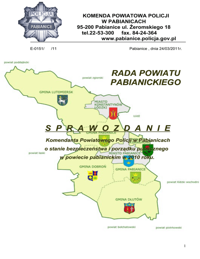 KOMENDA POWIATOWA POLICJI W PABIANICACH 95-200 Pabianice ul. Żeromskiego 18 tel.22-53-300 fax. 84-24-364 www.pabianice.policja.gov.pl E-0151/ /11 Pabianice , dnia 24/03/2011r. RADA POWIATU PABIANICKIEGO S P R A W O Z D A N I E Komendanta Powiatowego Policji w Pabianicach o stanie bezpieczeństwa i porządku publicznego w powiecie pabianickim w 2010 roku. 1 Spis treści: 1. 2. Kadry i struktura organizacyjna P rzestę p c zość 2.1 Rozboje 2.2 Kradzieże z włamaniem 2.3 Kradzieże cudzej rzeczy 2.4 Kradzieże samochodów 2.5 Bójki i pobicia 2.6 Uszczerbek na zdrowiu 2.7 Uszkodzenie mienia 2.8 Przestępczość gospodarcza i korupcyjna 2.9 Przestępstwa narkotykowe 2.10 Przestępstwa drogowe 3. Służba Dochodzeniowo - Śledcza 4. Problematyka i przestępczość nieletnich 5. Bezpieczeństwo w ruchu drogowym 6. Działalność Prewencyjna 7. Podsumowanie 2 1. KADRY I STRUKTURA ORGANIZACYJNA: W 2010 roku struktura organizacyjna Komendy Powiatowej Policji w Pabianicach prezentowała się następująco: KPP Pabianice: - Sekcja Dochodzeniowo – Śledcza, - Sekcja Kryminalna, - Referat dw. z Przestępczością Gospodarczą i Korupcją, - Sekcja Ruchu Drogowego, - Sekcja Prewencji, - Zespół Nieletnich i Patologii, - Referat Patrolowo – Interwencyjny, - Referat Dzielnicowych, - Zespół ds. kadr i szkolenia Komisariat Policji w Konstantynowie Łódzkim, Posterunek Policji w Dłutowie, Posterunek Policji w Piątkowisku, Referat Dzielnicowych w Ksawerowie. Komenda Powiatowa Policji w Pabianicach w dniu 1 stycznia 2010 roku dysponowała 218 etatami, które były obsadzone w 100%. W minionym roku stan etatowy zwiększył się o 3 etaty. Prze cały rok przyjęto do służby 3 funkcjonariuszy, których wysłano na szkolenie zawodowe podstawowe do ośrodków szkoleniowych Policji w systemie stacjonarnym. Ze służby w KPP zwolniono 13 policjantów, wśród których większość z nich posiadało pełną wysługę emerytalną. Szeregi pabianickiej policji opuścili więc funkcjonariusze bardzo doświadczeni, osiągający bardzo dobre wyniki, których zastąpienie z dnia na dzień nie będzie możliwe. Z jednej strony kadra pabianickiej policji znacznie się odmładza, ale zmiana ta niesie ze sobą ryzyko obniżenia skuteczności działa związanej z mniejszym doświadczeniem, bądź jego całkowitym brakiem prze nowo przyjętych policjantów. Kierownictwo Komendy Powiatowej Policji w Pabianicach aby temu zapobiec przeprowadziło szereg zmian i reorganizacji personalnych w celu jak najlepszego zarządzania jakością i wykorzystania w służbie posiadanego aktualnie stanu osobowego. Na koniec 2010 roku pozostawało 13 wakatów. W minionym roku policjanci KPP w Pabianicach, podnosili swoje kwalifikacje, uczestnicząc w 61 szkoleniach w ramach doskonalenia zawodowego. Stan etatowy członków korpusu służby cywilnej na dzień 01.01.2011 roku wynosił 19 stanowisk i można w tym zakresie mówić o pełnym zatrudnieniu. 3 2. P R ZE S T ĘP C ZO Ś Ć : Poziom przestępczości w Polsce wyznaczony jest przede wszystkim przestępczością o charakterze kryminalnym (ok. 90% wszystkich stwierdzonych przestępstw), ok. 10% ma podłoże gospodarcze. Przestępczość dominuje przede wszystkim w dużych aglomeracjach miejskich. W strukturze przestępczości kryminalnej dominują przestępstwa skierowane na zabór mienia bez użycia przemocy na osobie. Ok. 60% ogółu przestępstw kryminalnych to kradzieże z włamaniem. Aktualne tendencje rozwojowe przestępstw to wzrost przestępczości przy użyciu broni palnej i materiałów wybuchowych na tle rabunkowym, a także nasilenie przestępstw porachunkowych w postaci zabójstw, uszczerbku na zdrowiu, uprowadzania osób oraz rozwój przestępczości gospodarczej. Z przeprowadzonej w minionym roku wśród 85 polskich firm ankiety wynika, że aż 46 proc. z nich padło w ciągu ostatnich dwóch lat ofiarą przestępczości gospodarczej. Jak wynika z dokonanych analiz nie jest to tylko problem naszego społeczeństwa. W skali Europy Środkowo-Wschodniej w ciągu ostatnich dwóch lat nastąpił wzrost w doniesieniu do przestępstw gospodarczych z 26% do 37%. Polska pod względem poziomu przestępczości gospodarczej, jest w absolutnej czołówce wśród państw tego regionu. Najbardziej powszechne przestępstwo gospodarcze w Polsce i na świecie to sprzeniewierzanie aktywów firmy, czyli po prostu kradzież jej majątku przez pracowników a także wyłudzenia na szeroką skalę towarów znacznej wartości, wyłudzenie wielomilionowych kredytów, oszustwa w różnych sferach, pranie brudnych pieniędzy, przestępczość celna i podatkowa, przestępczość ubezpieczeniowa, przestępczość intelektualna, przestępczość komputerowa. Aż 60% polskich firm, które ucierpiały, poniosły straty właśnie z tego powodu. Do najpopularniejszych rodzajów przestępstw gospodarczych należy także służące poprawie wizerunku firmy fałszowanie danych finansowych i korupcja. W Polsce 19% firm poniosło z tytułu oszustw finansowych straty przekraczające 250.000 dolarów każda. Według prowadzonych analiz cierpi na tym głównie morale pracowników, działalność biznesowa i reputacja firmy, a w dłuższej perspektywie czasowej odbija się to również na wartości akcji, czy udziałów przedsiębiorstwa. Na terenie działania Komendy Powiatowej Policji w Pabianicach, w 2010 roku odnotowywano (stwierdzano), przestępstwa w następujących kategoriach: 1. kradzieże z włamaniem, w szczególności do mieszkań, domków letniskowych i piwnic; 2. kradzieże mienia, w szczególności rowerów, telefonów komórkowych, portfeli, różnego typu elementów wykonanych z metali kolorowych; 4 3. kradzieże samochodów; 4. rozboje, w wyniku których głównie kradzione były telefony komórkowe i pieniądze; 5. bójki i pobicia; 6. uszkodzenia ciała; 7. zniszczenie mienia; oraz inne zdarzenia ze względu na swój charakter powodujące znaczne szkody społeczne, między innymi: - wypa