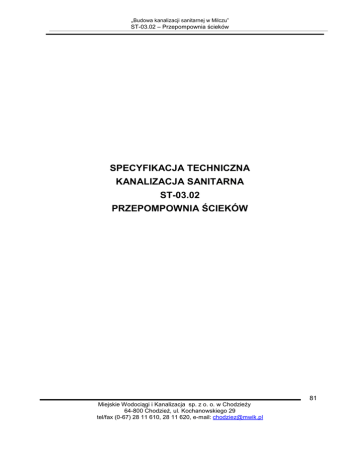 „Budowa kanalizacji sanitarnej w Milczu” ST-03.02 – Przepompownia ścieków SPECYFIKACJA TECHNICZNA KANALIZACJA SANITARNA ST-03.02 PRZEPOMPOWNIA ŚCIEKÓW Miejskie Wodociągi i Kanalizacja sp. z o. o. w Chodzieży 64-800 Chodzież, ul. Kochanowskiego 29 tel/fax (0-67) 28 11 610, 28 11 620, e-mail: [email protected] 81 „Budowa kanalizacji sanitarnej w Milczu” ST-03.02 – Przepompownie ścieków SPIS TREŚCI 1. WSTĘP 83 2. OGÓLNE WYMAGANIA DOTYCZĄCE PRZEPOMPOWNI SIECIOWYCH I LOKALNYCH 84 3. SYSTEM STEROWANIA I MONITORINGU. 86 4. OZNAKOWANIE INSTALACJI 90 5. JAKOŚĆ URZĄDZEŃ 90 6. SYSTEM STEROWANIA I PRZEKAZU DANYCH 90 7. DOSTĘP DO URZĄDZEŃ 91 8. IDENTYFIKACJA KOMPONENTÓW 91 9. KONTROLA JAKOŚCI ROBÓT 91 10. KONTROLA I BADANIE W TRAKCIE ROBÓT I ODBIORU 91 11. WARUNKI PRZY ODBIORZE 92 12. ZAGOSPODAROWANIE TERENU WOKÓŁ POMPOWNI SIECIOWEJ –PKS01 93 13. OBMIAR ROBÓT 93 14. ODBIÓR ROBÓT 94 15. PODSTAWA PŁATNOŚCI 94 16. DOKUMENTY ODNIESIENIA 95 82 Miejskie Wodociągi i Kanalizacja sp. z o. o. w Chodzieży 64-800 Chodzież, ul. Kochanowskiego 29 tel/fax (0-67) 28 11 610, 28 11 620, e-mail: [email protected] „Budowa kanalizacji sanitarnej w Milczu” ST-03.02 – Przepompownie ścieków WSTĘP 1. 1.1 Przedmiot specyfikacji Przedmiotem niniejszej Specyfikacji Technicznej są wymagania dotyczące wykonania i odbioru przepompowni ścieków dla zadania inwestycyjnego pn: „ Budowa kanalizacji sanitarnej w Milczu”. 1.2 Zakres stosowania specyfikacji Specyfikacja techniczna jest stosowana jako dokument przetargowy i kontraktowy, przy zlecaniu i realizacji robót wymienionych w pkt. 1.1. 1.3. Nazwy i kody wg CPV: działy, grupy robót, klasy robót oraz kategorie robót. 45000000-7 Roboty budowlane. 45100000-8 Przygotowanie terenu pod budowę. 45200000-9 Roboty budowlane w zakresie wznoszenia kompletnych obiektów budowlanych lub ich części oraz roboty w zakresie inżynierii lądowej i wodnej. Kategoria robót: 45232423-3 1.4 Pompownie ścieków Zakres prac objętych specyfikacją Ustalenia zawarte w niniejszej specyfikacji dotyczą prowadzenia robót przy wykonaniu przepompowni sieciowej ścieków w zakresie objętym projektem i dokumentacją przetargową. 1.5 Określenia podstawowe Określenia podstawowe w niniejszej ST są zgodne z odpowiednimi obowiązującymi normami oraz ST-00 Wymagania Ogólne. 1.6 Ogólne wymagania dotyczące robót Wykonawca robót jest odpowiedzialny za jakość ich wykonania oraz za zgodność z Dokumentacją Projektową i ST. Ogólne wymagania dotyczące robót podano w ST-00.00 Wymagania Ogólne Zastosowanie rozwiązań równoważnych nie stanowi podstawy do przedłużenia terminu zakończenia robót. 83 Miejskie Wodociągi i Kanalizacja sp. z o. o. w Chodzieży 64-800 Chodzież, ul. Kochanowskiego 29 tel/fax (0-67) 28 11 610, 28 11 620, e-mail: [email protected] „Budowa kanalizacji sanitarnej w Milczu” ST-03.02 – Przepompownie ścieków OGÓLNE WYMAGANIA LOKALNYCH 2. DOTYCZĄCE PRZEPOMPOWNI SIECIOWYCH I przepompownia zostanie wykonana zostanie z prefabrykowanych żelbetowych kręgów B- 45 W8 łączonych na uszczelkę gumową zapewniającą całej konstrukcji szczelność, przepompownię należy posadowić na uprzednio przygotowanym fundamencie z betonu B15 jak dla typowych studni kanalizacyjnych; otwory w ścianach zbiornika przepompowni na rurociąg dopływający oraz tłoczny zaopatrzone powinny być w uszczelki gumowe; dno zbiornika przepompowni poniżej minimalnego zwierciadła ścieków należy wykonać w formie ściętego stożka; obok zbiornika należy zamontować gniazdo do przenośnego żurawika na fundamencie prefabrykowanym z uwzględnieniem przestrzeni roboczej do obsługi pomp rurociągi, osprzęt oraz wszystkie elementy stalowe znajdujące się w zbiornikach przepompowni należy wykonać ze stali kwasoodpornej, właz zbiornika przepompowni wykonać z blachy kwasoodpornej; w przepompowni zastosować pompy zgodnie z dokumentacją techniczną układ technologiczny na tłoczeniu powinny stanowić: pompy, zawór zwrotny, kulowy do ścieków mocno zanieczyszczonych, zasuwa odcinająca; w pokrywie pompowni należy osadzić włazy do wyjmowania i opuszczania pomp; wyposażenie dodatkowe przepompowni ścieków: - gniazda zasilające jednofazowe na napięcie 230 [V] i trójfazowe 400 [V] z wyłącznikiem różnicowo - prądowym; - obwód oświetlenia zewnętrznego z oprawą uliczną zamocowana na słupie parkowym o mocy zainstalowanego oświetlenia nie przekraczającej 150 W, z czujnikiem zmierzchowym sterowanym wyłącznikiem manipulacyjnym z wyborem załączenia miejscowego i automatycznego; - 3-fazową 32A wtyczkę odbiornikową do podłączenia przenośnego agregatu prądotwórczego oraz przełącznik sieć/agregat; - wolnostojącą zamykana na kluczyk patentowy obudowę szafki sterującej na prefabrykowanym fundamencie ; - moduł GSM przekazujący sygnały o stanie przepompowni do systemu monitoringu , a stany awaryjne na telefon komórkowy pracownika obsługi. 2.1 Wymagania szczegółowe dla przepompowni Pks01 Przepustowość urządzenia: 5,0 l/s 84 Miejskie Wodociągi i Kanalizacja sp. z o. o. w Chodzieży 64-800 Chodzież, ul. Kochanowskiego 29 tel/fax (0-67) 28 11 610, 28 11 620, e-mail: [email protected] „Budowa kanalizacji sanitarnej w Milczu” ST-03.02 – Przepompownie ścieków Ø 200 PVC Rzędna dna kanału dopływowego 49,93 m n.p.m Rurociąg tłoczny : PE 100 SDR 17 PN 6 Ø 63x3,6 Rzędna osi rurociągu tłocznego 51,10 m.n.p.m Maksymalne zapotrzebowanie na powierzchnię zabudowy: Komora czerpna Ø=1200mm Zasilanie elektryczne: 230/400V, 50 Hz Poziom ochrony silnika: IP 67 lub większe Moc silnika: max 2,6 kW(dla 1 pompy) Ilość pomp 2 szt. ( praca przemienna ) Wydajność przepompowni: Punkt pracy wg doboru Q < 5,0 l/s Qp < 5 l/s, 6m<Hp < 11,0 m Przepompownia ścieków będzie wyposażona w urządzenia technologiczne oraz sterowanie, przystosowane do pracy w trybie automatycznym wraz z systemem zdalnego 