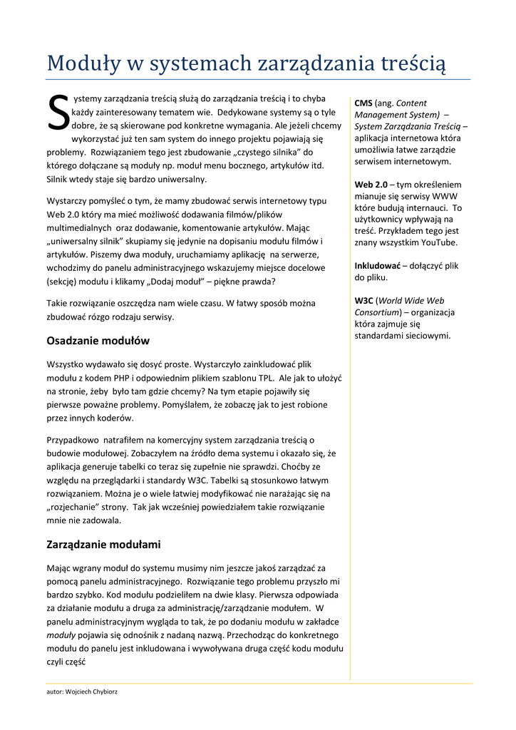 Artykuł miał na celu przedstawienie mojego sposobu zarządzania modułami w CMS’ach. Celowo nie