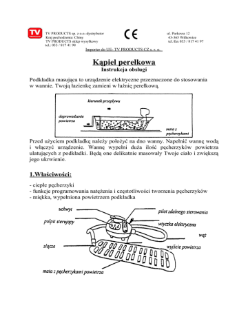 TV PRODUCTS sp. z o.o.-dystrybutor Kraj pochodzenia: Chiny TV PRODUCTS sklep wysyłkowy tel.: 033 / 817 41 98 ul. Parkowa 12 43-365 Wilkowice tel./fax 033 / 817 41 97 Importer do UE- TV PRODUCTS CZ s. r. o. Kąpiel perełkowa Instrukcja obsługi Podkładka masująca to urządzenie elektryczne przeznaczone do stosowania w wannie. Twoją łazienkę zamieni w łaźnię perełkową. Przed użyciem podkładkę należy położyć na dno wanny. Napełnić wannę wodą i włączyć urządzenie. Wannę wypełni duża ilość pęcherzyków powietrza ulatujących z podkładki. Będą one delikatnie masowały Twoje ciało i zwiększą jego ukrwienie. 1.Właściwości: - ciepłe pęcherzyki - funkcje programowania natężenia i częstotliwości tworzenia pęcherzyków - miękka, wypełniona powietrzem podkładka Uwaga: 1. Przed pierwszym użyciem starannie przeczytać Instrukcję obsługi. 2. Nie zginać, nie ciąć i nie ciągnąć na siłę kabla zasilającego. Mogłoby dojść do jego uszkodzenia i do ewentualnego porażenia prądem. 3. Centralnej jednostki sterującej nie zbliżać do wody. 4. Jeśli dojdzie do uszkodzenia urządzenia, nie naprawiać go samodzielnie. 5. Przed użyciem skontrolować, czy napięcie elektryczne odpowiada przedstawionemu na urządzeniu. 6. Jeśli urządzenie nie jest używane, jak również w czasie naprawy i czyszczenia, musi być odłączone od źródła energii elektrycznej. 7. Zwracać uwagę na to, aby w czasie wyciągania kabla zasilającego z gniazdka, nie mieć mokrych rąk. 8. Nie wyciągać wtyczki z gniazdka zasilającego na siłę. 9. Jeśli urządzenie nie działa, to należy go wyłączyć, odłączyć od gniazdka i wysłać do naprawy. 10.Uszkodzony kabel zasilający może wymienić wyłącznie wykwalifikowany pracownik jednostki serwisowej. W przeciwnym przypadku może dojść do zagrożenia zdrowia użytkownika. 11.Urządzenia nie czyścić w wodzie. 12.Części urządzenia, w których napięcie jest wyższe niż 12 V, nie mogą się zetknąć z osobą, która przebywa w wannie. 13.Centralna jednostka sterująca (wraz z pilotem) muszą zostać umiejscowione lub przymocowane w taki sposób, aby nie spadły do wanny (wody!). 14.W czasie używania urządzenia nie kłaść na wilgotnej powierzchni. 15.Niebezpieczeństwo: Nie wymieniać samodzielnie węża. Stosować wyłącznie wąż przesłany przez dostawcę wraz z urządzeniem. 16.Po każdym użyciu wąż osuszyć. 17.W czasie używania żadnych części urządzenia nie wolno umieszczać nad wanną. 2. Uruchamianie. Podłączenie: wsunąć koniec przewodu powietrznego do otworu w jednostce centralnej i lekko obrócić w kierunku zgodnym ze wskazówkami zegara (rys. 1). Drugi koniec podłączyć do podkładki (rys. 2). Umiejscowienie: do wanny napuścić najpierw małą ilość wody i włożyć podkładkę. Podkładkę dokładnie docisnąć tak, aby przyssawki na dolnej stronie przylegały do dna. 3. Umiejscowienie zasilającej jednostki centralnej i pilota: - te dwie części urządzenia muszą zostać umieszczone w takim miejscu, aby nie doszło w żadnych okoliczności do ich kontaktu z wodą. a) uchwyt pilota zdalnego sterowania przymocować do gładkiej powierzchni przy pomocy przyssawki (na tylnej części uchwytu). b) mimo, że pilot zdalnego sterowania jest wodoszczelny, nigdy nie zanurzać go celowo w wodzie. 4. Włączanie urządzenia Napełnić wannę wodą, urządzenie podłączyć do kontaktu i włączyć (ON). - każdemu naciśnięciu przycisku towarzyszy kliknięcie. - światełko wskaźnika pokazuje wybrany program. Regulacja – pulpit sterowniczy Wybrać wymaganą funkcję urządzenia. Nacisnąć przycisk „Massage” lub „Program” ( rys. 4). „Program” „Speed” „Timer” „Heat” „Power“ „Massage” „Strenght: - 3 możliwości wyboru. - prędkość powstawania pęcherzyków. High – wysoka Medium – średnia Low – niska - wyłącznik czasowy: 15 min, 30 min, 60 min - ogrzewanie pęcherzyków - włączenie i wyłączanie urządzenia - normalny rodzaj masażu - natężenie tworzenia pęcherzyków 3 rodzaje: silne, średnie i słabe Jak używać pilota: Otworzyć tylną pokrywę pilota zdalnego sterowania i włożyć baterie. Światło podczerwone skierować na odbiornik podczerwieni pulpitu jednostki centralnej. Nacisnąć odpowiedni przycisk. Przyciski pilota zdalnego sterowania odpowiadają przyciskom na pulpicie jednostki centralnej (rys. 5). - odległość pilota od jednostki centralnej: maks. 7 m pod kątem maks. 30o. 5. Konserwacja: 1.Przechowywanie przyrządu: Po użyciu wtyczkę urządzenia wyjąć z gniazdka. Odłączyć poszczególne części urządzenia. Podkładkę wysuszyć, złożyć zgodnie z rysunkiem i włożyć z powrotem do pudełka. 2.Czyszczenie urządzenia: Zasilającej jednostki centralnej nie czyścić benzyną ani substancjami olejowymi. Nie czyścić przy pomocy szczotki nylonowej. Umyć wodą i osuszyć czystą szmatką. 6. Ewentualne komplikacje Jeśli dojdzie do uszkodzenia kabla zasilającego, natychmiast wyciągnąć go z gniazdka. Kabel zasilający wymieni dystrybutor lub specjalistyczna jednostka serwisowa. Problem Możliwa przyczyna - pęcherzyki nie powstają - urządzenie nie jest podłączone do gniazdka Rozwiązanie - włączyć wtyczkę do gniazdka - urządzenie nie jest w trybi - włączyć urządzenie pracy - zdalne sterowanie nie działa - wyładowane baterie - światło podczerwone nie zostało skierowane na port podczerwieni - skierować na port podczerwieni jednostki centralnej - wymienić baterie