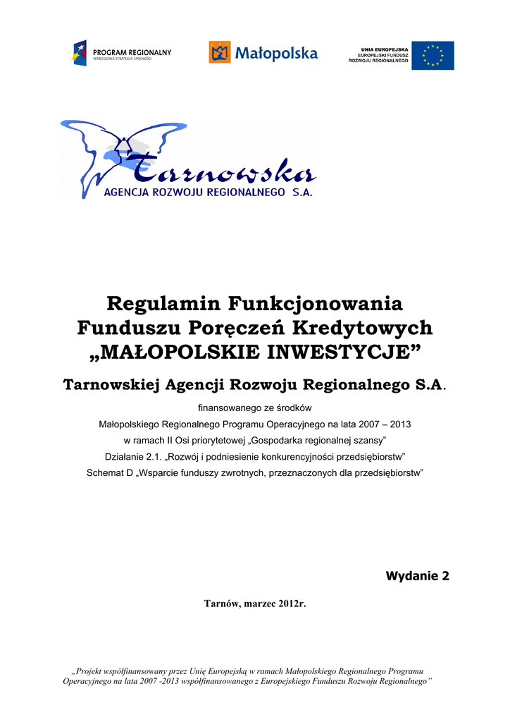 Regulamin Funkcjonowania Funduszu Poręczeń Kredytowych „MAŁOPOLSKIE INWESTYCJE” Tarnowskiej Agencji Rozwoju Regionalnego S.A. finansowanego ze środków Małopolskiego Regionalnego Programu Operacyjnego na lata 2007 – 2013 w ramach II Osi priorytetowej „Gospodarka regionalnej szansy” Działanie 2.1. „Rozwój i podniesienie konkurencyjności przedsiębiorstw” Schemat D „Wsparcie funduszy zwrotnych, przeznaczonych dla przedsiębiorstw” Wydanie 2 Tarnów, marzec 2012r. „Projekt współfinansowany przez Unię Europejską w ramach Małopolskiego Regionalnego Programu Operacyjnego na lata 2007 -2013 współfinansowanego z Europejskiego Funduszu Rozwoju Regionalnego” WSTĘP Niniejszy Regulamin określa zasady funkcjonowania oraz procedury stosowane w Funduszu Poręczeń Kredytowych - Małopolskie Inwestycje prowadzonego w ramach Tarnowskiej Agencji Rozwoju Regionalnego S.A. w Tarnowie. Głównym celem Działania 2.1 „Rozwój i podniesienie konkurencyjności przedsiębiorstw” jest stworzenie silnego i konkurencyjnego sektora małopolskich przedsiębiorstw poprzez bezpośrednią pomoc finansową dla MŚP, jak równieŜ poprzez wsparcie finansowe rozbudowy systemu zewnętrznych źródeł finansowania działalności przedsiębiorstw, w tym wsparcie tworzenia nowych i wzmacniania istniejących funduszy poręczeniowych. Celem Funduszu Poręczeń Kredytowych – Małopolskie Inwestycje jest ułatwienie przedsiębiorcom dostępu do zewnętrznego finansowania działalności gospodarczej. Fundusz Poręczeń Kredytowych – Małopolskie Inwestycje poręcza zobowiązania finansowe mikro, małych i średnich przedsiębiorstw, które posiadają zdolność kredytową, lecz nie posiadają wymaganych przez banki i inne instytucje finansujące zabezpieczeń lub nie chcą ich wykorzystać. Fundusz Poręczeń Kredytowych – Małopolskie Inwestycje został powołany Uchwałą nr 4/2010/N Nadzwyczajnego Walnego Zgromadzenia Tarnowskiej Agencji Rozwoju Regionalnego S.A. z dnia 29.10.2010 roku, jako wyodrębniony księgowo fundusz osoby prawnej. Spółka Tarnowska Agencja Rozwoju Regionalnego S.A. uznaje funkcjonowanie Funduszu Poręczeń Kredytowych – Małopolskie Inwestycje za istotny instrument wspierania działalności gospodarczej i traktuje go jako waŜny element działalności statutowej Spółki na rzecz rozwoju gospodarczego regionu. Tarnowska Agencja Rozwoju Regionalnego S.A. spełnia wymogi normy PN-EN ISO 9001:2001 (identycznej z ISO 9001:2000), co potwierdza Certyfikat Systemu Zarządzania Jakością w zakresie „realizacja przedsięwzięć stymulujących rozwój społeczny i gospodarczy regionu”. W Spółce obowiązuje Księga Jakości określająca Politykę Jakości i organizację Spółki oraz prezentująca elementy wdroŜonego systemu zarządzania jakością w oparciu o zidentyfikowane obszary działalności –procesy. Rozdział 1 . Postanowienia ogólne. § 1. 1. Ilekroć w Regulaminie jest mowa o: 1) Funduszu Poręczeń Kredytowych- Małopolskie Inwestycje (zwanym dalej Funduszem) naleŜy przez to rozumieć wyodrębniony księgowo fundusz Tarnowskiej Agencji Rozwoju Regionalnego S.A. słuŜący zabezpieczeniu kredytów i poŜyczek, 2) Zarządzie – naleŜy przez to rozumieć Zarząd Tarnowskiej Agencji Rozwoju Regionalnego S.A., 3) Radzie Nadzorczej – naleŜy przez to rozumieć Radę Nadzorczą Tarnowskiej Agencji Rozwoju Regionalnego S.A., 4) TARR S.A. - naleŜy przez to rozumieć Tarnowską Agencję Rozwoju Regionalnego S.A., 5) Komisji do Spraw Poręczeń i PoŜyczek (zwanej dalej Komisją) - naleŜy przez to rozumieć stałą Komisję działającą w ramach Tarnowskiej Agencji Rozwoju Regionalnego S.A. w Tarnowie dokonującą ostatecznej analizy składanych wniosków o udzielenie poręczenia, 2 „Projekt współfinansowany przez Unię Europejską w ramach Małopolskiego Regionalnego Programu Operacyjnego na lata 2007 -2013 współfinansowanego z Europejskiego Funduszu Rozwoju Regionalnego” 6) Zespole ds. Funduszy PoŜyczkowych i Poręczeniowych (zwanym dalej Zespołem) – naleŜy przez to rozumieć Zespół działający w ramach Tarnowskiej Agencji Rozwoju Regionalnego S.A., zajmujący się wstępną weryfikacją składanych wniosków o udzielenie poręczenia, 7) Wnioskodawcy – naleŜy przez to rozumieć przedsiębiorcę składającego wniosek o udzielenie poręczenia przez TARR S.A., 8) Mikro, małym, średnim przedsiębiorcy / przedsiębiorstwie (zwanymi dalej łącznie MŚP) – naleŜy przez to rozumieć odpowiednio mikro, małe lub średnie przedsiębiorstwo spełniające warunki określone w Załączniku I do Rozporządzenia Komisji (WE) Nr 800/2008 z dnia 6 sierpnia 2008 roku uznającego niektóre rodzaje pomocy za zgodne ze wspólnym rynkiem w zastosowaniu art. 87 i 88 Traktatu (ogólne rozporządzenie w sprawie wyłączeń blokowych), (Dz.Urz. UE L214 z 09.08.2008, PL t.51, s.3), 9) Regulaminie – naleŜy przez to rozumieć Regulamin Funduszu Poręczeń Kredytowych – Małopolskie Inwestycje działającego w ramach Tarnowskiej Agencji Rozwoju Regionalnego S.A. 10) Projekcie – naleŜy przez to rozumieć projekt realizowany przez TARR S.A. w ramach umowy zawartej na podstawie wniosku o dofinansowanie projektów ze środków Małopolskiego Regionalnego Programu Operacyjnego na lata 2007 – 2013 w ramach II Osi priorytetowej „Gospodarka regionalnej szansy”, Działanie 2.1 „Rozwój i podniesienie konkurencyjności przedsiębiorstw”, Schemat D „Wsparcie funduszy zwrotnych, przeznaczonych dla przedsiębiorstw”. 11) Umowie o udzielenie poręczenia – umowa zawierana przez TARR S.A. z przedsiębiorcą/wnioskodawcą określająca warunki poręczenia oraz zobowiązania wnioskodawcy, po spełnieniu których TARR S.A. udzieli poręczenia . 2. Określone powyŜej terminy mają zastosowanie do całości dokumentacji formalnoprawnej dotyczącej udzielania poręczeń przez TARR S.A. w ramach Funduszu. 3. Wzory dokumentów o jakich jest mowa