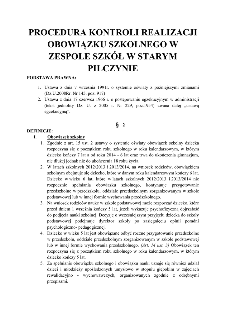 PROCEDURA KONTROLI REALIZACJI OBOWIĄZKU SZKOLNEGO W ZESPOLE SZKÓŁ W STARYM PILCZYNIE PODSTAWA PRAWNA: 1. Ustawa z dnia 7 września 1991r. o systemie oświaty z późniejszymi zmianami (Dz.U.2008Rr. Nr 145, poz. 917) 2. Ustawa z dnia 17 czerwca 1966 r. o postępowaniu egzekucyjnym w administracji (tekst jednolity Dz. U. z 2005 r. Nr 229, poz.1954) zwana dalej „ustawą egzekucyjną”. § 2 DEFINICJE: I. Obowiązek szkolny 1. Zgodnie z art. 15 ust. 2 ustawy o systemie oświaty obowiązek szkolny dziecka rozpoczyna się z początkiem roku szkolnego w roku kalendarzowym, w którym dziecko kończy 7 lat a od roku 2014 - 6 lat oraz trwa do ukończenia gimnazjum, nie dłużej jednak niż do ukończenia 18 roku życia. 2. W latach szkolnych 2012/2013 i 2013/2014, na wniosek rodziców, obowiązkiem szkolnym obejmuje się dziecko, które w danym roku kalendarzowym kończy 6 lat. Dziecko w wieku 6 lat, które w latach szkolnych 2012/2013 i 2013/2014 nie rozpocznie spełniania obowiązku szkolnego, kontynuuje przygotowanie przedszkolne w przedszkolu, oddziale przedszkolnym zorganizowanym w szkole podstawowej lub w innej formie wychowania przedszkolnego. 3. Na wniosek rodziców naukę w szkole podstawowej może rozpocząć dziecko, które przed dniem 1 września kończy 5 lat, jeżeli wykazuje psychofizyczną dojrzałość do podjęcia nauki szkolnej. Decyzję o wcześniejszym przyjęciu dziecka do szkoły podstawowej podejmuje dyrektor szkoły po zasięgnięciu opinii poradni psychologiczno- pedagogicznej. 4. Dziecko w wieku 5 lat jest obowiązane odbyć roczne przygotowanie przedszkolne w przedszkolu, oddziale przedszkolnym zorganizowanym w szkole podstawowej lub w innej formie wychowania przedszkolnego. (Art. 14 ust. 3) Obowiązek ten rozpoczyna się z początkiem roku szkolnego w roku kalendarzowym, w którym dziecko kończy 5 lat. 5. Za spełnianie obowiązku szkolnego i obowiązku nauki uznaje się również udział dzieci i młodzieży upośledzonych umysłowo w stopniu głębokim w zajęciach rewalidacyjno - wychowawczych, organizowanych zgodnie z odrębnymi przepisami. PROCEDURA KONTROLI REALIZACJI OBOWIĄZKU SZKOLNEGO W ZESPOLE SZKÓŁ W STARYM PILCZYNIE 6. Obowiązek szkolny spełnia się przez uczęszczanie do przedszkola, szkoły podstawowej i gimnazjum, publicznych oraz niepublicznych. II. Niespełnianie obowiązku szkolnego 1. Przez niespełnienie obowiązku szkolnego i nauki rozumie się nieusprawiedliwioną nieobecność w okresie jednego miesiąca, na co najmniej 50% obowiązkowych zajęciach edukacyjnych w szkole podstawowej, gimnazjum, szkole ponadgimnazjalnej lub placówce. § 3 CELE: 1. Zapewnienie umiejętnych i profesjonalnych działań nauczycieli w przypadku nieobecności ucznia w szkole. 2. Zapobieganie przypadkom wagarów szkolnych, unikania przez ucznia wybranych zajęć, niezrealizowanie obowiązku szkolnego. § 4 § 5 OSOBY ODPOWIEDZIALNE: 1. Dyrektor/Wicedyrektor 2. Wychowawcy klas/Nauczyciele 3. Pedagog/ Psycholog szkolny 4. Rodzice WYTYCZNE OGÓLNE: I. Zgodnie z art.15 ustawy o systemie oświaty nauka jest obowiązkowa do ukończenia 18 roku życia. 1. Obecność na zajęciach monitorują wychowawcy poszczególnych klas systematycznie obliczając miesięczną frekwencję ucznia na zajęciach lekcyjnych, w terminie do 15 dnia następnego miesiąca. 2. W przypadku nieusprawiedliwienia przez rodziców/opiekunów prawnych ucznia nieobecność w okresie jednego miesiąca, na co najmniej 50% obowiązkowych zajęciach edukacyjnych, wychowawca wzywa rodzica/opiekuna prawnego do stawiennictwa osobistego w celu wyjaśnienia przyczyny nieobecności. 3. W przypadku niedostarczenia pisemnego usprawiedliwienia przez rodzica/opiekuna prawnego nieobecności ucznia na zajęciach w terminie 14 dni od czasu poinformowania przez wychowawcę oraz braku zobowiązania do dopilnowania systematycznego uczęszczania ucznia na zajęcia lekcyjne, wychowawca informuje pedagoga szkolnego lub psychologa szkolnego, który podejmuje działania zgodne z § 8 4. W przypadku nieskuteczności działań niniejszego Regulaminu, pedagog szkolny lub psycholog szkolny informuje Dyrektora Szkoły, a następnie zostają wszczęte procedury zgodnie z § 9 punkt II niniejszego Regulaminu. 2 PROCEDURA KONTROLI REALIZACJI OBOWIĄZKU SZKOLNEGO W ZESPOLE SZKÓŁ W STARYM PILCZYNIE 5. W sytuacji pisemnego usprawiedliwienia przez rodzica/opiekuna prawnego nieobecności ucznia na zajęciach oraz zobowiązania do dopilnowania systematycznego uczęszczania ucznia na zajęcia lekcyjne, postępowanie zostaje zakończone. II. Zgodnie z art. 20 ustawy o systemie oświaty niespełnienie obowiązku szkolnego i nauki podlega egzekucji w trybie przepisów o postępowaniu egzekucyjnym w administracji. III. Na gruncie ustawy egzekucyjnej obowiązek szkolny i obowiązek nauki należą do kategorii obowiązków o charakterze niepieniężnym ( art.2 § 1 pkt. 10) Brzmienie artykułu 2 §1 pkt10 „obowiązki o charakterze niepieniężnym pozostające we właściwości organów administracji rządowej i samorządu terytorialnego lub przekazane do egzekucji administracyjnej na podstawie przepisu szczególnego” (Ustawa egzekucyjna) IV. Środkiem przymuszającym do wyegzekwowania obowiązku szkolnego i obowiązku nauki jest grzywna w celu przymuszenia. V. Grzywny nie stosuje się wobec ucznia, jako osoby małoletniej. Zgodnie z art. 120 § 2 ustawy egzekucyjnej, nieuczęszczanie dziecka do szkoły skutkować będzie nałożeniem grzywny na jego przedstawicieli ustawowych. Tym samym egzekwowany będzie rodzicielski obowiązek zapewnienia regularnego uczęszczania dziecka na zajęcia. Brzmienie artykułu 120 § 2. „Gdy zobowiązanym jest osoba fizyczna działająca przez ustawowego przedstawiciela, przedsiębiorstwo państwowe lub inna państwowa jednostka organizacyjna, organizacja spółdzielcza, samorządowa, zawodowa lub inna społeczna osoba prawna lub jednostka organizacyjna nieposiadająca osobowości prawnej, grzywnę nak