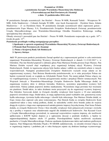 Protokół nr 15/2016 z posiedzenia Zarządu Warmińsko-Mazurskiej Izby Rolniczej z Przewodniczącymi Rad Powiatowych i Komisji z dnia 21 października 2016 roku W posiedzeniu Zarządu uczestniczyli: Jan Heichel – Prezes W-MIR, Romuald Tański – Wiceprezes WMIR, Zofia Stankiewicz - Członek Zarządu W-MIR, oraz Jacek Kuczajowski – Dyrektor biura, Jolanta Mackiewicz – Z- ca Dyrektora biura. W posiedzeniu Zarządu uczestniczyli także zaproszeni goście : przedstawiciele Expo Mazury. S.A, Przedstawiciele Związków Hodowlanych Zwierząt, przedstawiciele Urzędu Marszałkowskiego oraz Warmińsko-Mazurskiego Ośrodka Doradztwa Rolniczego według sporządzonej listy obecności. Obrady otworzył i prowadził pan Jan Heichel – Prezes W-MIR. Posiedzenie rozpoczęło się o godz. 10 00 i trwało do godz. 1530 . Posiedzenie przebiegło według następującego porządku: 1.Spotkanie w sprawie organizacji Warmińsko-Mazurskiej Wystawy Zwierząt Hodowlanych 2.Wnioski Rad Powiatowych i Komisji 2. Pisma z Krajowej Rady Izb Rolniczych 3. Sprawy bieżące Ad.1 W pierwszym punkcie posiedzenia Zarząd spotkał się z zaproszonymi gośćmi w celu omówienia organizacji Warmińsko-Mazurskiej Wystawy Zwierząt Hodowlanych w dniach 11-12.02.2017 r. w Ostródzie. Pan Jan Heichel poprosił o zabranie głosu Pana Mariusza Dziubę prezesa Expo Mazury. Pan Mariusz Dziuba wyraził chęć współpracy przy organizacji kolejnej edycji Wystawy Zwierząt Hodowlanych. Dodał, że tegoroczna edycja była bardzo udana i odbiła się szerokich echem w innych województwach. Następnie przedstawiciele Związków Hodowców wyrazili swoje zdanie co do organizowanej wystawy. Pani Bożena Burakowska poinformowała, ze w roku przyszłym Polsus nie będzie wystawiał trzody ze względu na Afrykański Pomór Świń. Nie mniej jednak Polsus włączy się we współorganizację wystawy w formie przygotowania stoiska i projekcji filmów tematycznych. Pan Wojciech Jończyk z Warmińsko-Mazurskiego Związku Hodowców Bydła Mlecznego dodał, że organizacja wystawy idzie w dobrym kierunku. Hodowcy, uczestnicy poprzedniej wystawy byli zadowoleni. Należy jednak poprawić drobne mankamenty. Wyścielenie ringu powinno być trocinami nie piaskiem. Dodał także, że takie działanie może przyczynić się do organizacji wystawy krajowej. Pan Zdzisław Szewczak dodał, że Związek chciałby zwiększyć ilość kojców o 10 oraz należałoby poprawić oświetlenie ringu. Dodał także, że mają zaplanowany panel wykładów dot. genomowej oceny bydła mlecznego, żywienia bydła mlecznego i chorób była mlecznego. Pan Mariusz Dziuba dodał, ze Expo Arena chce zaprosić cały pion weterynaryjny. Pan Henryk Kuhn ze związku Hodowców Koni zaapelował także o inny rodzaj podłoża, dodał, że należałoby zrobić dwie bramki jedna do wejścia drugą do wyjścia z ringu oraz zaproponował uatrakcyjnienie imprezy bryczką konną. Pani Irena Żelanis dodała, ze związek Hodowców Owiec i Kóz chciałby zwiększyć ilość pokazowych zwierząt i zwróciła się z prośbą o wsparcie oraz ufundowanie nagród dla dodatkowych hodowców. Pan Ryszard Cecot z Urzędu Marszałkowskiego powiedział, że samorząd województwa wspiera imprezę, ale możliwość aplikowania z KSOW będzie dopiero p o ogłoszeniu decyzji o podziale środków, a będzie to najprawdopodobniej dopiero około 15 grudnia. Prawdopodobnie będzie możliwość uzyskania pucharów z Urzędu Marszałkowskiego. Podczas spotkania dyskutowano także nad znakiem graficznym imprezy. Pani Małgorzata Micińska Wąsik z W-MODR zadeklarowała, że ośrodek również włączy się w organizację imprezy i podobnie jak w roku bieżącym zajmie się drukiem katalogu wystawowego. Pan Jan Heichel – Prezes W-MIR poinformował Związki, że podobnie jak w roku bieżącym będzie wnioskował o wręczenie odznak Zasłużony dla rolnictwa, w związku z czym poprosił o przygotowanie stosownych wniosków przez poszczególne Związki. Ad 2 Po zakończeniu spotkania Zarząd przeszedł do realizacji kolejnych punktów porządku obrad. Zapoznano się z wnioskami napływającymi z Rad Powiatowych Rada Powiatowa W-MIR w powiecie szczycieńskim - Rada Powiatowa W-MIR w powiecie szczycieńskim wnioskuje o przeznaczenia kwoty w wysokości do 350 zł pozostających w dyspozycji rady na poczet najmu sali na posiedzenie rady powiatowej, która odbędzie się w dniu 18 października 2016 r. w Szczytnie. - Zarząd podjął uchwałę o rozdysponowaniu środków będą cych w Dyspozycji Rady powiatowej W-MIR w powiecie szczycieńskim. Rada Powiatowa W-MIR w powiecie nidzickim - Rada Powiatowa W-MIR w powiecie nidzic kim wnioskuje o przeznaczenia kwoty w wysokości do 300 zł pozostających w dyspozycji rady na poczet najmu sali na zebranie rolników i instytucji, które odbędzie się w dniu 21 października 2016 r. w Nidzicy. - Zarząd podjął uchwałę o rozdysponowaniu środków będących w dyspozycji Rady Powiatowej W-MIR w powiecie nidzickim Rada Powiatowa W-MIR w Powiecie Iławskim wnioskuje o wystosowanie pisma do Minister stwa Rolnictwa i Rozwoju Wsi w sprawie zwiększenia dofinansowania do składek na ubezpiecze nia upraw rolnych. - Zarząd W-MIR poinformował, że pismo w sprawie zwiększenia dofinansowa nia zostało wysłane do KRIR w październiku br. Rada Powiatowa W-MIR w Powiecie Iławskim zwraca się z prośbą o dofinansowanie szóstego posiedzenia Rady Powiatowej W-MIR. - Zarząd poinformował, że rada może zorganizować szóste posiedzenie- jeśli rada posiada środki niewykorzystane na organizację pięciu wcześniejszych posie dzeń rady. Rada Powiatowa W-MIR w Powiecie ostródzkim zwraca się z prośbą do Zarządu W-MIR o podjęcie uchwały w sprawie przekazania kwoty 1500 zł ze środków będących w dyspozycji Rady Powiatowej na pokrycia kosztów organizacji dożynek Powiatowych, które odbyły się w Ostródzie w dniu 11 września 2016r. - Zarząd podjął uchwałę o rozdy