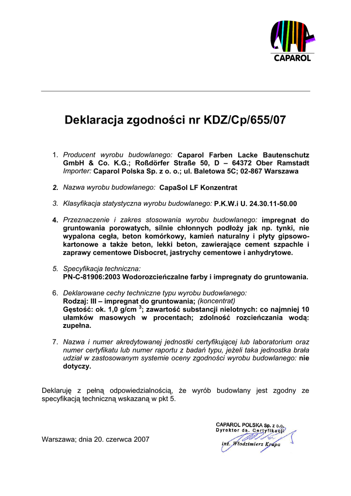 Deklaracja zgodności nr KDZ/Cp/655/07 1. Producent wyrobu budowlanego: Caparol Farben Lacke Bautenschutz GmbH & Co. K.G.; Roßdörfer Straße 50, D – 64372 Ober Ramstadt Importer: Caparol Polska Sp. z o. o.; ul. Baletowa 5C; 02-867 Warszawa 2. Nazwa wyrobu budowlanego: CapaSol LF Konzentrat 3. Klasyfikacja statystyczna wyrobu budowlanego: P.K.W.i U. 24.30.11-50.00 4. Przeznaczenie i zakres stosowania wyrobu budowlanego: impregnat do gruntowania porowatych, silnie chłonnych podłoży jak np. tynki, nie wypalona cegła, beton komórkowy, kamień naturalny i płyty gipsowokartonowe a także beton, lekki beton, zawierające cement szpachle i zaprawy cementowe Disbocret, jastrychy cementowe i anhydrytowe. 5. Specyfikacja techniczna: PN-C-81906:2003 Wodorozcieńczalne farby i impregnaty do gruntowania. 6. Deklarowane cechy techniczne typu wyrobu budowlanego: Rodzaj: III – impregnat do gruntowania; (koncentrat) Gęstość: ok. 1,0 g/cm 3; zawartość substancji nielotnych: co najmniej 10 ułamków masowych w procentach; zdolność rozcieńczania wodą: zupełna. 7. Nazwa i numer akredytowanej jednostki certyfikującej lub laboratorium oraz numer certyfikatu lub numer raportu z badań typu, jeżeli taka jednostka brała udział w zastosowanym systemie oceny zgodności wyrobu budowlanego: nie dotyczy. Deklaruję z pełną odpowiedzialnością, że wyrób budowlany jest zgodny ze specyfikacją techniczną wskazaną w pkt 5. Warszawa; dnia 20. czerwca 2007 ............. ....... ..............