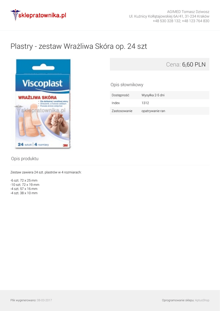 AGIMED Tomasz Dziwosz Ul. Kuźnicy Kołłątajowskiej 6A/41, 31-234 Kraków +48 530 328 132; +48 123 764 830 Plastry - zestaw Wrażliwa Skóra op. 24 szt Cena: 6,60 PLN Opis słownikowy Dostępność Wysyłka 2-5 dni Index 1312 Zastosowanie opatrywanie ran Opis produktu Zestaw zawiera 24 szt. plastrów w 4 rozmiarach: -6 szt. 72 x 25 mm -10 szt. 72 x 19 mm -4 szt. 57 x 16 mm -4 szt. 38 x 10 mm Plik wygenerowano: 08-03-2017 Powered by TCPDF (www.tcpdf.org) Oprogramowanie sklepu: AptusShop