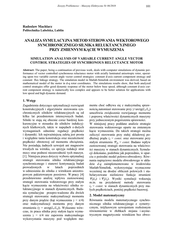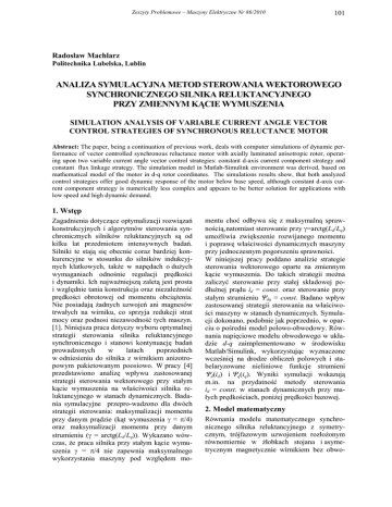 Zeszyty Problemowe – Maszyny Elektryczne Nr 86/2010 101 Radosław Machlarz Politechnika Lubelska, Lublin ANALIZA SYMULACYJNA METOD STEROWANIA WEKTOROWEGO SYNCHRONICZNEGO SILNIKA RELUKTANCYJNEGO PRZY ZMIENNYM KĄCIE WYMUSZENIA SIMULATION ANALYSIS OF VARIABLE CURRENT ANGLE VECTOR CONTROL STRATEGIES OF SYNCHRONOUS RELUCTANCE MOTOR Abstract: The paper, being a continuation of previous work, deals with computer simulations of dynamic performance of vector controlled synchronous reluctance motor with axially laminated anisotropic rotor, operating upon two variable current angle vector control strategies: constant d-axis current component strategy and constant flux linkage strategy. The simulation model in Matlab-Simulink environment was derived, based on mathematical model of the motor in d-q rotor coordinates. The simulations results show, that both analyzed control strategies offer good dynamic response of the motor below base speed, although constant d-axis current component strategy is numerically less complex and appears to be better solution for applications with low speed and high dynamic demand. 1. Wstęp Zagadnienia dotyczące optymalizacji rozwiązań konstrukcyjnych i algorytmów sterowania synchronicznych silników reluktancyjnych są od kilku lat przedmiotem intensywnych badań. Silniki te stają się obecnie coraz bardziej konkurencyjne w stosunku do silników indukcyjnych klatkowych, takŜe w napędach o duŜych wymaganiach odnośnie regulacji prędkości i dynamiki. Ich najwaŜniejszą zaletą jest prosta i względnie tania konstrukcja oraz niezaleŜność prędkości obrotowej od momentu obciąŜenia. Nie posiadają Ŝadnych uzwojeń ani magnesów trwałych na wirniku, co sprzyja redukcji strat mocy oraz podnosi niezawodność tych maszyn. [1]. Niniejsza praca dotyczy wyboru optymalnej strategii sterowania silnika reluktancyjnego synchronicznego i stanowi kontynuację badań prowadzonych w latach poprzednich w odniesieniu do silnika z wirnikiem anizotropowym pakietowanym poosiowo. W pracy [4] przedstawiono analizę wpływu zastosowanej strategii sterowania wektorowego przy stałym kącie wymuszenia na właściwości silnika reluktancyjnego w stanach dynamicznych. Badania symulacyjne przepro-wadzono dla dwóch strategii sterowania: maksymalizacji momentu przy danym prądzie (kąt wymuszenia γ = π/4) oraz maksymalizacji momentu przy danym strumieniu (γ = arctg(Ld/Lq)). Wykazano wówczas, Ŝe praca silnika przy stałym kącie wymuszenia γ = π/4 nie zapewnia maksymalnego wykorzystania maszyny pod względem mo- mentu choć odbywa się z maksymalną sprawnością, natomiast sterowanie przy γ=arctg(Ld/Lq) umoŜliwia zwiększenie rozwijanego momentu i poprawę właściwości dynamicznych maszyny przy jednoczesnym pogorszeniu sprawności. W niniejszej pracy poddano analizie strategie sterowania wektorowego oparte na zmiennym kącie wymuszenia. Do takich strategii moŜna zaliczyć sterowanie przy stałej składowej podłuŜnej prądu id = const. oraz sterowanie przy stałym strumieniu Ψdq = const. Badano wpływ zastosowanej strategii sterowania na właściwości maszyny w stanach dynamicznych. Symulacji dokonano, podobnie jak poprzednio, w oparciu o pośredni model polowo-obwodowy. Równania napięciowe modelu obwodowego w układzie d-q zaimplementowano w środowisku Matlab/Simulink, wykorzystując wyznaczone wcześniej na drodze obliczeń polowych i stabelaryzowane nieliniowe funkcje strumieni Ψd(id) i Ψq(iq). Wyniki symulacji wskazują m.in. na przydatność metody sterowania id = const. w stanach dynamicznych przy małych prędkościach, poniŜej prędkości bazowej. 2. Model matematyczny Równania modelu matematycznego synchronicznego silnika reluktancyjnego z symetrycznym, trójfazowym uzwojeniem rozłoŜonym równomiernie w Ŝłobkach stojana i asymetrycznym magnetycznie wirnikiem bez obwo- 102 Zeszyty Problemowe – Maszyny Elektryczne Nr 86/2010 dów tłumiących, z pominięciem strat w Ŝelazie, w układzie wirującym d-q, mają postać: [2] dΨ d u d = RS id + dt − Ω rΨ q (iq ) dΨ q u q = RS iq + + Ω rΨ d (id ) dt (1) 3 Te = 2 p(Ψ d (id )iq −Ψ q (iq )id ) dΩ r + Td + T0 = Te J dt Występujące w tych równaniach składowe strumienia skojarzonego Ψd(id) oraz Ψq(iq) są nieliniowymi funkcjami odpowiednich składowych prądu. Szczegółowy opis sposobu wyznaczenia nieliniowych funkcji strumieni w osi d i q w zaleŜności od odpowiednich wymuszeń prądowych znajduje się w pracy [3]. Po wprowadzeniu indukcyjności synchronicznych Ld i Lq takich, Ŝe: Ψ d (id ) = Ld (id )id , (2) Ψ q (iq ) = Lq (iq )iq równania modelu matematycznego przybierają postać: did u d = RS id + Ld dt − Ω r Lq (iq )iq di u q = RS iq + Lq q + Ω r Ld (id )id dt 3 Te = 2 p (Ld (id ) − Lq (iq ) )id iq dΩ r + Td + T0 = Te J dt (3) Symbole uŜyte w równaniach (1) do (3) oznaczają: ud, uq – składowe napięcia w osiach d i q, id, iq – składowe prądu w osiach d i q, Rs – rezystancja stojana, Ωr – prędkość kątowa wirnika, Ψd(id), Ψq(iq) – składowe strumienia skojarzonego w osiach d i q, Ld(id), Lq(iq) – indukcyjności synchroniczne osiach d i q, będące nieliniowymi funkcjami odpowiednich prądów, Te – moment elektromagnetyczny, T0 – moment obciąŜenia, Td – moment tarcia lepkiego. ZaleŜności przestrzenno-czasowe zachodzące pomiędzy wielkościami uwzględnionymi w modelu, w stanie ustalonym, ilustruje wykres fazorowy przedstawiony na rys. 1. jq U RsIdq jΩ uq −Ωr ψq ψdq jΩ r ψd Θ r Idq iq θ ψdq ϕ γ ud ψq j δ id ψd d Rys. 1. Wykres fazorowy synchronicznego silnika reluktancyjnego W celu uproszczenia analizy teoretycznej dotyczącej metod sterowania silnika reluktancyjnego załoŜono, Ŝe wymuszenie prądowe silnika będzie ograniczone do poziomu nie powodującego nasycania się obwodu magnetycznego maszyny. Dzięki temu indukcyjności Ld i Lq moŜna uwaŜać w przybliŜeniu za wielkości stałe. 3. Strategie sterowania SynRM prz