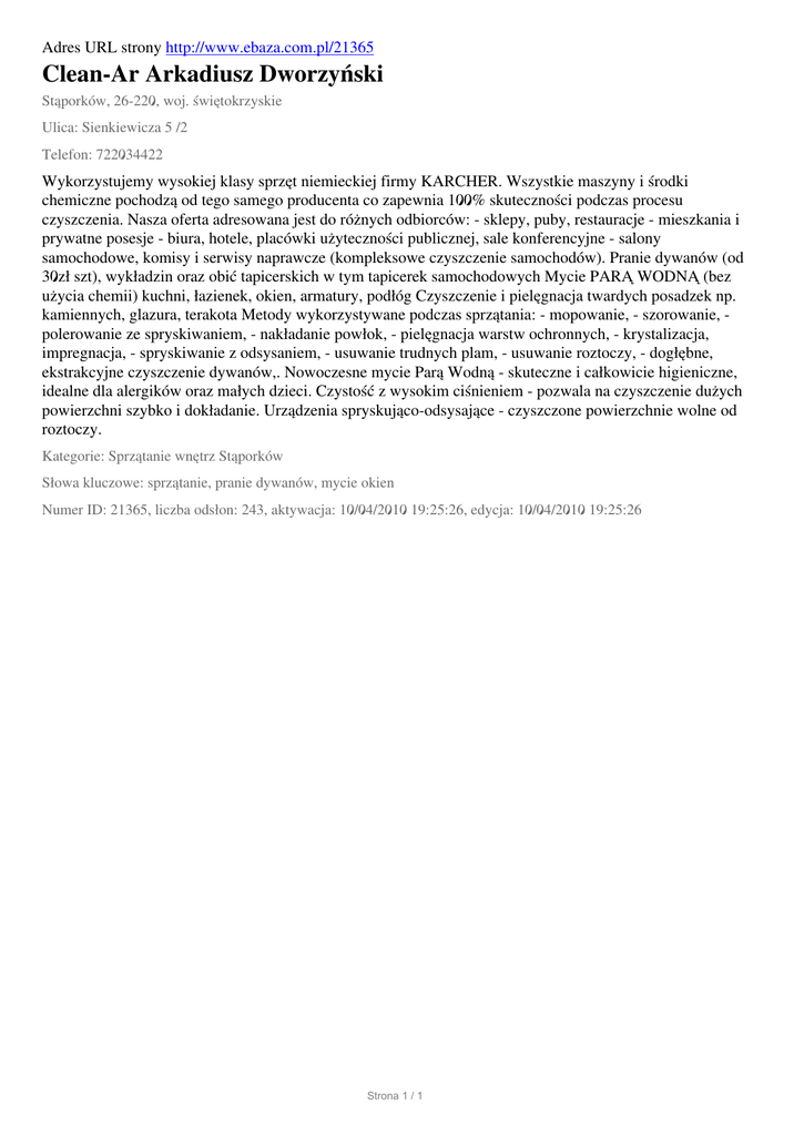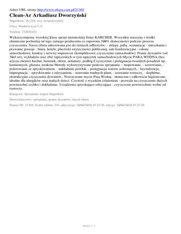 Adres URL strony http://www.ebaza.com.pl/21365 Clean-Ar Arkadiusz Dworzyński Stąporków, 26-220, woj. świętokrzyskie Ulica: Sienkiewicza 5 /2 Telefon: 722034422 Wykorzystujemy wysokiej klasy sprzęt niemieckiej firmy KARCHER. Wszystkie maszyny i środki chemiczne pochodzą od tego samego producenta co zapewnia 100% skuteczności podczas procesu czyszczenia. Nasza oferta adresowana jest do różnych odbiorców: - sklepy, puby, restauracje - mieszkania i prywatne posesje - biura, hotele, placówki użyteczności publicznej, sale konferencyjne - salony samochodowe, komisy i serwisy naprawcze (kompleksowe czyszczenie samochodów). Pranie dywanów (od 30zł szt), wykładzin oraz obić tapicerskich w tym tapicerek samochodowych Mycie PARĄ WODNĄ (bez użycia chemii) kuchni, łazienek, okien, armatury, podłóg Czyszczenie i pielęgnacja twardych posadzek np. kamiennych, glazura, terakota Metody wykorzystywane podczas sprzątania: - mopowanie, - szorowanie, polerowanie ze spryskiwaniem, - nakładanie powłok, - pielęgnacja warstw ochronnych, - krystalizacja, impregnacja, - spryskiwanie z odsysaniem, - usuwanie trudnych plam, - usuwanie roztoczy, - dogłębne, ekstrakcyjne czyszczenie dywanów,. Nowoczesne mycie Parą Wodną - skuteczne i całkowicie higieniczne, idealne dla alergików oraz małych dzieci. Czystość z wysokim ciśnieniem - pozwala na czyszczenie dużych powierzchni szybko i dokładanie. Urządzenia spryskująco-odsysające - czyszczone powierzchnie wolne od roztoczy. Kategorie: Sprzątanie wnętrz Stąporków Słowa kluczowe: sprzątanie, pranie dywanów, mycie okien Numer ID: 21365, liczba odsłon: 243, aktywacja: 10/04/2010 19:25:26, edycja: 10/04/2010 19:25:26 Strona 1 / 1