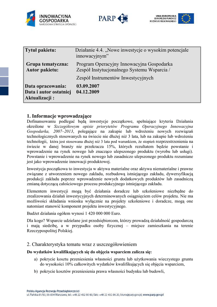 Tytuł pakietu: Działanie 4.4. „Nowe inwestycje o wysokim potencjale innowacyjnym” Grupa tematyczna: Autor pakietu: Program Operacyjny Innowacyjna Gospodarka Zespół Instytucjonalnego Systemu Wsparcia / Zespół Instrumentów Inwestycyjnych Data opracowania: Data i autor ostatniej Aktualizacji : 03.09.2007 04.12.2009 1. Informacje wprowadzające Dofinansowaniu podlegać będą inwestycje początkowe, spełniające kryteria Działania określone w Szczegółowym opisie priorytetów Programu Operacyjnego Innowacyjna Gospodarka, 2007–2013, polegające na zakupie lub wdrożeniu nowych rozwiązań technologicznych stosowanych na świecie nie dłużej niż 3 lata, lub na zakupie lub wdrożeniu technologii, która jest stosowana dłużej niż 3 lata pod warunkiem, że stopień rozprzestrzenienia na świecie w danej branży nie przekracza 15%, których rezultatem będzie powstanie i wprowadzenie na rynek nowego lub znacząco ulepszonego produktu (wyrobu lub usługi). Powstanie i wprowadzenie na rynek nowego lub zasadniczo ulepszonego produktu rozumiane jest jako wprowadzenie innowacji produktowej. Inwestycja początkowa to inwestycja w aktywa materialne oraz aktywa niematerialne i prawne związane z utworzeniem nowego zakładu, rozbudową istniejącego zakładu, dywersyfikacją produkcji zakładu poprzez wprowadzenie nowych dodatkowych produktów lub zasadniczą zmianą dotyczącą całościowego procesu produkcyjnego istniejącego zakładu. Elementem inwestycji mogą być działania doradcze lub szkoleniowe niezbędne do zrealizowania działań inwestycyjnych determinowanych osiągnięciem celów projektu. Nie ma możliwości składania wniosku wyłącznie na projekty szkoleniowe i doradcze, mogą one natomiast stanowić komponent projektu inwestycyjnego. Budżet działania ogółem wynosi 1 420 000 000 Euro. Dla kogo? Wsparcie udzielane jest przedsiębiorcom, którzy prowadzą działalność gospodarczą i mają siedzibę, a w przypadku osoby fizycznej – miejsce zamieszkania na terenie Rzeczypospolitej Polskiej. 2. Charakterystyka tematu wraz z uszczegółowieniem Do wydatków kwalifikujących się do objęcia wsparciem zalicza się: a) pokrycie kosztu przeniesienia własności gruntu lub użytkowania wieczystego gruntu do wysokości 10% całkowitych wydatków kwalifikujących się objęcia wsparciem, b) pokrycie kosztów przeniesienia prawa własności budynku lub budowli, c) cenę nabycia albo koszt wytworzenia środków trwałych innych niż określone w pkt a i b z zastrzeżeniem pkt 1, d) cenę nabycia robót i materiałów budowlanych, e) cenę nabycia wartości niematerialnych i prawnych w formie patentów, licencji, knowhow oraz nieopatentowanej wiedzy technicznej, jeżeli wartości niematerialne i prawne spełniają łącznie następujące warunki: będą wykorzystywane wyłącznie na cele projektu objętego wsparciem na inwestycje o wysokim potencjale innowacyjnym, w przedsiębiorstwie przedsiębiorcy otrzymującego wsparcie będą podlegać amortyzacji zgodnie z odrębnymi przepisami, będą nabyte od osób trzecich na warunkach rynkowych, przy czym kupujący nie sprawuje kontroli nad sprzedającym w rozumieniu art. 3 rozporządzenia Rady (WE) nr 139/2004 z dnia 20 stycznia 2004 r. w sprawie kontroli koncentracji przedsiębiorstw ani odwrotnie, będą stanowić aktywa przedsiębiorcy, który otrzymał wsparcie i pozostaną w jego przedsiębiorstwie przez co najmniej 5 lat, a w przypadku przedsiębiorstwa mikroprzedsiębiorcy, małego lub średniego przedsiębiorcy przez co najmniej 3 lata od dnia zakończenia realizacji inwestycji; f) raty spłat wartości początkowej gruntów, budynków i budowli poniesione przez korzystającego do dnia zakończenia realizacji projektu, do wysokości ich wartości początkowej z dnia zawarcia umowy leasingu albo spłatę wartości początkowej gruntów, budynków i budowli, należnej finansującemu z tytułu umowy leasingu, pod warunkiem że umowa leasingu będzie zawarta na okres co najmniej 5 lat, a w przypadku mikroprzedsiębiorcy, małego lub średniego przedsiębiorcy – co najmniej 3 lat od przewidywanego terminu zakończenia realizacji projektu, g) raty spłat wartości początkowej środków trwałych, innych niż określone w lit. f), lub wartości niematerialnych i prawnych poniesionych przez korzystającego albo spłatę wartości początkowej środków trwałych innych niż określone w ;lit. f) lub wartości niematerialnych i prawnych, należnej finansującemu z tytułu umowy leasingu prowadzącej do przeniesienia własności tych środków lub wartości niematerialnych i prawnych na korzystającego, z wyłączeniem leasingu zwrotnego, h) pokrycie kosztów związanych z najmem lub dzierżawą gruntów, budynków i budowli, poniesionych do dnia zakończenia realizacji projektu pod warunkiem. Że umowa najmu lub dzierżawy będzie zawarta na okres co najmniej 5 lat, a w przypadku mikroprzedsiębiorcy, małego lub średniego przedsiębiorcy – co najmniej 3 lat od przewidywanego terminu zakończenia realizacji projektu, i) cenę zakupu przez przedsiębiorcę, będącego mikroprzedsiębiorcą, małym lub średnim przedsiębiorcą analiz przygotowawczych i usług doradczych związanych z inwestycją, przy czym usługi te nie mogą stanowić elementu stałej lub okresowej działalności przedsiębiorcy lub być związane z bieżącymi wydatkami operacyjnymi przedsiębiorcy. j) ustanowienie lub utrzymanie zabezpieczenia należytego wykonania zobowiązań wynikających z umowy o udzielenie wsparcia; k) pokrycie kosztów związanych z otwarciem i prowadzeniem przez przedsiębiorcę odrębnego rachunku bankowego lub subkonta na rachunku bankowym, przeznaczonych do obsługi projektu lub płatności zaliczkowych; l) wydatki na zakup szkoleń specjalistycznych bezpośrednio związanych z realizacją projektu, do wysokości nieprzekraczającej 10% całkowitych wydatków kwalifikujących się do objęcia wsparciem, o których mowa w lit.