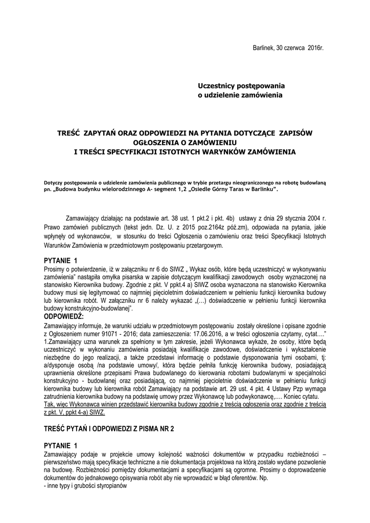 Barlinek, 30 czerwca 2016r. Uczestnicy postępowania o udzielenie zamówienia TREŚĆ ZAPYTAŃ ORAZ ODPOWIEDZI NA PYTANIA DOTYCZĄCE ZAPISÓW OGŁOSZENIA O ZAMÓWIENIU I TREŚCI SPECYFIKACJI ISTOTNYCH WARYNKÓW ZAMÓWIENIA Dotyczy postępowania o udzielenie zamówienia publicznego w trybie przetargu nieograniczonego na robotę budowlaną pn. „Budowa budynku wielorodzinnego A- segment 1,2 „Osiedle Górny Taras w Barlinku”. Zamawiający działając na podstawie art. 38 ust. 1 pkt.2 i pkt. 4b) ustawy z dnia 29 stycznia 2004 r. Prawo zamówień publicznych (tekst jedn. Dz. U. z 2015 poz.2164z póź.zm), odpowiada na pytania, jakie wpłynęły od wykonawców, w stosunku do treści Ogłoszenia o zamówieniu oraz treści Specyfikacji Istotnych Warunków Zamówienia w przedmiotowym postępowaniu przetargowym. PYTANIE 1 Prosimy o potwierdzenie, iż w załączniku nr 6 do SIWZ „ Wykaz osób, które będą uczestniczyć w wykonywaniu zamówienia” nastąpiła omyłka pisarska w zapisie dotyczącym kwalifikacji zawodowych osoby wyznaczonej na stanowisko Kierownika budowy. Zgodnie z pkt. V ppkt.4 a) SIWZ osoba wyznaczona na stanowisko Kierownika budowy musi się legitymować co najmniej pięcioletnim doświadczeniem w pełnieniu funkcji kierownika budowy lub kierownika robót. W załączniku nr 6 należy wykazać „(…) doświadczenie w pełnieniu funkcji kierownika budowy konstrukcyjno-budowlanej”. ODPOWIEDŹ: Zamawiający informuje, że warunki udziału w przedmiotowym postępowaniu zostały określone i opisane zgodnie z Ogłoszeniem numer 91071 - 2016; data zamieszczenia: 17.06.2016, a w treści ogłoszenia czytamy, cytat….” 1.Zamawiający uzna warunek za spełniony w tym zakresie, jeżeli Wykonawca wykaże, że osoby, które będą uczestniczyć w wykonaniu zamówienia posiadają kwalifikacje zawodowe, doświadczenie i wykształcenie niezbędne do jego realizacji, a także przedstawi informację o podstawie dysponowania tymi osobami, tj: a/dysponuje osobą /na podstawie umowy/, która będzie pełniła funkcję kierownika budowy, posiadającą uprawnienia określone przepisami Prawa budowlanego do kierowania robotami budowlanymi w specjalności konstrukcyjno - budowlanej oraz posiadającą, co najmniej pięcioletnie doświadczenie w pełnieniu funkcji kierownika budowy lub kierownika robót Zamawiający na podstawie art. 29 ust. 4 pkt. 4 Ustawy Pzp wymaga zatrudnienia kierownika budowy na podstawię umowy przez Wykonawcę lub podwykonawcę,…. Koniec cytatu. Tak, więc Wykonawca winien przedstawić kierownika budowy zgodnie z treścią ogłoszenia oraz zgodnie z treścią z pkt. V, ppkt 4-a) SIWZ. TREŚĆ PYTAŃ I ODPOWIEDZI Z PISMA NR 2 PYTANIE 1 Zamawiający podaje w projekcie umowy kolejność ważności dokumentów w przypadku rozbieżności – pierwszeństwo mają specyfikacje techniczne a nie dokumentacja projektowa na którą zostało wydane pozwolenie na budowę. Rozbieżności pomiędzy dokumentacjami a specyfikacjami są ogromne. Prosimy o doprowadzenie dokumentów do jednakowego opisywania robót aby nie wprowadzić w błąd oferentów. Np. - inne typy i grubości styropianów -inny sposób wykonania posadzki piwnic -ocieplenie stropu gr.15cm – brak w dokumentacji i kosztorysie -w specyfikacji ściany działowe z bloczków betonowych – brak w dokumentacji i kosztorysie -ściany klatki na strychu ocieplenie styropianem 20cm –j.w - farmy emulsyjne a niezmywalne -cokół płytki a Tyn dekoracyjny -drabiny na stopie nad klatką – brak w dok. I kosztorysie - w specyfikacji jest wykonanie pomiarów natężenia oświetlenia, wykonanie pomiarów instalacji niskoprądowych (pomiar rezystancji pary, czasu propagacji, tłumienności, przesłuchu)-brak w koszt. -słupy stalowe czy aluminiowe -w specyfikacji montaż kompletnych kabin natryskowych – dokumentacja i kosztorys zdecydowana większość to wanny - w specyfikacji demontaż instalacji CO, wod i Kan – jakich - oraz szereg innych nieścisłości ODPOWIEDŹ: Kolejność dokumentacji podana w treści umowy jest przypadkowa, Wykonawca winien przygotować ofertę i dokonać wyliczeń na podstawie dokumentacji projektowej oraz dokumentów pomocniczych jakimi są : przedmiary, specyfikacje techniczne wykonania i odbioru robót). Cokół – przyjąć tynk mozaikowy. Malowanie wewnętrzne – zastosować farby dyspersyjne tak jak opisano w dokumentacji, czyli zmywalne emulsyjne. Ściany działowe piwnic – przyjąć bloczki silikatowe. Drabiny nad klatką schodową – pkt.5.3.2 opisu PW (po 1 szt. na klatkę) Słupy oświetleniowe – przyjąć stalowe. W projekcie występują zarówno wanny jak i kabiny natryskowe. PYTANIE 2 W jakiej formie do oferty należy załączyć kosztorysy. ODPOWIEDŹ: Ponieważ rozliczenie jest ryczałtowe, Zamawiający wymaga uproszczonych kosztorysów w celu weryfikacji złożonych ofert. Dołączone do oferty kosztorysy stanowią materiał pomocniczy dla Zamawiającego. PYTANIE 3 Występują duże rozbieżności w materiałach pomiędzy STWOiR a dokumentacją – czy należy przyjąć jak w dokumentacji -grubość i rodzaj styropianu na posadzkach i suficie piwnic -w STWOIR opisany jest styropian na posadzce piwnic a w dokumentacji i kosztorysie go nie ma. ODPOWIEDŹ: Izolacje termiczne i akustyczne – rodzaj i grubość przyjąć z dokumentacji projektowej. PYTANIE 4 W opisie w architekturze wymieniony jest grzejnik łazienkowy z grzałką. Czy taki wyceniamy. ODPOWIEDŹ:Grzejnik łazienkowy – przyjąć bez grzałki. PYTANIE 5 W umowie termin wykonania do 30.06.2017 a w ogłoszeniu do 31.07.2017 ODPOWIEDŹ: Zamawiający dokonuje zmiany w treści umowy . Termin wykonania zamówienia do 31 lipca 2017, zgodnie z treścią ogłoszenia i treścią SIWZ (pkt. IV,ppkt.3) PYTANIE 6 Czy oferent ma ująć w cenie badanie w laboratorium każdej dostawy betonu. ODPOWIEDŹ: Tak, zgodnie z wymaganiami normy betonowej PN - EN 206-1 . PYTANIE 7 Czy oferent ma ująć w cenie badanie zagęszczeń wa