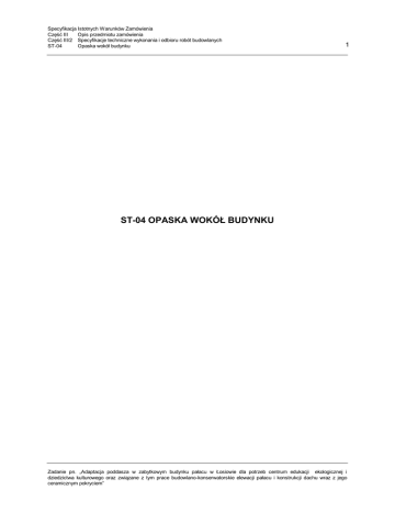 Specyfikacja Istotnych Warunków Zamówienia Część III Opis przedmiotu zamówienia Część III/2 Specyfikacje techniczne wykonania i odbioru robót budowlanych ST-04 Opaska wokół budynku 1 ST-04 OPASKA WOKÓŁ BUDYNKU Zadanie pn. „Adaptacja poddasza w zabytkowym budynku pałacu w Łosiowie dla potrzeb centrum edukacji ekologicznej i dziedzictwa kulturowego oraz związane z tym prace budowlano-konserwatorskie elewacji pałacu i konstrukcji dachu wraz z jego ceramicznym pokryciem” Specyfikacja Istotnych Warunków Zamówienia Część III Opis przedmiotu zamówienia Część III/2 Specyfikacje techniczne wykonania i odbioru robót budowlanych ST-04 Opaska wokół budynku 2 SPIS TREŚCI 1. WSTĘP ................................................................................................................................................... 4 1.1. 1.2. 1.3. 1.4. 1.5. 1.6. 2. MATERIAŁY ......................................................................................................................................... 4 2.1. 2.2. 2.3. 2.4. 2.5. 2.6. 2.7. 2.8. 2.9. 3. OGÓLNE WYMAGANIA DOTYCZĄCE TRANSPORTU ................................................................................. 9 WYKONANIE ROBÓT ......................................................................................................................... 9 5.1. 5.2. 5.3. 5.4. 5.5. 5.6. 5.7. 5.8. 5.9. 5.10. 6. OGÓLNE WYMAGANIA DOTYCZĄCE SPRZĘTU........................................................................................ 8 SPRZĘT DO WYKONYWANIA KORYTOWANIA ......................................................................................... 8 SPRZĘT DO WYKONANIA WARSTWY ODSĄCZAJĄCEJ, ODCINAJĄCEJ, MROZOODPORNEJ ............................ 9 SPRZĘT DO WYKONANIA PODBUDOWY Z KRUSZYWA ŁAMANEGO STABILIZOWANEGO MECHANICZNIE ...... 9 SPRZĘT DO WYKONYWANIA NAWIERZCHNI Z KOSTKI KAMIENNEJ .......................................................... 9 TRANSPORT ......................................................................................................................................... 9 4.1. 5. OGÓLNE WYMAGANIA DOTYCZĄCE MATERIAŁÓW ................................................................................ 4 IZOLACJA........................................................................................................................................... 5 WARSTWA ODSĄCZAJĄCA, ODCINAJĄCA, MROZOODPORNA ................................................................... 5 PODBUDOWA Z KRUSZYWA ŁAMANEGO STABILIZOWANEGO MECHANICZNIE........................................... 5 KOSTKA KAMIENNA DROGOWA ........................................................................................................... 7 KOSTKA KAMIENNA – WYMAGANIA WYTRZYMAŁOŚCIOWE ................................................................... 7 KOSTKA KAMIENNA – KSZTAŁT I WYMIARY .......................................................................................... 8 MATERIAŁ DO PODSYPKI CEMENTOWO-PIASKOWEJ - WYMAGANIA......................................................... 8 MATERIAŁ NA ŁAWĘ POD ŚCIEKI – WYMAGANIA ................................................................................... 8 SPRZĘT .................................................................................................................................................. 8 3.1. 3.2. 3.3. 3.4. 3.5. 4. PRZEDMIOT ST .................................................................................................................................. 4 ZAKRES STOSOWANIA ST.................................................................................................................... 4 ZAKRES ROBÓT OBJĘTYCH ST ............................................................................................................ 4 NAZWA I KOD WG WSPÓLNEGO SŁOWNIKA ZAMÓWIEŃ (CPV) ............................................................... 4 OKREŚLENIA PODSTAWOWE ................................................................................................................ 4 PODSTAWOWE WYMAGANIA DOTYCZĄCE ROBÓT ................................................................................. 4 OGÓLNE ZASADY WYKONANIA ROBÓT ................................................................................................ 9 PODŁOŻE I KORYTO .......................................................................................................................... 10 IZOLACJE ......................................................................................................................................... 11 WARSTWA ODSĄCZAJĄCA, ODCINAJĄCA, MROZOODPORNA ................................................................. 11 PODBUDOWA Z KRUSZYWA ŁAMANEGO STABILIZOWANEGO MECHANICZNIE......................................... 12 WYKONANIE ŁAWY POD ŚCIEK PRZYKRAWĘŻNIKOWY ......................................................................... 13 PODSYPKA ....................................................................................................................................... 13 WYKONANIE ŚCIEKU Z KOSTKI KAMIENNEJ......................................................................................... 13 UKŁADANIE NAWIERZCHNI Z KOSTKI KAMIENNEJ NIEREGULARNEJ....................................................... 14 PIELĘGNACJA NAWIERZCHNI Z KOSTKI KAMIENNEJ ......................................................................... 14 KONTROLA JAKOŚCI ROBÓT........................................................................................................ 14 6.1. 6.2. 6.3. 6.4. 6.5. OGÓLNE ZASADY KONTROLI JAKOŚCI ROBÓT ..................................................................................... 14 BADANIA DOT. KORYTOWANIA.......................................................................................................... 14 WARSTWA ODSĄCZAJĄCA, ODCINAJĄCA, MROZOODPO