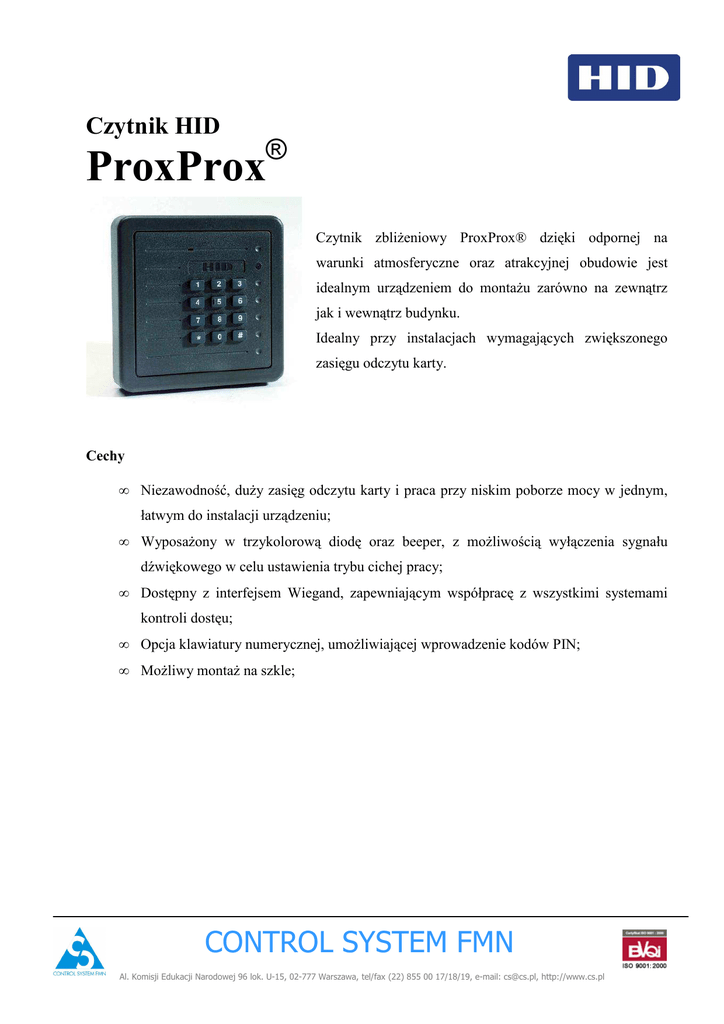 Czytnik HID ProxProx ® Czytnik zbliŜeniowy ProxProx® dzięki odpornej na warunki atmosferyczne oraz atrakcyjnej obudowie jest idealnym urządzeniem do montaŜu zarówno na zewnątrz jak i wewnątrz budynku. Idealny przy instalacjach wymagających zwiększonego zasięgu odczytu karty. Cechy • Niezawodność, duŜy zasięg odczytu karty i praca przy niskim poborze mocy w jednym, łatwym do instalacji urządzeniu; • WyposaŜony w trzykolorową diodę oraz beeper, z moŜliwością wyłączenia sygnału dźwiękowego w celu ustawienia trybu cichej pracy; • Dostępny z interfejsem Wiegand, zapewniającym współpracę z wszystkimi systemami kontroli dostęu; • Opcja klawiatury numerycznej, umoŜliwiającej wprowadzenie kodów PIN; • MoŜliwy montaŜ na szkle; CONTROL SYSTEM FMN Al. Komisji Edukacji Narodowej 96 lok. U-15, 02-777 Warszawa, tel/fax (22) 855 00 17/18/19, e-mail: [email protected], http://www.cs.pl Charakterystyka Specyfikacja techniczna MontaŜ Przystosowany do montaŜu na metalowym podłoŜu z niewielkim ubytkiem dla deklarowanej długości odczytu. Maksymalny zasięg odczytu ProxCard II – do 20cm (8”) ISOProx II – do 17.5cm (7”) DuoProx II – do 17.5cm (7”) Smart ISOProx/DuoProx II – do 17.5cm (7”) Proximity & MIFARE – do 17.5cm (7”) ProxCard Plus – do 7.5cm (3”) ProxKey II – do 7.5cm (3”) MicroProx Tag – do 10.2cm (4”) Sygnalizacja Podczas odczytu czerwona dioda zmienia się na zielono i pulsuje. Dioda i sygnał dźwiękowy mogą być równieŜ indywidualnie kontrolowane przez system. Wymiary 12.7 x 12.7 x 2.54cm Diagnostyka Po podłączeniu czytnika wewnętrzny program weryfikuje konfigurację czytnika, decyduje o ustawieniu wewnętrznego lub zewnętrznego sposobu sterowania diodą i beeper’em oraz inicjuje operację odczytu. Dodatkowy test zewnętrzny weryfikuje stany wejścia i wyjścia. Zasilanie 10 – 28.5V DC (zalecane liniowe źródło zasilania) Obudowa Mocna, odporna na warunki atmosferyczne obudowa z poliwęglanu. Prąd wymagany Średni: 100mA przy 12V DC Szczyt: 120mA przy 24V DC Interfejs Współpracuje ze wszystkimi systemami kontroli dostępu korzystającymi z protokołu Wiegand. Dostępne interfejsy: Wiegand, Clock & Data, oraz opcjonalnie RS-232, RS-422. Temperatura pracy -30OC – 65OC Bezpieczeństwo Wewnętrzny przełącznik antysabotaŜowy w standardzie. Odczytuje karty w formacie do 85 bitów. Rozpoznaje ponad 137 miliardów unikalnych kodów. Masa: 336 g ∗Z wyjątkiem modelu 5352 akceptującego format 37 bitowy Opcja klawiatury Opcjonalna wersja czytnika z wodoodporną klawiaturą dla zwiększenia bezpieczeństwa przy pomocy kodów PIN. Typy modeli 5355 interfejs Wiegand/Clock & Data (podlegają konfiguracji) Opis: interfejs Wiegand, 3-stanowa dioda, wewnętrzny beeper Opcje: - kolor: szary, beŜowy - klawiatura - naklejka na Ŝyczenie 5455AGM00 – zestaw do montaŜu na szkle 5352 Serial interfejs szeregowy Materiał Poliwęglan UL 94 Wilgotność względna pracy 0-95 % bez kondensacji Certyfikaty UL294, FCC, CE, R&TTE (EN 300 330-SRD, ETS 300 6 83-EMC, EN60950), IEC60950 Długość kabla Interfejs Wiegand lub Clock & Data: 152m Interfejs RS-232: 15m Interfejs RS-422: 1219m Zalecany kabel to 22 AWG pięcioŜyłowy ekranowany lub równorzędny, ALPHA 6212C skrętka 2-parowa, ALPHA 1292C dwuŜyłowy ekranowany lub równorzędny CONTROL SYSTEM FMN Al. Komisji Edukacji Narodowej 96 lok. U-15, 02-777 Warszawa, tel/fax (22) 855 00 17/18/19, e-mail: [email protected], http://www.cs.pl
