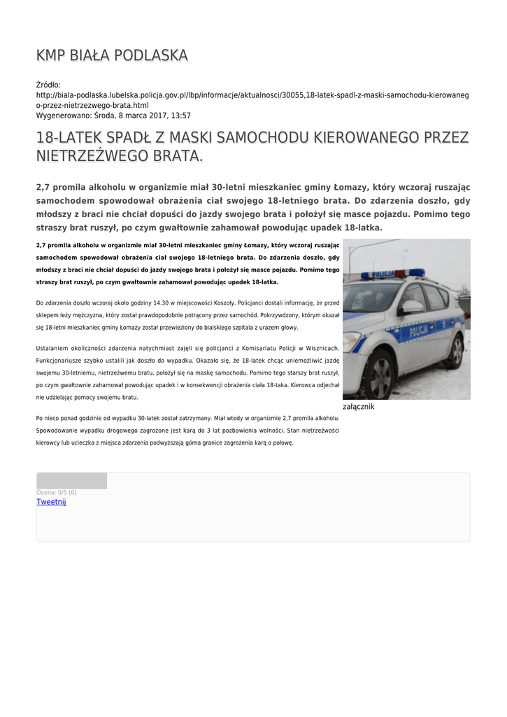 KMP BIAŁA PODLASKA Źródło: http://biala-podlaska.lubelska.policja.gov.pl/lbp/informacje/aktualnosci/30055,18-latek-spadl-z-maski-samochodu-kierowaneg o-przez-nietrzezwego-brata.html Wygenerowano: Środa, 8 marca 2017, 13:57 18-LATEK SPADŁ Z MASKI SAMOCHODU KIEROWANEGO PRZEZ NIETRZEŹWEGO BRATA. 2,7 promila alkoholu w organizmie miał 30-letni mieszkaniec gminy Łomazy, który wczoraj ruszając samochodem spowodował obrażenia ciał swojego 18-letniego brata. Do zdarzenia doszło, gdy młodszy z braci nie chciał dopuści do jazdy swojego brata i położył się masce pojazdu. Pomimo tego straszy brat ruszył, po czym gwałtownie zahamował powodując upadek 18-latka. 2,7 promila alkoholu w organizmie miał 30-letni mieszkaniec gminy Łomazy, który wczoraj ruszając samochodem spowodował obrażenia ciał swojego 18-letniego brata. Do zdarzenia doszło, gdy młodszy z braci nie chciał dopuści do jazdy swojego brata i położył się masce pojazdu. Pomimo tego straszy brat ruszył, po czym gwałtownie zahamował powodując upadek 18-latka. Do zdarzenia doszło wczoraj około godziny 14.30 w miejscowości Koszoły. Policjanci dostali informację, że przed sklepem leży mężczyzna, który został prawdopodobnie potrącony przez samochód. Pokrzywdzony, którym okazał się 18-letni mieszkaniec gminy Łomazy został przewieziony do bialskiego szpitala z urazem głowy. Ustalaniem okoliczności zdarzenia natychmiast zajęli się policjanci z Komisariatu Policji w Wisznicach. Funkcjonariusze szybko ustalili jak doszło do wypadku. Okazało się, że 18-latek chcąc uniemożliwić jazdę swojemu 30-letniemu, nietrzeźwemu bratu, położył się na maskę samochodu. Pomimo tego starszy brat ruszył, po czym gwałtownie zahamował powodując upadek i w konsekwencji obrażenia ciała 18-taka. Kierowca odjechał nie udzielając pomocy swojemu bratu. załącznik Po nieco ponad godzinie od wypadku 30-latek został zatrzymany. Miał wtedy w organizmie 2,7 promila alkoholu. Spowodowanie wypadku drogowego zagrożone jest karą do 3 lat pozbawienia wolności. Stan nietrzeźwości kierowcy lub ucieczka z miejsca zdarzenia podwyższają górna granice zagrożenia karą o połowę. Ocena: 0/5 (0) Tweetnij
