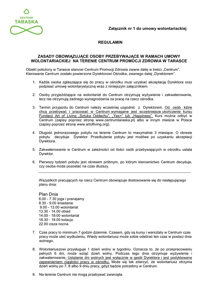 Załącznik nr 1 do umowy wolontariackiej REGULAMIN ZASADY OBOWIĄZUJĄCE OSOBY PRZEBYWAJĄCE W RAMACH UMOWY WOLONTARIACKIEJ NA TERENIE CENTRUM PROMOCJI ZDROWIA W TARASCE Obiekt położony w Tarasce stanowi Centrum Promocji Zdrowia zwane dalej w treści „Centrum”. Kierowanie Centrum zostało powierzone Dyrektorowi Ośrodka, zwanego dalej „Dyrektorem”. 1. Każda osoba zgłaszająca się do pracy w ośrodku musi uzyskać akceptację Dyrektora oraz podpisać umowę wolontarystyczną wraz z niniejszym załącznikiem. 2. Osoby przyjeżdżające na wolontariat do Centrum otrzymują wyżywienie i zakwaterowanie, lecz nie otrzymują żadnego wynagrodzenia za pracę na rzecz ośrodka. 3. Termin przyjazdu do Centrum należy wcześniej uzgodnić z Dyrektorem. Od osób które chcą przebywać i pracować w Centrum wymagane jest wcześniejsze ukończenie kursu Fundacji Art of Living „Sztuka Oddechu”, „Yes+” lub „Happiness”. Kurs można odbyć w Centrum (zapisy poprzez stronę www.centrumtaraska.pl) albo w innym mieście w Polsce (zapisy poprzez stronę www.artofliving.org). 4. Długość jednorazowego pobytu na terenie Centrum to maxymalnie 3 miesiące. O okresie pobytu decyduje Dyrektor. Przedłużenie pobytu jest możliwe po uzyskaniu akceptacji Dyrektora. 5. Zakwaterowanie w Centrum w zależności od ilości osób przebywających w ośrodku ustala Dyrektor. 6. Pierwszy tydzień pobytu jest okresem próbnym, po którym kierownictwo Centrum decyduje, czy osoba może pozostać na czas dłuższy. Wszystkich pracujących na rzecz Centrum obowiązuje dostosowanie się do następującego planu dnia: Plan Dnia 6.00 - 7.30 joga i pranajamy 8.30 - 9.00 śniadanie 9.00 - 13.00 wolontariat 13.30 - 14.00 obiad 14.00 - 18:00 wolontariat 18.30 - 19.00 kolacja 22.00 cisza nocna 7. Czas pracy to minimum 7 godzin dziennie. Czasem, gdy są kursy i warsztaty w Centrum czas pracy może uleć wydłużeniu. Wtedy wolontariusz może sobie odebrać ten czas w postaci dnia wolnego. 8. Wolontariuszowi przysługuje 1 dzień wolny w tygodniu. Oznacza to, że po przepracowaniu pełnych 6 dni, może wziąć dzień wolny. Podczas tego dnia otrzymuje wyżywienie i zakwaterowanie. Ustalanie dni wolnych jest wyłącznie w gestii Dyrektora i jest podyktowane zapewnieniem ciągłości pracy w ośrodku. Może się tak zdarzyć, że wolontariusz otrzyma dzień wolny po 7, 8 albo 9 dniu pracy, gdyż będzie potrzebny w Centrum. 9. Na terenie Centrum nie mogą przebywać zwierzęta. 10. Pracę przydziela i nadzoruje Dyrektor lub osoba odpowiedzialna za wykonanie pracy. Nie dopuszcza się wykonywania prac nie uzgodnionych. 11. Wszyscy pracujący mają obowiązek dbać o powierzony im sprzęt i narzędzia pracy. Za zniszczony sprzęt z własnej winy ponoszą odpowiedzialność materialną. 12. Wszystkie osoby przebywające na terenie Centrum mają obowiązek dbania o czystość w zajmowanych pokojach i na stanowiskach pracy oraz w całym ośrodku i na całym przyległym terenie. 13. Na terenie Ośrodka spożywa się wyłącznie pożywienie wegetariańskie. 14. Istnieje bezwzględny zakaz spożywania alkoholu, palenia papierosów, używania narkotyków i innych środków odurzających. Osoby pod wpływem alkoholu i środków odurzających nie mają wstępu na teren Centrum. 15. Na terenie kuchni mogą przebywać jedynie osoby przydzielone do jej obsługi. Jedynie te osoby upoważnione są do przygotowywania oraz wydawania żywności. Osoby przydzielone do pracy w kuchni zobowiązane są do bezwzględnego przestrzegania jej regulaminu. Osoby takie muszą posiadać aktualne książeczki zdrowia wymagane do pracy w kuchni i pełnienia funkcji związanych z przygotowywaniem pożywienia. 16. Jeden dzień w tygodniu jest wolny od pracy. Jest on ustalony przez Dyrektora. Może to być dzień indywidualnie dobrany dla danej osoby. Poza tym dniem wyjazd z terenu Centrum musi być uzgodniony z Dyrektorem. 17. Osoby które uzyskały zgodę na przebywanie na terenie Centrum a nie przestrzegają w/w zasad tracą prawo przebywania na jego terenie. 18. Osoba przebywająca na terenie Centrum ponosi materialną odpowiedzialność za uszkodzone lub zniszczone mienie Centrum. OŚWIADCZENIE Oświadczam że zapoznałem/am się z zasadami obowiązującymi na terenie Centrum Promocji Zdrowia w Tarasce oraz że je akceptuję i zobowiązuję się do ich przestrzegania. .............................. data ............................................................................................ czytelny podpis Centrum Promocji Zdrowia Taraska 19A, 26-337 Aleksandrów (woj. łódzkie) tel. (+44) 756 90 18, tel. kom. (+48) 509 861 666 e-mail: [email protected] www.centrumtaraska.pl