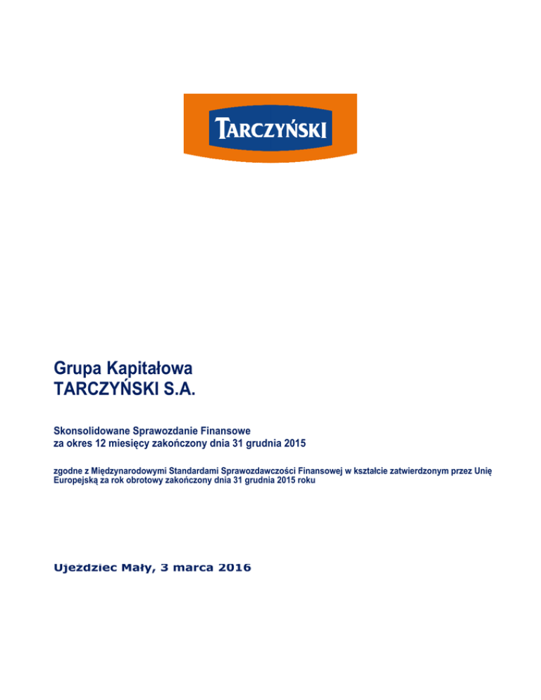 Grupa Kapitałowa TARCZYŃSKI S.A. Skonsolidowane Sprawozdanie Finansowe za okres 12 miesięcy zakończony dnia 31 grudnia 2015 zgodne z Międzynarodowymi Standardami Sprawozdawczości Finansowej w kształcie zatwierdzonym przez Unię Europejską za rok obrotowy zakończony dnia 31 grudnia 2015 roku Ujeździec Mały, 3 marca 2016 GRUPA KAPITAŁOWA TARCZYŃSKI S.A. skonsolidowane sprawozdanie finansowe za okres 12 miesięcy zakończony dnia 31 grudnia 2015 roku SKONSOLIDOWANY RACHUNEK ZYSKÓW I STRAT ORAZ POZOSTAŁYCH CAŁKOWITYCH DOCHODÓW ..................................................................................................................................................4 SKONSOLIDOWANE SPRAWOZDANIE Z SYTUACJI FINANSOWEJ .......................................................................................................................................................................................................5 SKONSOLIDOWANE SPRAWOZDANIE Z PRZEPŁYWÓW PIENIĘŻNYCH ................................................................................................................................................................................................7 SKONSOLIDOWANE SPRAWOZDANIE ZE ZMIAN W KAPITALE WŁASNYM ............................................................................................................................................................................................9 NOTY OBJAŚNIAJĄCE DO SKONSOLIDOWANEGO SPRAWOZDANIA FINANSOWEGO SPORZĄDZONEGO NA DZIEŃ 31 GRUDNIA 2015 ROKU ...........................................................................................11 1. Informacje ogólne ......................................................................................................................................................................................................................................................11 2. Opis Grupy Kapitałowej TARCZYŃSKI S.A. ............................................................................................................................................................................................................11 3. Skład Zarządu i Rady Nadzorczej jednostki dominującej ........................................................................................................................................................................................11 4. Zatwierdzenie sprawozdania finansowego ...............................................................................................................................................................................................................12 5. Podstawa sporządzenia skonsolidowanego sprawozdania finansowego ...............................................................................................................................................................12 5.1. Oświadczenie o zgodności..........................................................................................................................................................................................................................................12 5.2. Nowe standardy i interpretacje ...................................................................................................................................................................................................................................12 6. 7. 8. Waluta pomiaru i waluta sprawozdań finansowych....................................................................................................................................................................................................16 Informacje dotyczące segmentów działalności.........................................................................................................................................................................................................16 Stosowane istotne zasady rachunkowości ...............................................................................................................................................................................................................16 8.1. Kontynuacja działalności .............................................................................................................................................................................................................................................16 8.2. Podstawa sporządzenia ..............................................................................................................................................................................................................................................16 9. Istotne wartości oparte na profesjonalnym osądzie i szacunkach ...........................................................................................................................................................................30 9.1. Profesjonalny osąd ....................................................................................................................................................................................................................................................30 9.2. Niepewność szacunków ............................................................................................................................................................................................................................................31 10. Zmiana szacunków ....................................................................................................................................................................................................................................................31 11. Korekta błędów poprzednich okresów ................................................................................................................................................................................