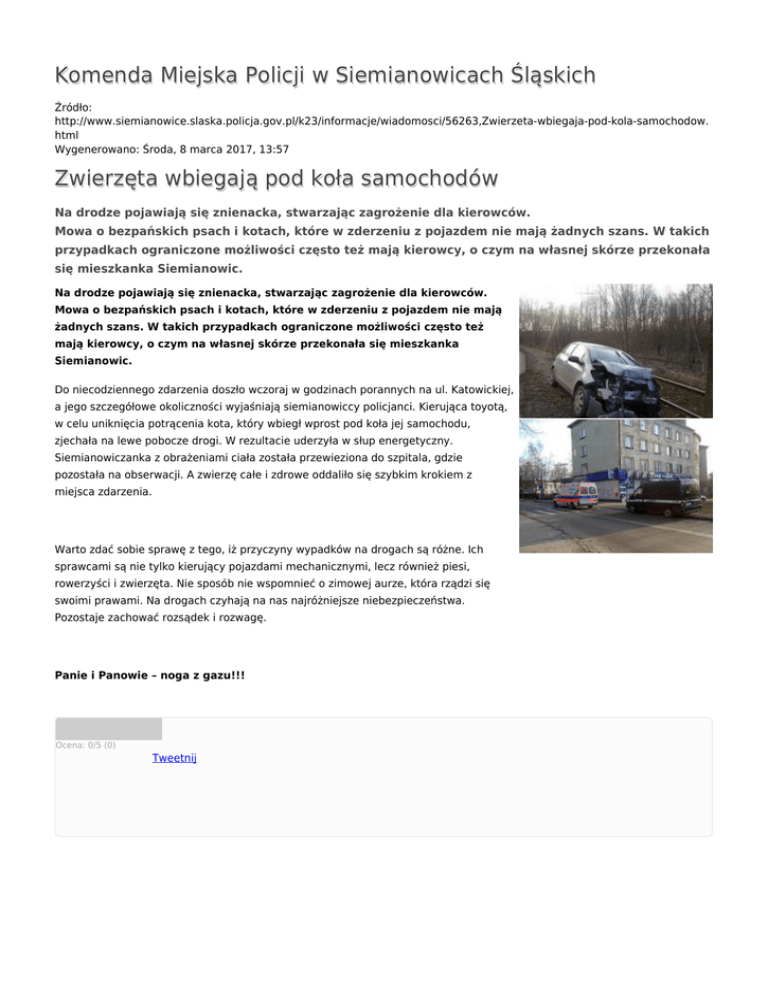 Komenda Miejska Policji w Siemianowicach Śląskich Źródło: http://www.siemianowice.slaska.policja.gov.pl/k23/informacje/wiadomosci/56263,Zwierzeta-wbiegaja-pod-kola-samochodow. html Wygenerowano: Środa, 8 marca 2017, 13:57 Zwierzęta wbiegają pod koła samochodów Na drodze pojawiają się znienacka, stwarzając zagrożenie dla kierowców. Mowa o bezpańskich psach i kotach, które w zderzeniu z pojazdem nie mają żadnych szans. W takich przypadkach ograniczone możliwości często też mają kierowcy, o czym na własnej skórze przekonała się mieszkanka Siemianowic. Na drodze pojawiają się znienacka, stwarzając zagrożenie dla kierowców. Mowa o bezpańskich psach i kotach, które w zderzeniu z pojazdem nie mają żadnych szans. W takich przypadkach ograniczone możliwości często też mają kierowcy, o czym na własnej skórze przekonała się mieszkanka Siemianowic. Do niecodziennego zdarzenia doszło wczoraj w godzinach porannych na ul. Katowickiej, a jego szczegółowe okoliczności wyjaśniają siemianowiccy policjanci. Kierująca toyotą, w celu uniknięcia potrącenia kota, który wbiegł wprost pod koła jej samochodu, zjechała na lewe pobocze drogi. W rezultacie uderzyła w słup energetyczny. Siemianowiczanka z obrażeniami ciała została przewieziona do szpitala, gdzie pozostała na obserwacji. A zwierzę całe i zdrowe oddaliło się szybkim krokiem z miejsca zdarzenia. Warto zdać sobie sprawę z tego, iż przyczyny wypadków na drogach są różne. Ich sprawcami są nie tylko kierujący pojazdami mechanicznymi, lecz również piesi, rowerzyści i zwierzęta. Nie sposób nie wspomnieć o zimowej aurze, która rządzi się swoimi prawami. Na drogach czyhają na nas najróżniejsze niebezpieczeństwa. Pozostaje zachować rozsądek i rozwagę. Panie i Panowie – noga z gazu!!! Ocena: 0/5 (0) Tweetnij