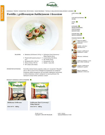 BONDUELLE / PRZEPIS / BANKIETOWE, PRZYSTAWKA / WEGETARIAŃSKIE / TORTILLA Z GRILLOWANYM BAKŁAŻANEM I ŁOSOSIEM Tortilla z grillowanym bakłażanem i łososiem ILOŚĆ PORCJI 1 CZAS PRZYGOTOWANIA 20 MIN OCENA brak KATEGORIE WEGETARIAŃSKIE PRZYSTAWKA BANKIETOWE DODANE PRZEZ MACIEJ WOŹNIAK PODOBNE PRZEPISY Kolorowa sałatka z grillowanych warzyw i makaronu Tortilla z wołowiną i pikantnym leczo Lasagne z grillowanych bakłażanów i cukinii SKŁADNIKI: Bakłażany Grillowane (100 g) Placek tortilli pszenny duży (1 szt.) Śmietanka 30% (100 ml) Oliwa ziołowa (100 ml) Sól i pieprz (do smaku) SPOSÓB PRZYGOTOWANIA: Grillowany Duet Czerwonej i Żółtej Papryki (20 g) Łosoś świeży filet (60 g) Ser chedar (20 g) Szczypiorek (10 g) Sałata (1 duży liść) MASA NETTO: 1000 g Na tortillę nałożyć łososia, paprykę, sałatę, ser i przyprawić. Wszystko piec w 180 st. przez 8 minut. Następnie przygotować sos: podgrzać śmietankę, dodać szczypiorek, sól oraz pieprz. Bakłażana marynować w oliwie smakowej z ziołami i podgrzać na ruszcie grillowym. Na bakłażanie ułożyć tortillę i podawać z sosem. Grillowany Duet Czerwonej i Żółtej Papryki MASA NETTO: Grillowany bakłażan z serem feta w oliwie czosnkowej Lasagne z grillowanych bakłażanów i grzybów PRODUKTY BONDUELLE UŻYTE W PRZEPISIE Bakłażany Grillowane Mini tarty z bakłażana 1000 g All rights reserved projekt i realizacja Copyright © 2012-2015 Bonduelle Agencja Reklamowa 4 ALL Ragoět z bakłażanów podawane w vol au vent