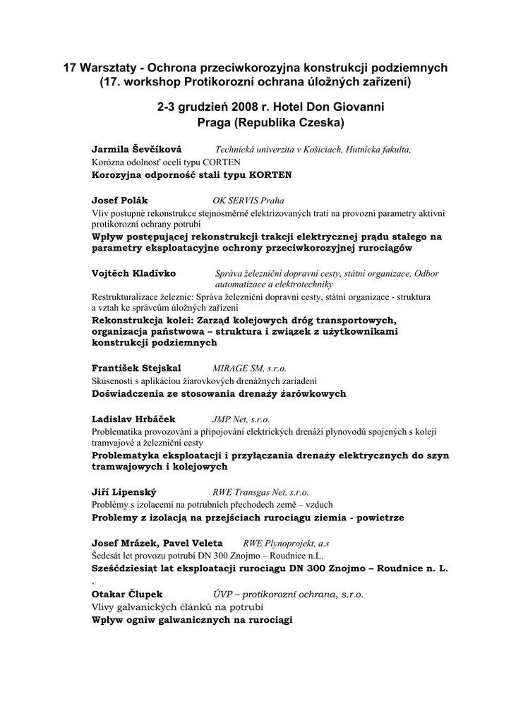 17 Warsztaty - Ochrona przeciwkorozyjna konstrukcji podziemnych (17. workshop Protikorozní ochrana úložných zařízení) 2-3 grudzień 2008 r. Hotel Don Giovanni Praga (Republika Czeska) Jarmila Ševčíková Technická univerzita v Košiciach, Hutnícka fakulta, Korózna odolnosť ocelí typu CORTEN Korozyjna odporność stali typu KORTEN Josef Polák OK SERVIS Praha Vliv postupné rekonstrukce stejnosměrně elektrizovaných tratí na provozní parametry aktivní protikorozní ochrany potrubí Wpływ postępującej rekonstrukcji trakcji elektrycznej prądu stałego na parametry eksploatacyjne ochrony przeciwkorozyjnej rurociągów Vojtěch Kladívko Správa železniční dopravní cesty, státní organizace, Odbor automatizace a elektrotechniky Restrukturalizace železnic: Správa železniční dopravní cesty, státní organizace - struktura a vztah ke správcům úložných zařízení Rekonstrukcja kolei: Zarząd kolejowych dróg transportowych, organizacja państwowa – struktura i związek z użytkownikami konstrukcji podziemnych František Stejskal MIRAGE SM, s.r.o. Skúsenosti s aplikáciou žiarovkových drenážnych zariadení Doświadczenia ze stosowania drenaży żarówkowych Ladislav Hrbáček JMP Net, s.r.o. Problematika provozování a připojování elektrických drenáží plynovodů spojených s kolejí tramvajové a železniční cesty Problematyka eksploatacji i przyłączania drenaży elektrycznych do szyn tramwajowych i kolejowych Jiří Lipenský RWE Transgas Net, s.r.o. Problémy s izolacemi na potrubních přechodech země – vzduch Problemy z izolacją na przejściach rurociągu ziemia - powietrze Josef Mrázek, Pavel Veleta RWE Plynoprojekt, a.s Šedesát let provozu potrubí DN 300 Znojmo – Roudnice n.L. Sześćdziesiąt lat eksploatacji rurociągu DN 300 Znojmo – Roudnice n. L. . Otakar Člupek ÚVP – protikorozní ochrana, s.r.o. Vlivy galvanických článků na potrubí Wpływ ogniw galwanicznych na rurociągi Jozef Králik GasOil engineering, a.s. František Stejskal konzultant CP a LPS GasOil engineering, a.s. Aplikácia spriahnutej flexibilnej anódy v areáloch kompresorových staníc Zastosowanie rozciągniętej giętkiej anody w rejonie stacji kompresorowych Pierre France, Sylvain Fontaine, Serge Jacobs, Bernard Masson GRTgaz / CTE Ověřovací zkoušky měřicích přístrojů, které přímo udávají vypínací potenciál Eoff kupónu Walidacyjne badania przyrządów pomiarowych, które wprost mierzą potencjał wyłączeniowy Eoff elektrody symulującej Jan Matouš SŽDC s.o., Technická ústředna dopravní cesty Zpětná trakční cesta na DC elektrizovaných tratích jako možný zdroj korozního ohrožení Obwody powrotne elektrycznej trakcji prądu stałego jako potencjalne źródło zagrożenia korozyjnego Bohumil Kučera JEKU s.r.o. Katodická ochrana proti účinkům bludných proudů na mostních konstrukcích v ČR Ochrona katodowa przed działaniem prądów błądzących na konstrukcjach mostowych w republice Czeskiej Svatopluk Dorda, František Míčko KPTECH, s.r.o. Katodická ochrana ocelových nádrží uložených v zemi Ochrona katodowa stalowych zbiorników posadowionych w ziemi Vít Toman, Ivo Hejl Tele Data Kontrol, spol. s r.o. Inovace ovládacího panelu ZKAO Modernizacja panelu sterującego SOK Ladislav Tomlein AETRON s.r.o. Ochrana areálov proti účinkom priameho úderu blesku s eliminovanou možnosťou indukcie zo zvodových vedení Ochrona areałów przed skutkami bezpośredniego wyładowania atmosferycznego z eliminowaniem możliwości indukcji w zwodach Rainer Kuprion TIB CHEMICALS AG Rudolf Košťál AREKO, s.r.o. Nové rýchloschnúce protikorózne materiály - vývoj a aplikácia Nowe szybkoschnące materiały przeciwkorozyjne – rozwój i zastosowanie Vlastimil Vrátný DeHoR – elspec. Litvínov s.r.o. Zdroj katodické ochrany s GSM Źródło ochrony katodowej z GSM