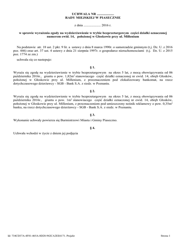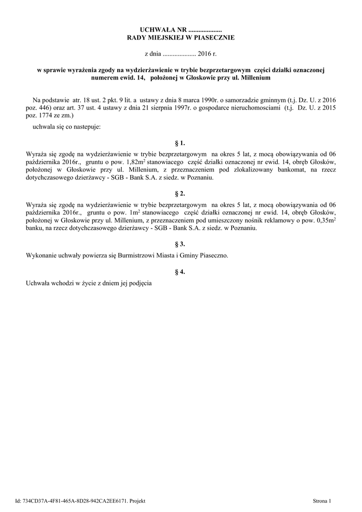 UCHWAŁA NR .................... RADY MIEJSKIEJ W PIASECZNIE z dnia .................... 2016 r. w sprawie wyrażenia zgody na wydzierżawienie w trybie bezprzetargowym części działki oznaczonej numerem ewid. 14, położonej w Głoskowie przy ul. Millenium Na podstawie atr. 18 ust. 2 pkt. 9 lit. a ustawy z dnia 8 marca 1990r. o samorzadzie gminnym (t.j. Dz. U. z 2016 poz. 446) oraz art. 37 ust. 4 ustawy z dnia 21 sierpnia 1997r. o gospodarce nieruchomosciami (t.j. Dz. U. z 2015 poz. 1774 ze zm.) uchwala się co nastepuje: § 1. Wyraża się zgodę na wydzierżawienie w trybie bezprzetargowym na okres 5 lat, z mocą obowiązywania od 06 października 2016r., gruntu o pow. 1,82m2 stanowiacego część działki oznaczonej nr ewid. 14, obręb Głosków, położonej w Głoskowie przy ul. Millenium, z przeznaczeniem pod zlokalizowany bankomat, na rzecz dotychczasowego dzierżawcy - SGB - Bank S.A. z siedz. w Poznaniu. § 2. Wyraża się zgodę na wydzierżawienie w trybie bezprzetargowym na okres 5 lat, z mocą obowiązywania od 06 października 2016r., gruntu o pow. 1m2 stanowiacego część działki oznaczonej nr ewid. 14, obręb Głosków, położonej w Głoskowie przy ul. Millenium, z przeznaczeniem pod umieszczony nośnik reklamowy o pow. 0,35m2 banku, na rzecz dotychczasowego dzierżawcy - SGB - Bank S.A. z siedz. w Poznaniu. § 3. Wykonanie uchwały powierza się Burmistrzowi Miasta i Gminy Piaseczno. § 4. Uchwała wchodzi w życie z dniem jej podjęcia Id: 734CD37A-4F81-465A-8D28-942CA2EE6171. Projekt Strona 1 Uzasadnienie Część terenu działki nr 14 położonej w Głoskowie przy ul. Millenium ( teren ogrodzenia szkoły) była wydzierżawiana bankowi SGB-Bank S.A. z siedz. w Poznaniu pod bankomat oraz pod nośnik reklamowy banku na podstawie umów dzierżaw od 06.10.2008r. do 05.10.2016r. . Na umieszczenie bankomatu i tablicy informacyjno-reklamowej dyrekcja Szkoły Podstawowej w Głoskowie wyraziła zgodę. Pierwotnie umowy dzierżawy zawarte były z Bankiem Spółdzielczym w Lesznowoli, który zgodnie z Decyzją Komisji Nadzoru Finansowego z dn. 2015.06.02 został przejęty przez SGB-Bank S.A. z siedz. w Poznaniu. Za posadowiony bankomat pobierany był czynsz dzierżawny w wysokości umownej 150,00zł miesięcznie netto plus podatek Vat , natomiast za nośnik reklamowy w wysokości zgodnej z obowiązującymi uchwałami: nr 414/XV/2015 z dn. 16.12.2015r. Rady Miejskiej w Piasecznie za grunt w wys. 170,95zł/m2 /rok + Vat oraz za powierzchnię nośnika reklamowego w wys. 514,58zł/m2 /rok + Vat. W miejscowym planie zagospodarowania przestrzennego wsi Głosków zatwierdzonym uchwaą Nr 765/XXVII/2008 Rady Miejskiej w Piaseczniez dnia 15 października 2008r. teren działki nr 14 pod usługi oświaty, na planie rysunku oznaczony literami 1.UO. Burmistrz na wniosek dzierżawcy o przedłużenie umów dzierżaw proponuje zawarcie umów dzierżaw w trybie bezprzetargowym na okres 5 lat, z mocą obowiązywania od 06 października 2016r., części pow. 1,82m2 działki nr 14 z przeznaczeniem pod zlokalizowany na tej działce bankomat oraz części pow. 1m2 w/wym. działki pod nośnik reklamowy ( tablicy z napisem "Bankomat24h") o pow. 0,35m2, położonych w Głoskowie przy ul. Millenium, na rzecz dzierżawcy SGB-Bank S.A. w Poznaniu, jako kontynuację poprzednich umów dzierżaw. Aby umowy dzierżawy mogły być zawarte w trybie bezprzetargowym na czas dłuższy niż 3 lata - to zgodnie z art. 37 ust. 4 ustawy o gospodarce nieruchomościami wymagana jest zgoda Rady Miejskiej w formie stosownej uchwały. Id: 734CD37A-4F81-465A-8D28-942CA2EE6171. Projekt Strona 2