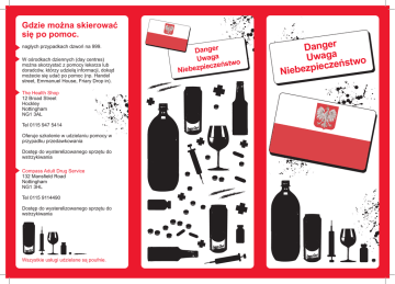 Gdzie można skierować się po pomoc. nagłych przypadkach dzwoń na 999. W ośrodkach dziennych (day centres) można skorzystać z pomocy lekarza lub doradców, którzy udzielą informacji, dokąd możecie się udać po pomoc (np. Handel street, Emmanuel House, Friary Drop in). The Health Shop 12 Broad Street Hockley Nottingham NG1 3AL Tel 0115 947 5414 Oferuje szkolenie w udzielaniu pomocy w przypadku przedawkowania Dostęp do wysterelizowanego sprzętu do wstrzykiwania Compass Adult Drug Service 132 Mansfield Road Nottingham NG1 3HL Tel 0115 9114490 Dostęp do wysterelizowanego sprzętu do wstrzykiwania Wszystkie usługi udzielane są poufnie. Danger Uwaga eństwo z c e i p z e Nieb Danger Uwaga two zeńs c e i p z e b Nie Narkotki mają różny wpływ na różnych ludzi. Jeśli będziesz mieszać alkohol, heroinę, methadone oraz niektóre lekarstwa, może to doprowadzić do twojej śmierci. Jeśli zażyjesz narkotyk (taki jak heroina), którego wcześniej nie używałeś lub dopiero co rozpocząłeś jego zażywanie, może to doprowadzić do twojej śmierci. Jeśli zażyjesz większej ilości narkotyku niż zażywasz normalnie, może to doprowadzić do twojej śmierci. Jeśli miałeś przerwę w zażywaniu narkotyków/alkoholu (np. jeśli byłeś w szpitalu lub więzieniu) i rozpoczniesz ich zażywanie ponownie, może to doprowadzić do twojej śmierci. Wstrzykiwanie heroiny jest niebezpieczne. Jeśli musisz jej zażywać, bezpieczniej jest ją palić. Jeżeli wstrzykujesz: Nigdy nie wymieniaj się z nikim sprzętem do wstrzykiwania (igłami, strzykawkami, wodą, łyżkami lub filtrami). Używanie tych samych przyrządów może doprowadzić do zarażenia chorobami takimi jak HIV i wirusowe zapalenie wątroby. Alkohol Jeśli myślisz, że alkohol ma ujemny wpływ na twoje zdrowie (masz wymioty, żółtą skórę) lub martwisz się o swoje zdrowie, zwróć się po poradę medyczną (np. sesje z lekarzem przy Handel street – sprawdź ostatnią stronę tej broszurki, po informacje o służbach, które mogą ci pomóc). Jeśli codziennie pijesz alkohol, twój organizm się do tego przyzwyczaja. Nagłe przerwanie picia alkoholu może okazać się dla ciebie niebezpieczne. Bezpieczniej jest pomału redukować ilość spożywanego codziennie alkoholu. Możesz skontakować się z osobami, które ci poradzą , jak to zrobić. Jeśli nagle przestaniesz pić alkohol, możesz doświadczyć następujacych symptomów: Zażywanie zbyt dużych dawek narkotyków lub spożywanie zbyt wiele alkoholu może doprowadzić do przedawkowania. Oznaki przedawkowania Nie można danej osoby dobudzić Utrata przytomności Sine usta Głośnie chrapanie Słaby puls Jeśli myślisz, że ktoś przedawkował: Połóż ich w bocznej pozycji ratunkowej Zadzwoń na 999 i wezwij karetkę Pocenie się Drgawki Poczucie niepokoju Halucynacje Jeśli doświadczysz takich reakcji – szukaj pomocy lekarza. Spożywanie alkoholu może wpłynąć na twoje samopoczucie i sprawić, że znajdziesz się w sytuacjach niebezpiecznych i i groźnych dla ciebie. Nigdy nie siadaj za kierownicę jeśi piłeś alkohol lub zażywałeś narkotyki. Policja nie będzie interweniować, o ile nie nastąpi zgon. W Health Shop możesz przejść szkolenie, jak ratować życie i udzielać pierwszej pomocy.