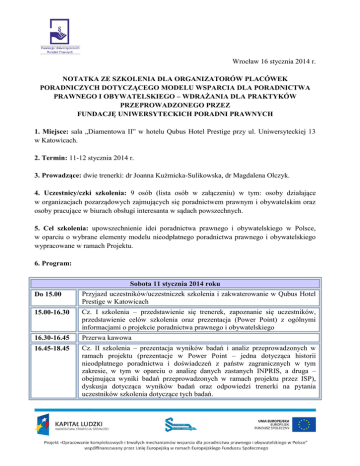 Wrocław 16 stycznia 2014 r. NOTATKA ZE SZKOLENIA DLA ORGANIZATORÓW PLACÓWEK PORADNICZYCH DOTYCZĄCEGO MODELU WSPARCIA DLA PORADNICTWA PRAWNEGO I OBYWATELSKIEGO – WDRAŻANIA DLA PRAKTYKÓW PRZEPROWADZONEGO PRZEZ FUNDACJĘ UNIWERSYTECKICH PORADNI PRAWNYCH 1. Miejsce: sala „Diamentowa II” w hotelu Qubus Hotel Prestige przy ul. Uniwersyteckiej 13 w Katowicach. 2. Termin: 11-12 stycznia 2014 r. 3. Prowadzące: dwie trenerki: dr Joanna Kuźmicka-Sulikowska, dr Magdalena Olczyk. 4. Uczestnicy/czki szkolenia: 9 osób (lista osób w załączeniu) w tym: osoby działające w organizacjach pozarządowych zajmujących się poradnictwem prawnym i obywatelskim oraz osoby pracujące w biurach obsługi interesanta w sądach powszechnych. 5. Cel szkolenia: upowszechnienie idei poradnictwa prawnego i obywatelskiego w Polsce, w oparciu o wybrane elementy modelu nieodpłatnego poradnictwa prawnego i obywatelskiego wypracowane w ramach Projektu. 6. Program: Sobota 11 stycznia 2014 roku Do 15.00 Przyjazd uczestników/uczestniczek szkolenia i zakwaterowanie w Qubus Hotel Prestige w Katowicach 15.00-16.30 Cz. I szkolenia – przedstawienie się trenerek, zapoznanie się uczestników, przedstawienie celów szkolenia oraz prezentacja (Power Point) z ogólnymi informacjami o projekcie poradnictwa prawnego i obywatelskiego 16.30-16.45 Przerwa kawowa 16.45-18.45 Cz. II szkolenia – prezentacja wyników badań i analiz przeprowadzonych w ramach projektu (prezentacje w Power Point – jedna dotycząca historii nieodpłatnego poradnictwa i doświadczeń z państw zagranicznych w tym zakresie, w tym w oparciu o analizę danych zastanych INPRIS, a druga – obejmująca wyniki badań przeprowadzonych w ramach projektu przez ISP), dyskusja dotycząca wyników badań oraz odpowiedzi trenerki na pytania uczestników szkolenia dotyczące tych badań. 19.00-20.00 Kolacja w restauracji Qubus Hotel Prestige Niedziela 12 stycznia 2014 roku 8.00 – 9.00 Śniadanie w Qubus Hotel Prestige 9.00 – 11.00 Cz. III szkolenia – Blok I Beneficjenci – tu m.in. prezentacja modelu w części dotyczącej beneficjentów (prezentacja Power Point), następnie „burza mózgów” – jak profil beneficjenta wpływa/powinien wpływać na organizację punktu poradniczego?; dyskusja. Blok II – Usługodawcy – prezentacja obejmująca odpowiednią część modelu, dyskusja. 11.00 – 11.15 przerwa kawowa 11.15 – 13.15 Cz. IV szkolenia – warunki konieczne do funkcjonowania punktu poradniczego w ramach proponowanego modelu, standardy działania punktów poradniczych; tu m.in. ćwiczenia interaktywne – praca w grupach na koncepcją czy spełniam/co muszę zrobić by się dostosować do poszczególnych standardów, opracowanie przez uczestników plakatów z wykorzystaniem wycinanek z prasy i prezentacja prac przez przedstawicieli poszczególnych grup; na tym tle dyskusja nad poszczególnymi standardami. 13.15 – 14.30 Obiad w restauracji Qubus Hotel Prestige 14.30 – 16.30 Cz. V szkolenia – tu przede wszystkim: analiza problematyki najczęstszych problemów spotykanych w trakcie prowadzenia punktów poradniczych, praca uczestników w grupach na podanych kazusach, następnie omówienie wyników tych prac przy komentarzach trenerki i pozostałych uczestników; prezentacja mapy poradnictwa i poradnika do niej, dyskusja na temat wagi rozpowszechniania informacji na temat punktów poradniczych. 16.30 – 18.00 Podsumowanie poszczególnych części szkolenia i jego całego, wypełnienie ankiet ewaluacyjnych przez uczestników, zakończenie szkolenia, pożegnanie. 7. Ważniejsze pytania, głosy w dyskusji, wnioski i rekomendacje: W trakcie szkolenia uczestnicy i uczestniczki podnieśli kilka istotnych kwestii, w tym: 1) Wskazali, że zweryfikowali mapę poradnictwa opracowaną w ramach projektu, usiłując nawiązać współpracę z wpisanymi na mapie instytucjami świadczącymi nieodpłatne poradnictwo na terenie województwa śląskiego i okazało się, że wiele z nich już nie działa. W związku z tym podkreślono, że niezbędne jest wdrożenie stałego systemu weryfikacji mapy przez administratora, tak by dane zawarte na stronie były cały czas aktualizowane, co jest konieczne, w tym by nie dochodziło do przypadków odsyłania beneficjenta do instytucji, której już nie ma. 2) Na gruncie spostrzeżeń poczynionych w związku z uwagą zawartą w punkcie pierwszym podkreślono, jak ważne jest zapewnienie instytucjom świadczącym nieodpłatne porady prawne i obywatelskie stałego i stabilnego źródła finansowania, tak, by nie dochodziło do takich sytuacji jak obecnie, gdzie instytucja działa tylko przez okres na jaki ma środki (np. czas trwania dofinansowania w ramach danego projektu unijnego), beneficjenci nabierają do niej zaufania, powierzają swoje sprawy, instytucja działa z widocznymi korzyściami dla społeczności lokalnej, po czym wraz z końcem środków – znika. 3) Stwierdzono, że bardzo dobrze się stało, że w ramach wypracowanego rekomendowanego modelu poradnictwa przewidziano też usługi dodatkowe w postaci zajęć edukacyjnych (np. dla młodzieży licealnej) obejmujących kwestie prawne i obywatelskie istotne dla danych grup społecznych, zwiększające poziom świadomości społecznej. Część przedstawicieli i przedstawicielek instytucji poradniczych obecnych na spotkaniu (ze Stowarzyszenia Na Rzecz Poradnictwa Obywatelskiego „Dogma” oraz Towarzystwa Miłośników Rudyłtów) stwierdziło, że organizowali już takie zajęcia dla uczniów na poziomie szkoły gimnazjalnej lub licealnej i cieszyły się one dużym zainteresowaniem, dostrzegalna jest potrzeba ich kontynuowania. 4) Wskazano na potrzebę większego doprecyzowania standardów, których dochować musiałyby instytucje chcące świadczyć usługi poradnicze w ramach proponowanego systemu, gdyż w wielu przypadkach ich opis jest zbyt ogólnikowy i uczestnikom i uczestniczkom szkolenia trudno ocenić, czy spełniliby dany warunek, cz