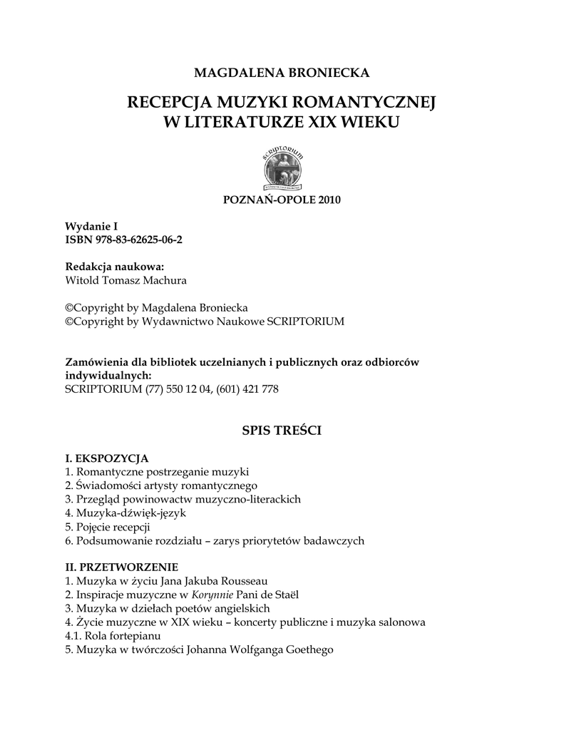 MAGDALENA BRONIECKA RECEPCJA MUZYKI ROMANTYCZNEJ W LITERATURZE XIX WIEKU POZNAŃ-OPOLE 2010 Wydanie I ISBN 978-83-62625-06-2 Redakcja naukowa: Witold Tomasz Machura ©Copyright by Magdalena Broniecka ©Copyright by Wydawnictwo Naukowe SCRIPTORIUM Zamówienia dla bibliotek uczelnianych i publicznych oraz odbiorców indywidualnych: SCRIPTORIUM (77) 550 12 04, (601) 421 778 SPIS TREŚCI I. EKSPOZYCJA 1. Romantyczne postrzeganie muzyki 2. Świadomości artysty romantycznego 3. Przegląd powinowactw muzyczno-literackich 4. Muzyka-dźwięk-język 5. Pojęcie recepcji 6. Podsumowanie rozdziału – zarys priorytetów badawczych II. PRZETWORZENIE 1. Muzyka w życiu Jana Jakuba Rousseau 2. Inspiracje muzyczne w Korynnie Pani de Staël 3. Muzyka w dziełach poetów angielskich 4. Życie muzyczne w XIX wieku – koncerty publiczne i muzyka salonowa 4.1. Rola fortepianu 5. Muzyka w twórczości Johanna Wolfganga Goethego 6. Muzyka w życiu i twórczości Henry Beyle Stendhala 7. Muzyka w Komedii Ludzkiej Honoriusza Balzaka 8. Balzakowskie nowele muzyczne: Sarrasine, Gambara, Massimilla Doni 9. Literacka recepcja wirtuoza 9.1. Franciszek Liszt w Beatrix i poezji okolicznościowej 9.2. Niccolo Paganini w Nocach Florenckich Henryka Heine 9.3. Skrzypce w literaturze 9.4. Dewaluacje muzyki i postawy antymuzyczne w literaturze 10. Motyw muzyki w literaturze polskiej – wykaz dzieł pisarzy rodzimych 11. Wstęp do recepcji Fryderyka Chopina w polskiej literaturze XIX wieku III. REPRYZA 1. Reminiscencje romantycznego postrzegania muzyki u Marcela Prousta 2. Podsumowanie Bibliografia